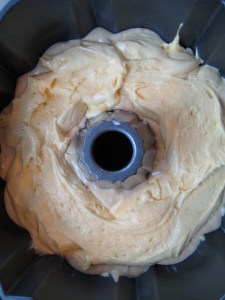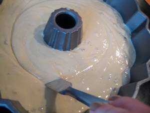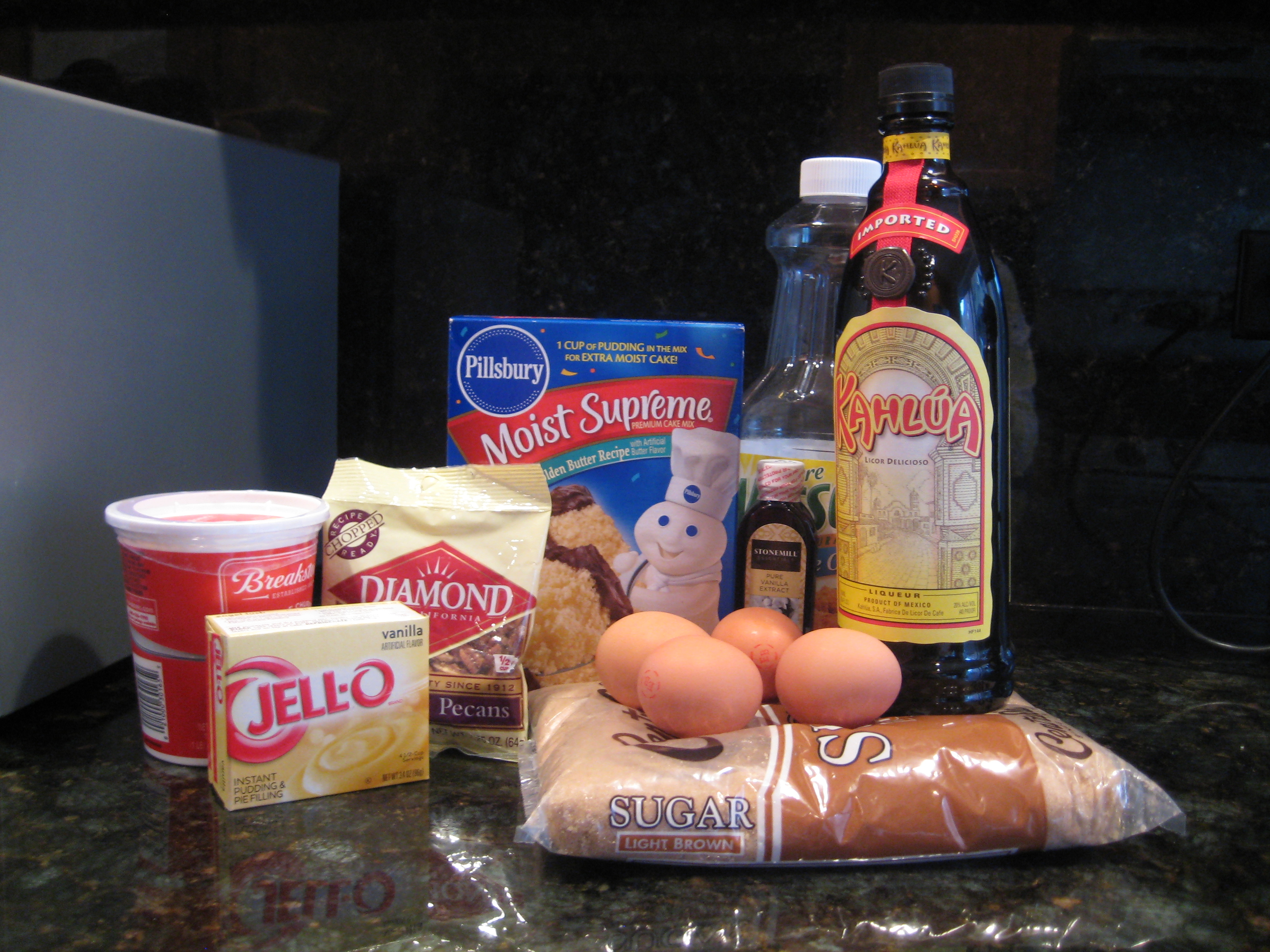 Divide batter in half. To one half, add brown sugar, Kahlua and pecans. Grease bundt pan.