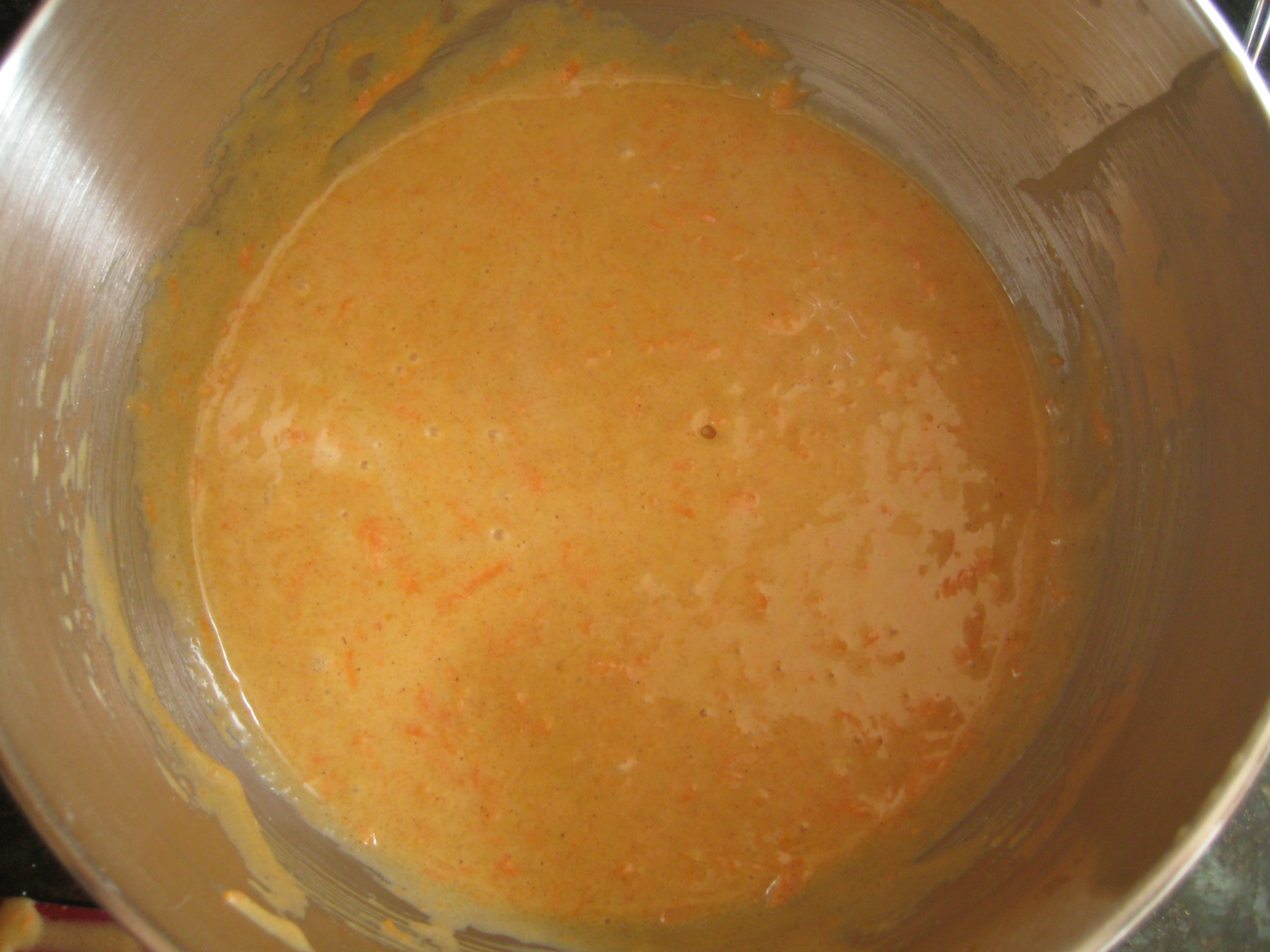 Then you are going to combine the sugar, oil and eggs together. (If you like, you may add pineapple. I don’t like chunks in my cake, so I stick to just carrots. If you add pineapple, do so here).