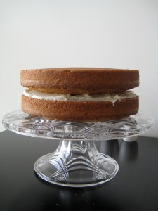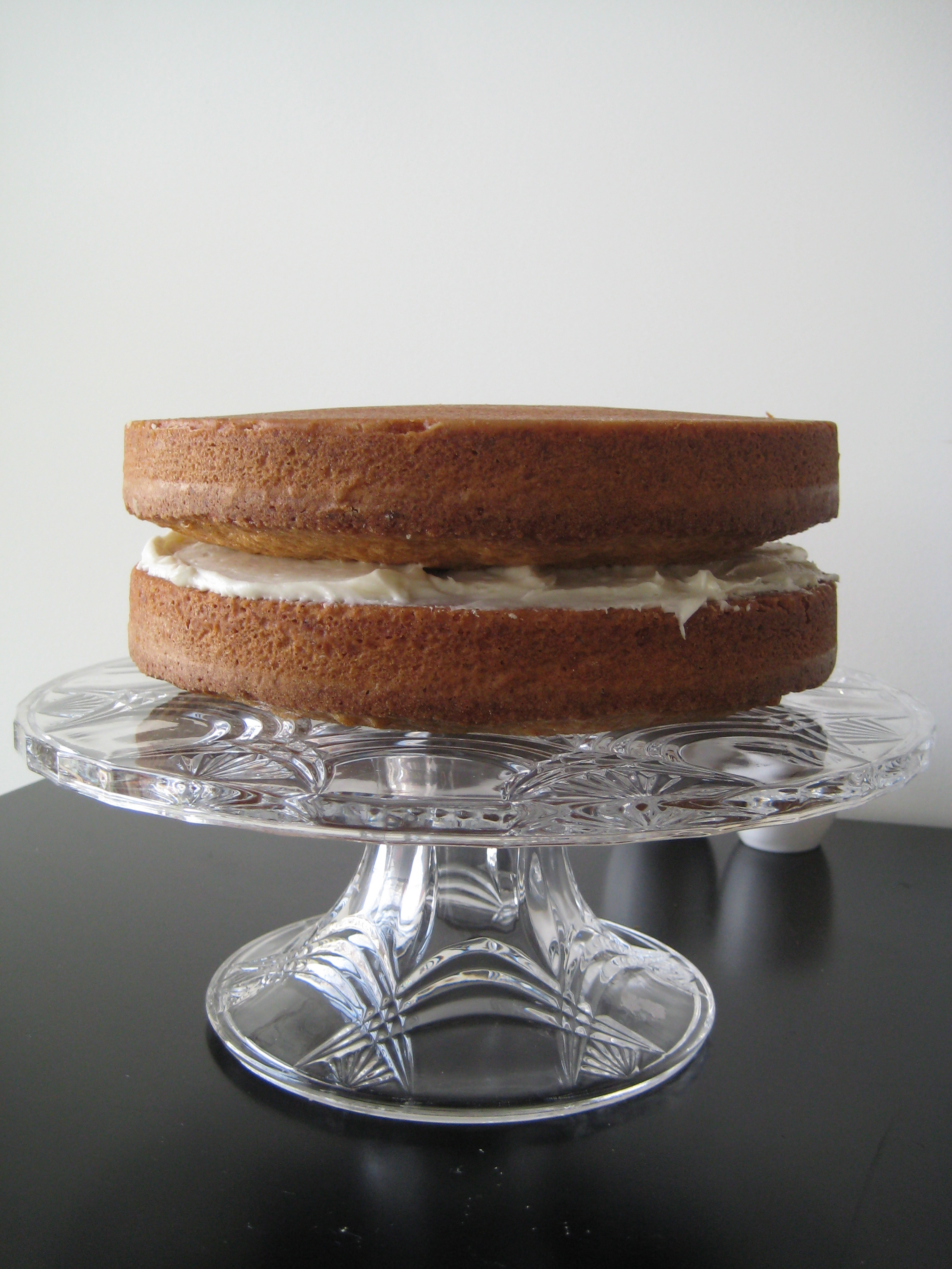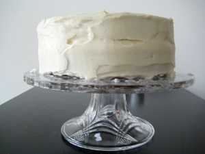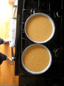 I am embarrassed to admit that I put the top cake on upside down…It’s not a huge deal, but makes frosting the sides a bit more like caulking a crack. Yum.