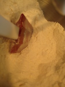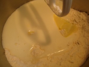 Then add the butter, buttermilk and vinegar mixture to that and begin mixing.