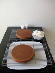 Once mixed add batter to two round cake pans and throw em in the oven.