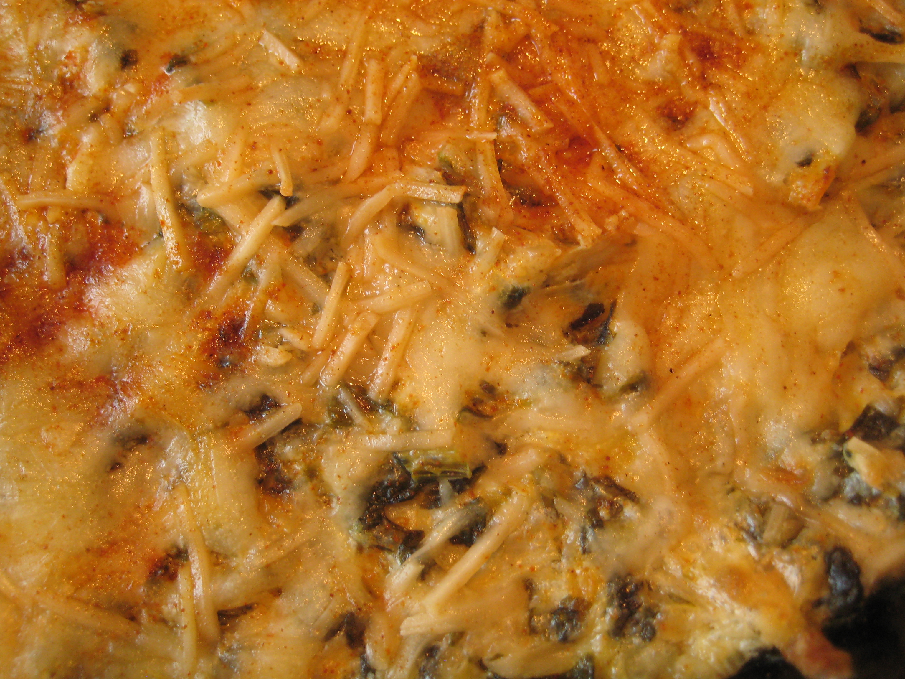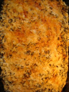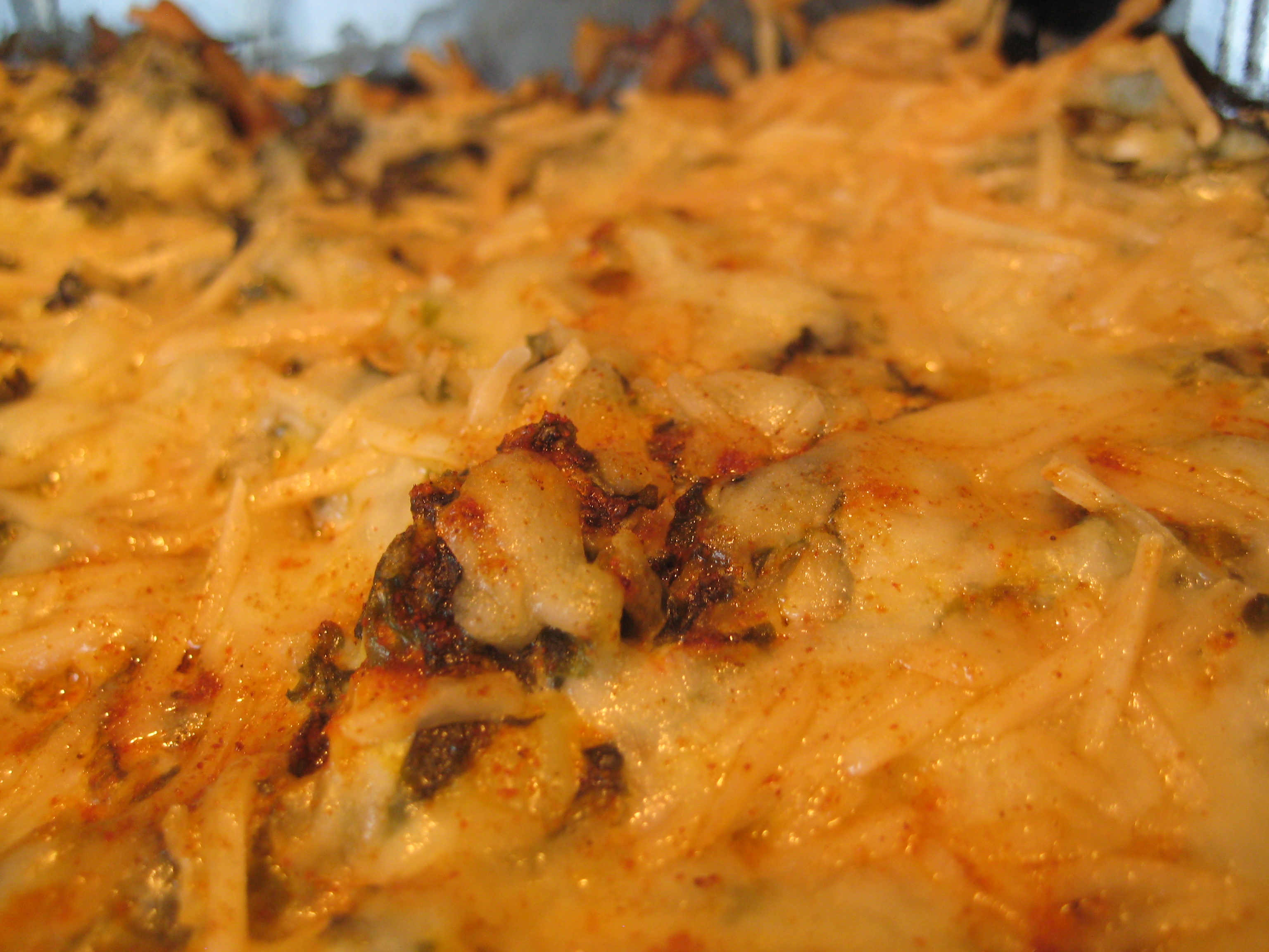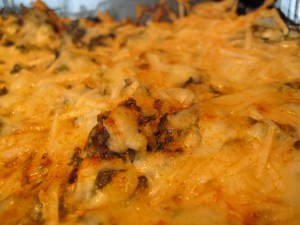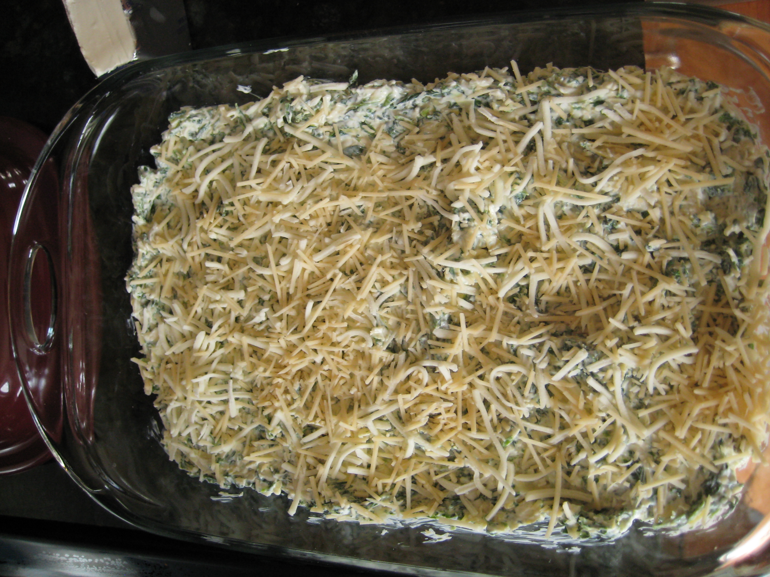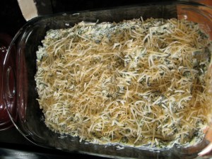 Spread the mixture into a 9×13 and cover with some parmesan and monterey jack cheese.