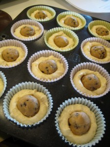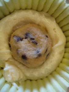 Divide dough into approx. 24-30 rounded 1/2 tablespoons and 24-30 rounded tablespoons (You need the same amount of each, for each cupcake). Refrigerate the smaller cookie dough for at least 1-2 hours and freeze larger dough for at least 2 hours.