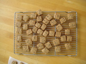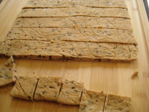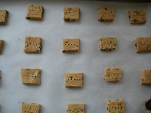 Remove plastic wrap or put the plastic bag on a cutting board and slit it open. Turn the firm dough out onto the board use a sharp knife to cut the dough into 1 1/2-inch squares. Transfer the squares to the baking sheets and carefully prick each one with a fork.