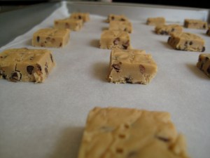 With a mixer, beat the butter and confectioners’ sugar together on medium speed for about 3 minutes, until the mixture is very smooth. Beat in the vanilla and espresso, then reduce the mixer speed to low and add the flour, mixing only until it disappears into the dough. Don’t work the dough much once the flour is incorporated. Fold in the chopped chocolate with a sturdy rubber spatula.