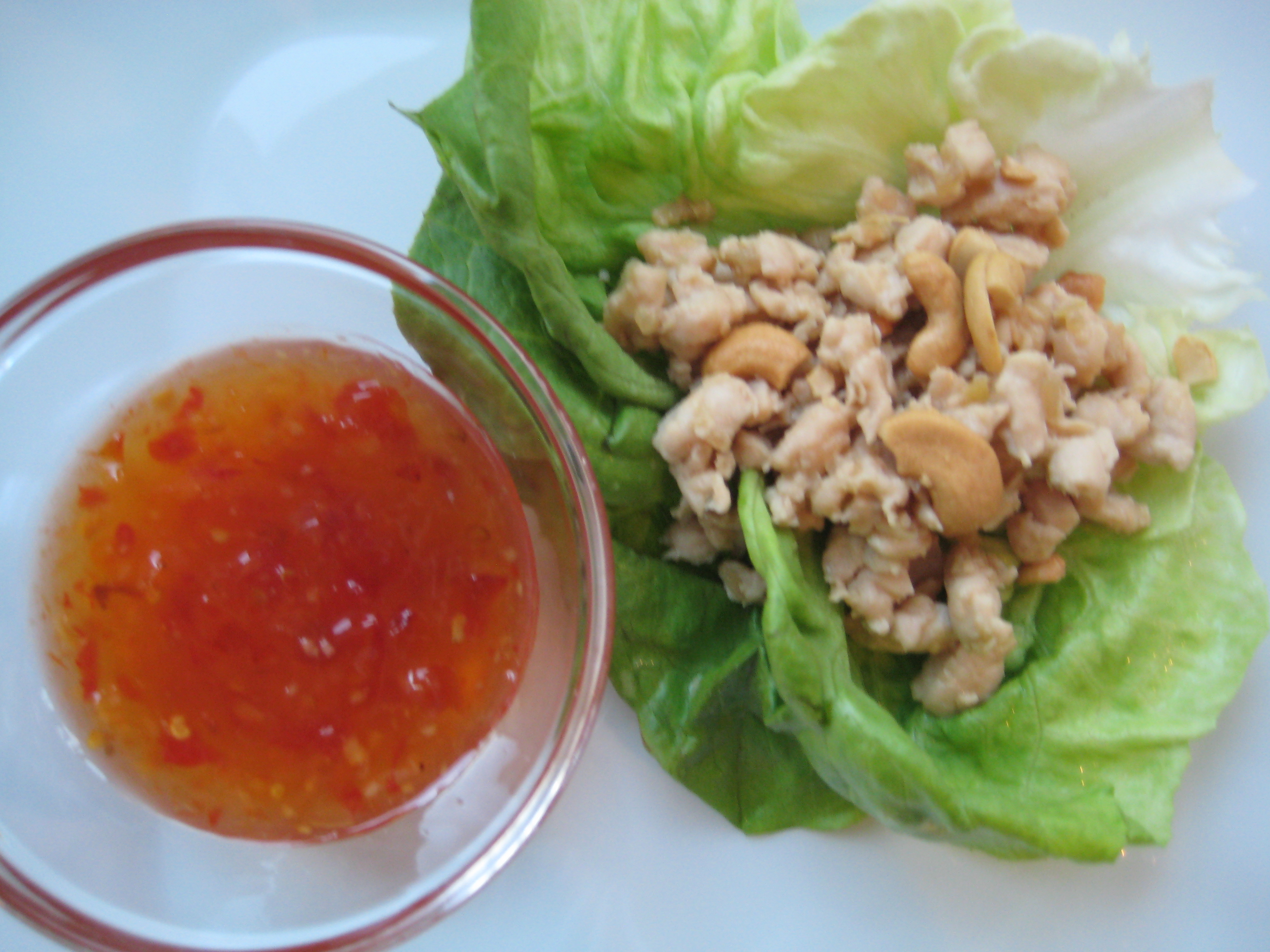 Spoon chicken mixture into lettuce leaves, dividing equally. Garnish with cashews. Roll leaves around filling and dip into chili sauce.