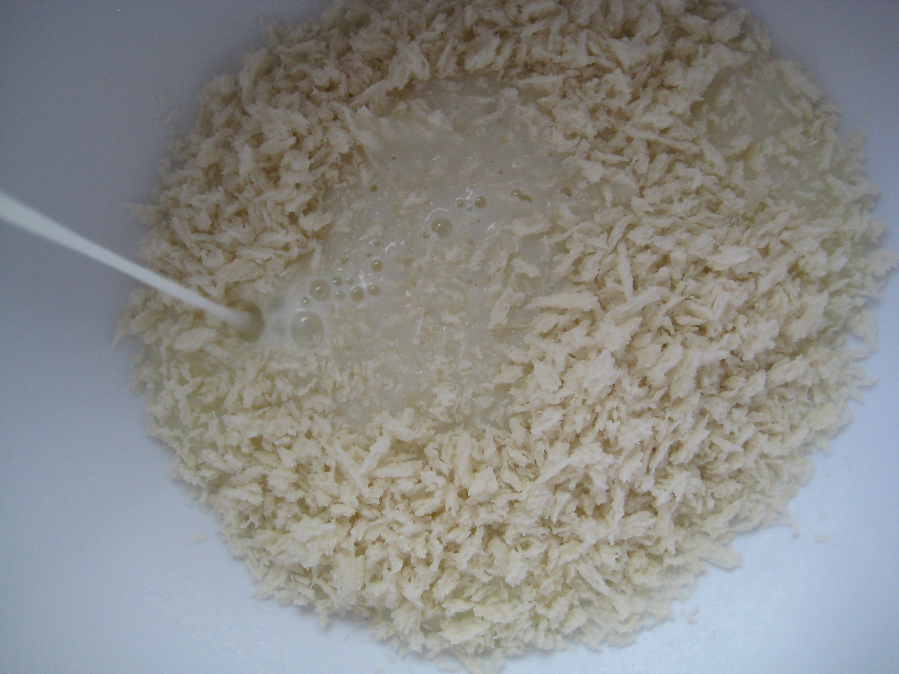 Pour milk over bread crumbs in a large bowl and stir until liquid is absorbed.