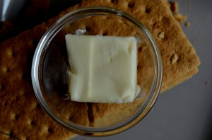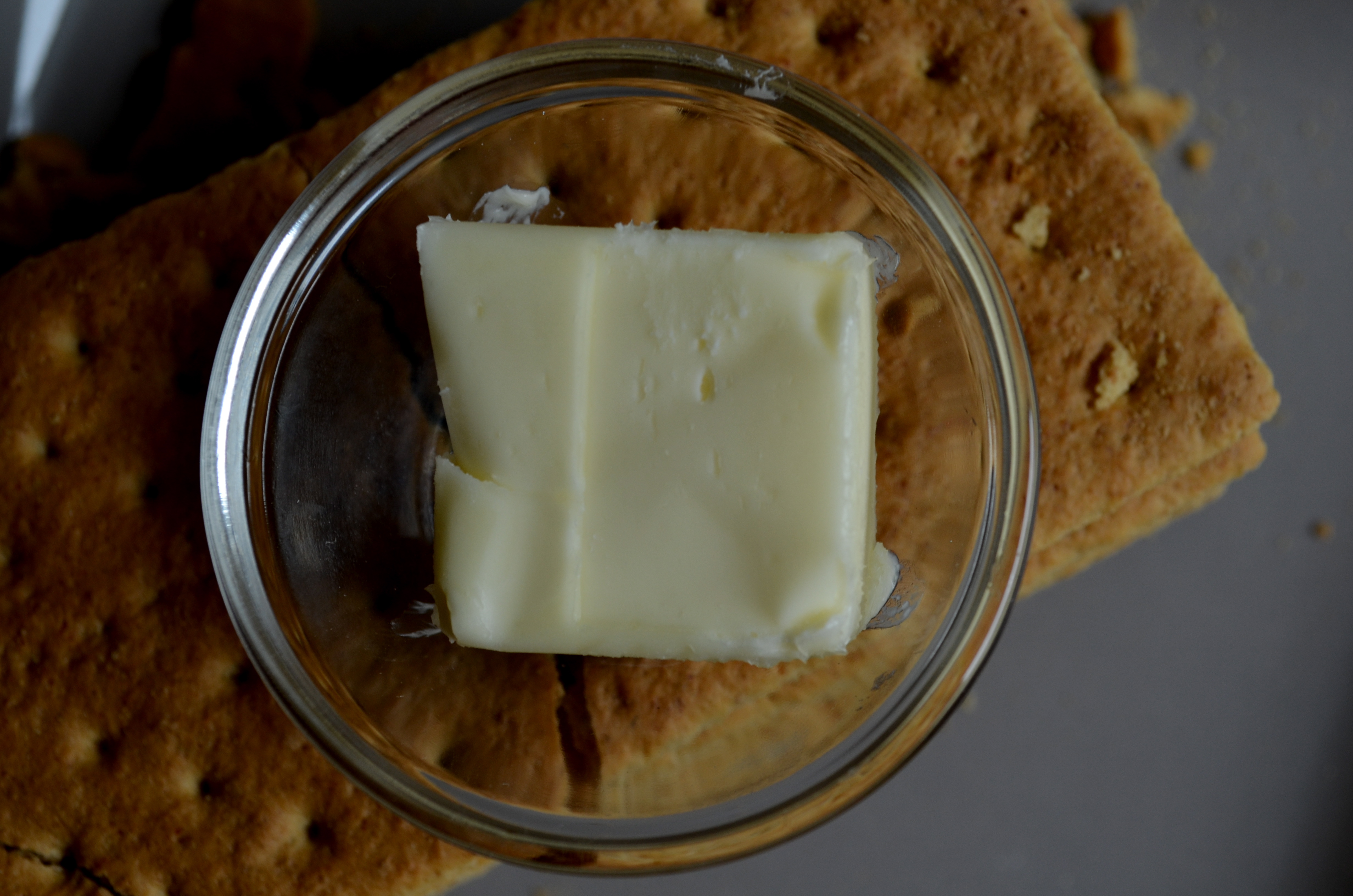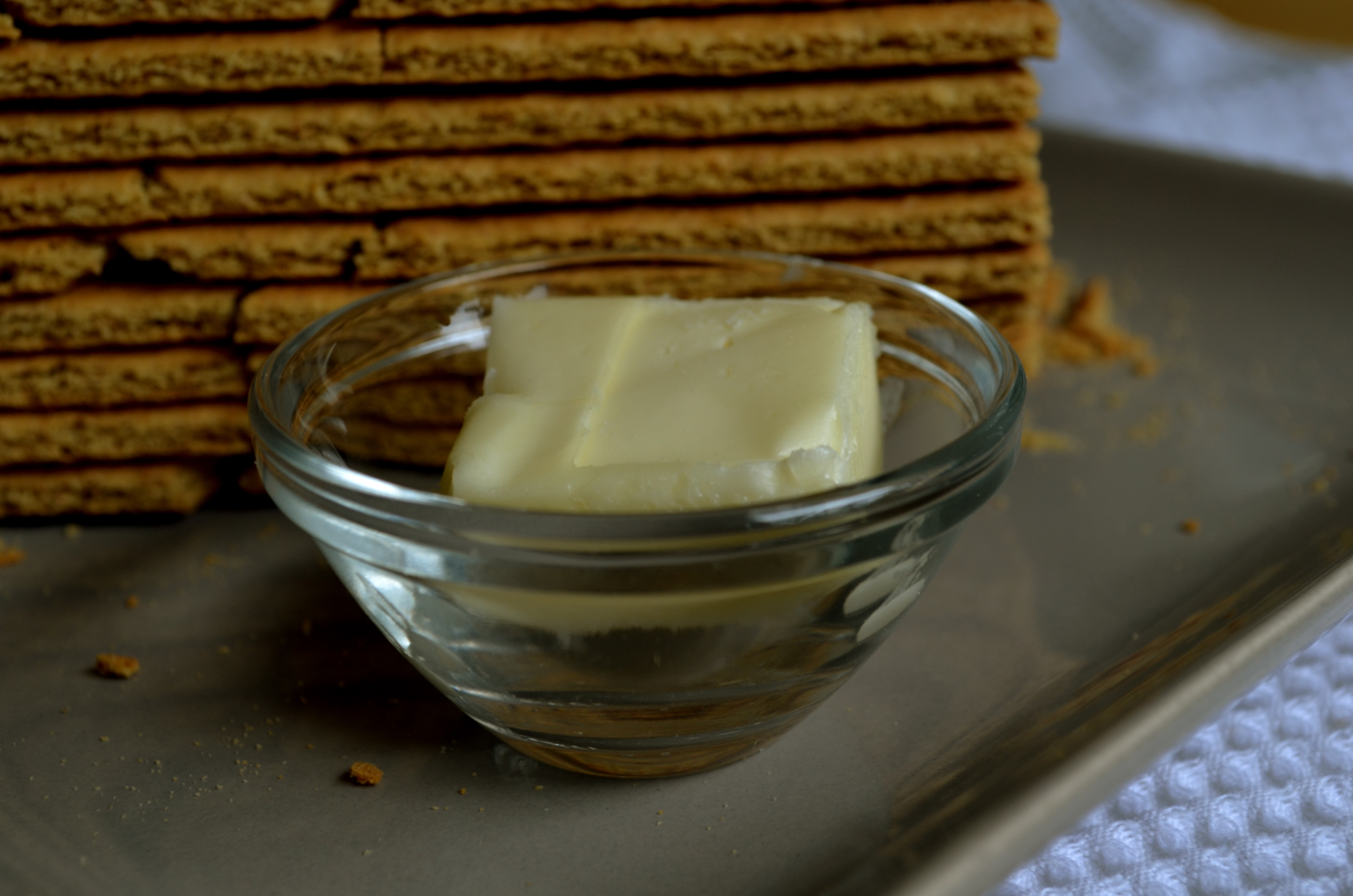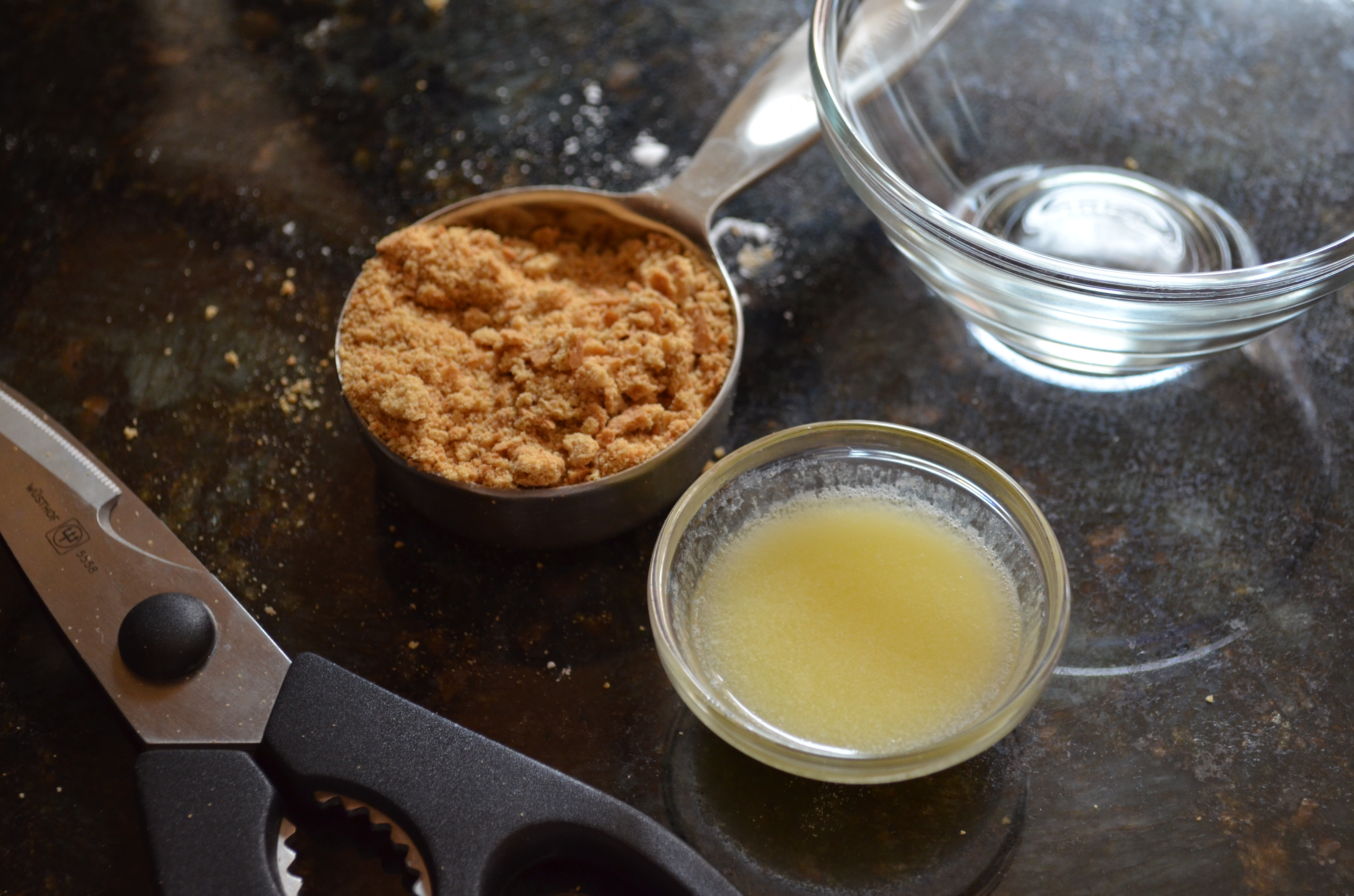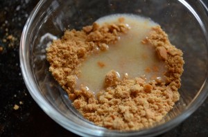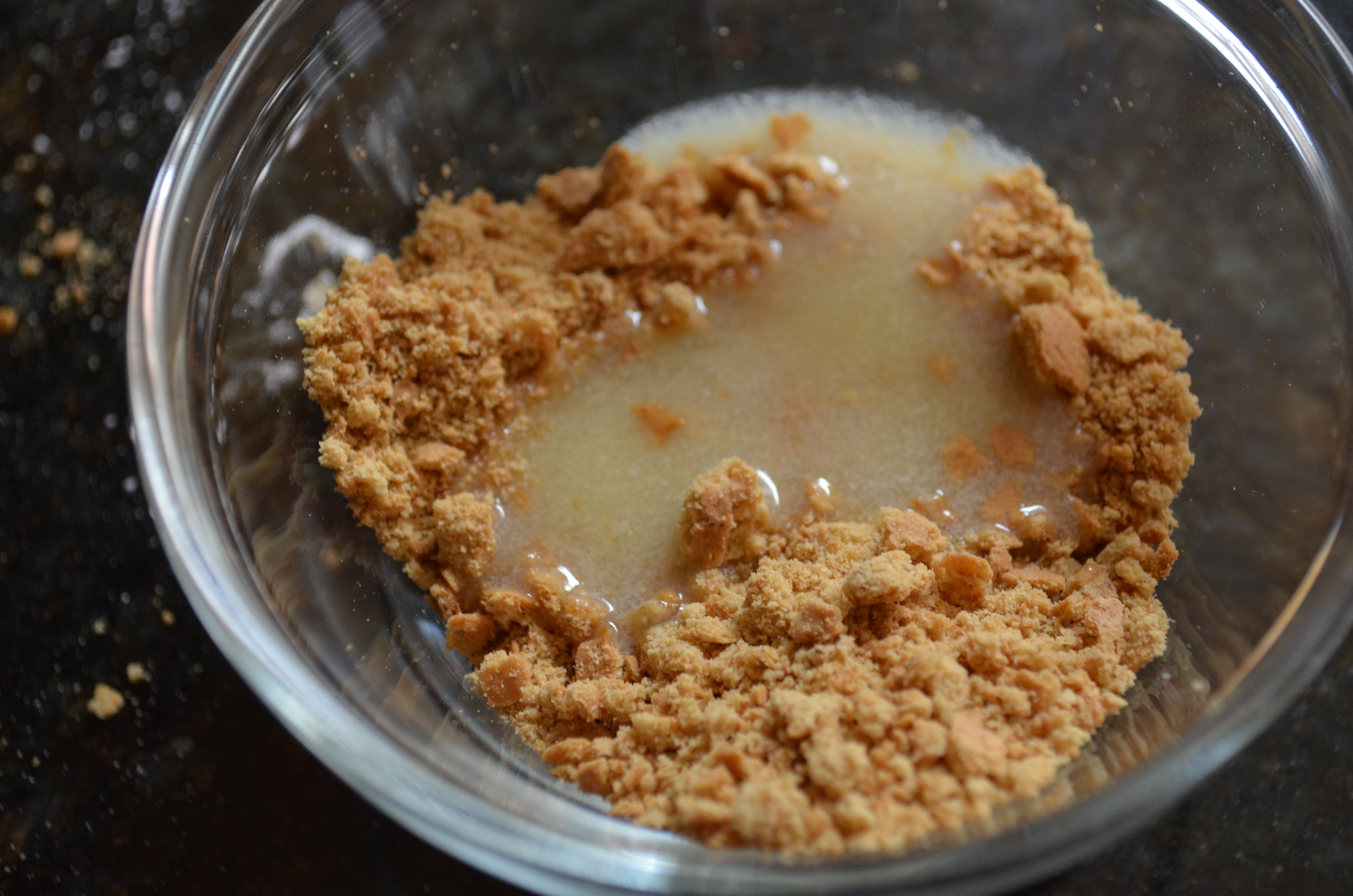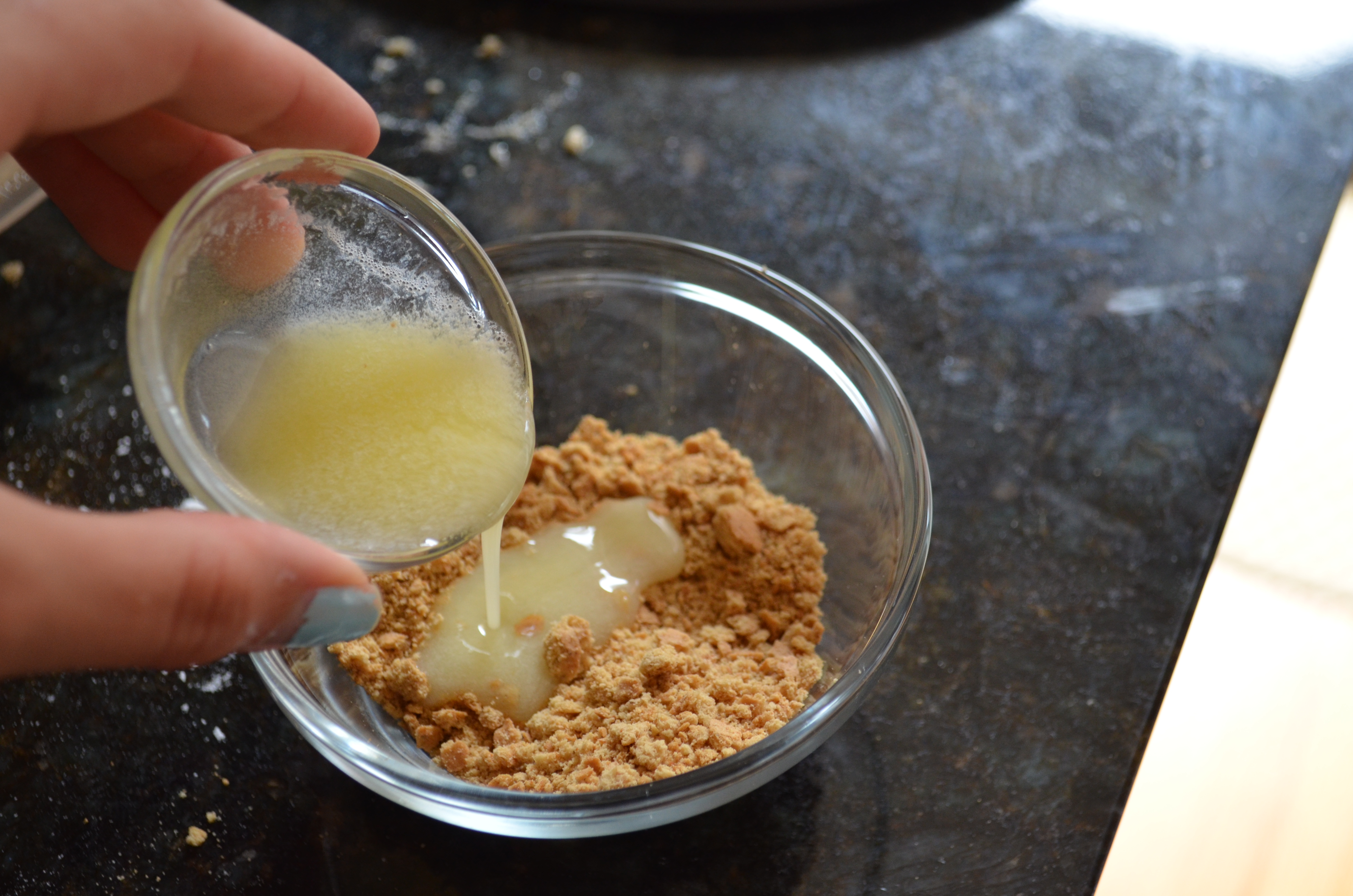 While they bake, melt the butter and combine it with the graham cracker crumbs.