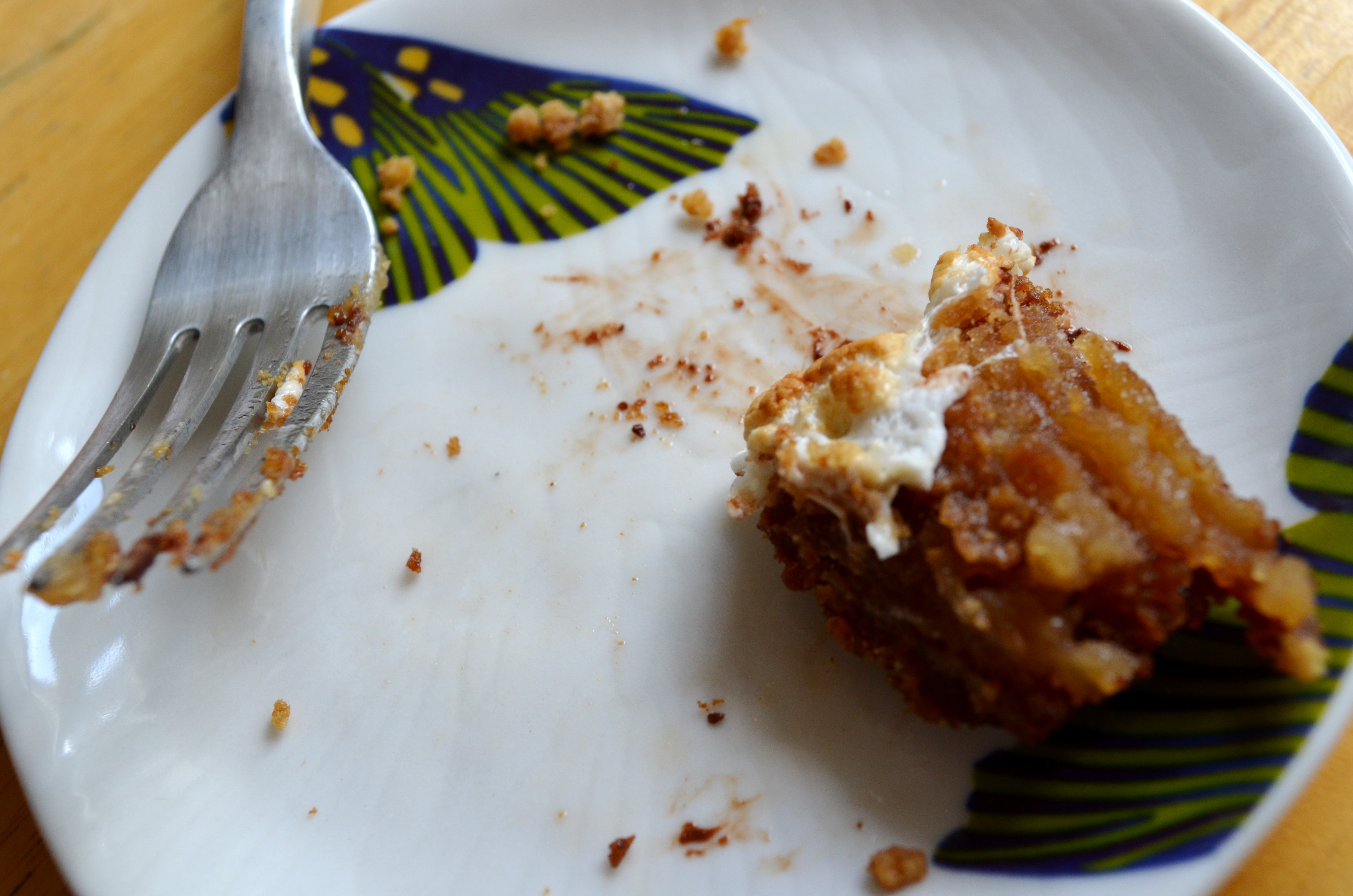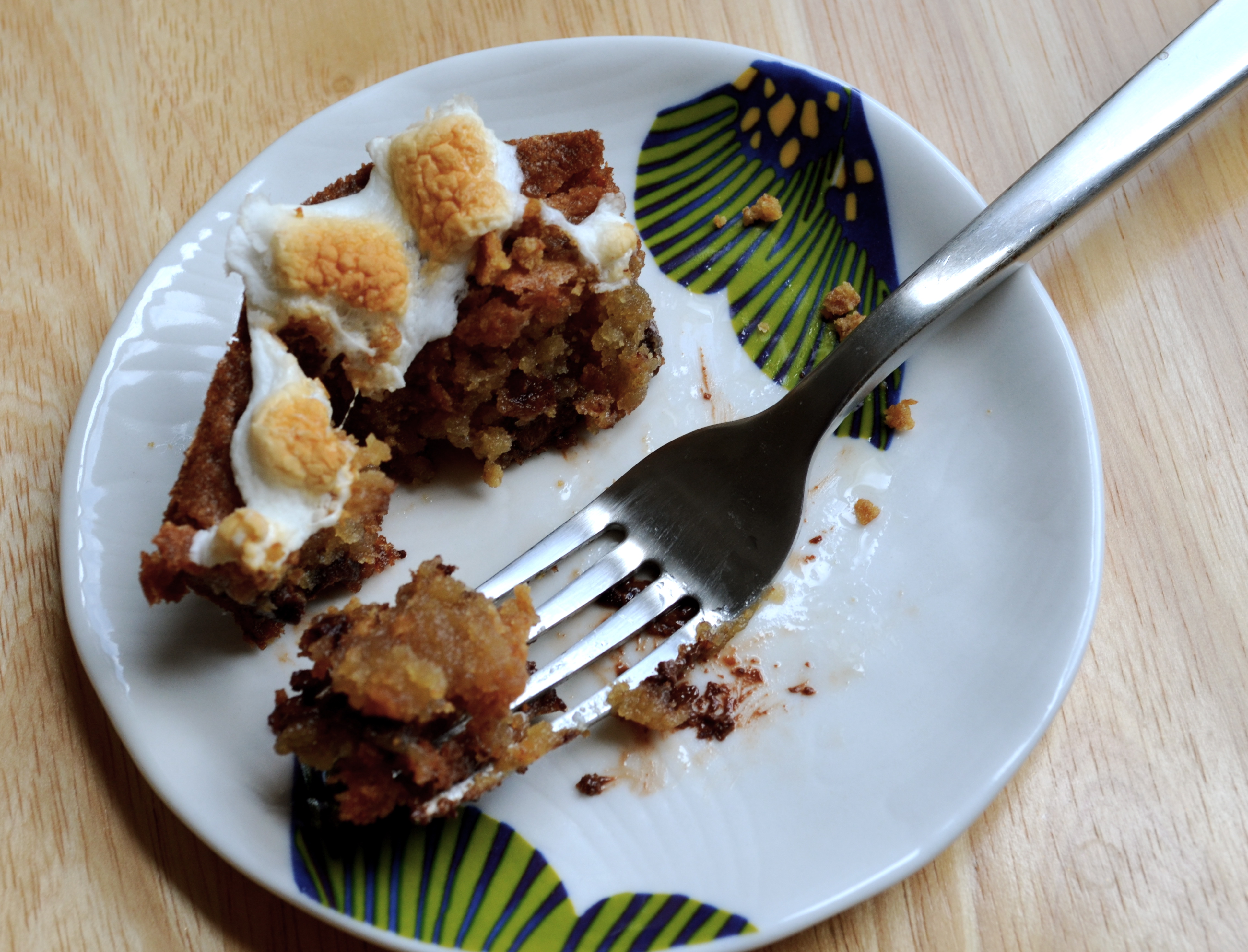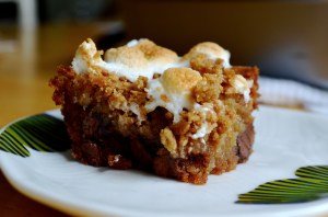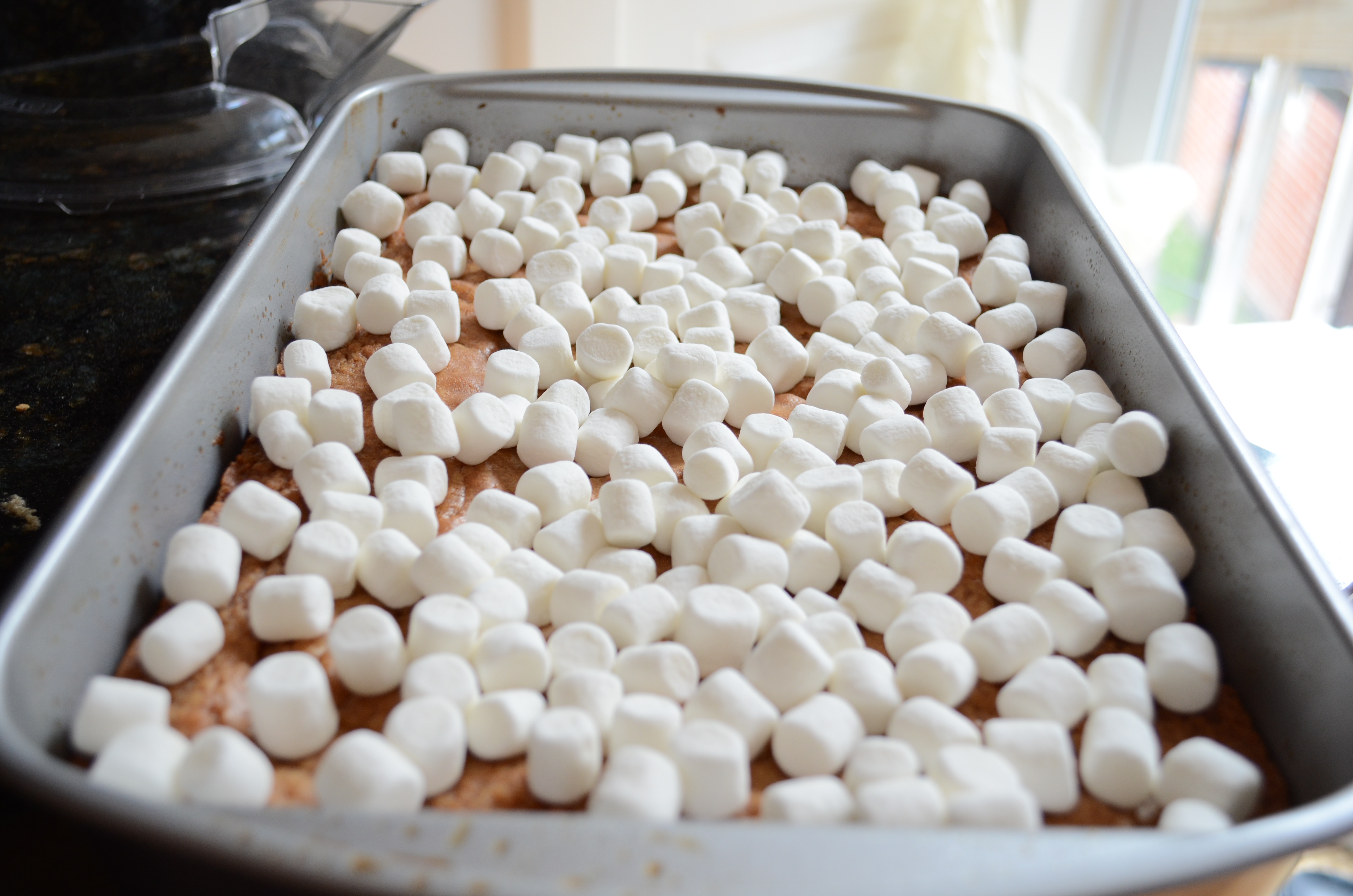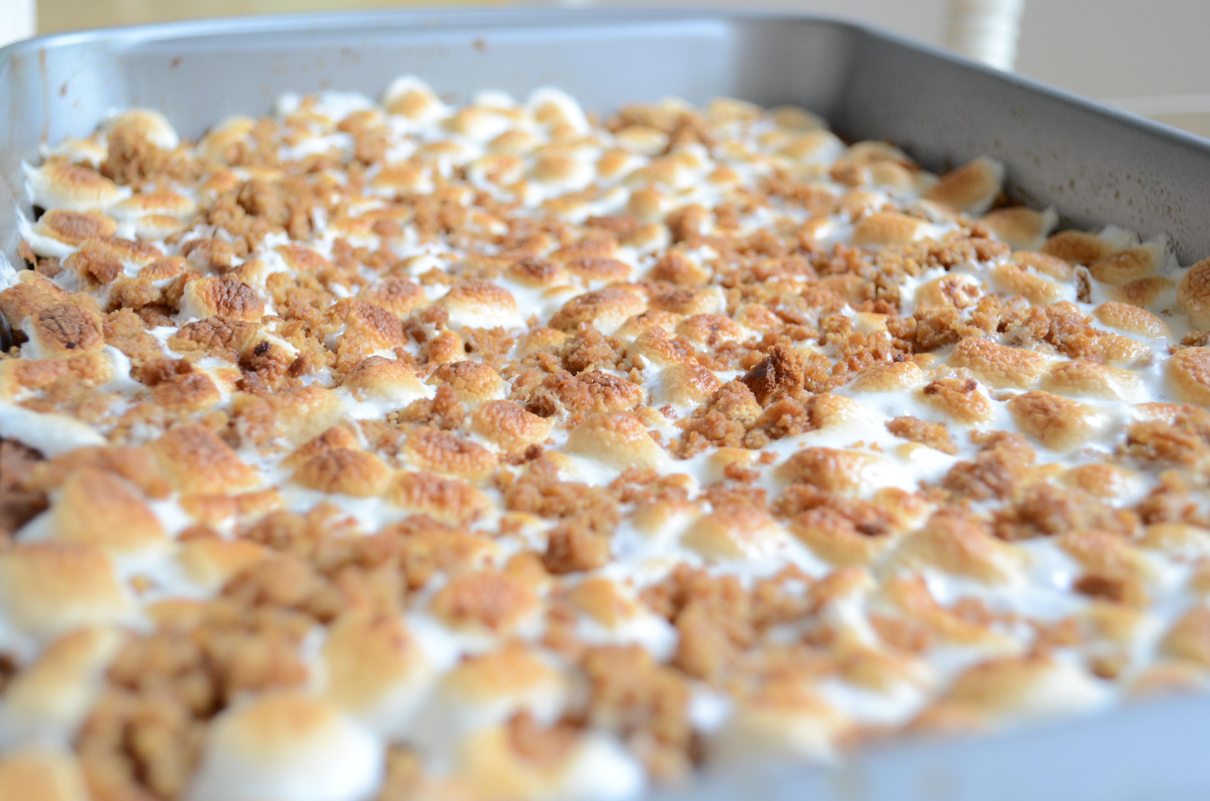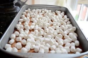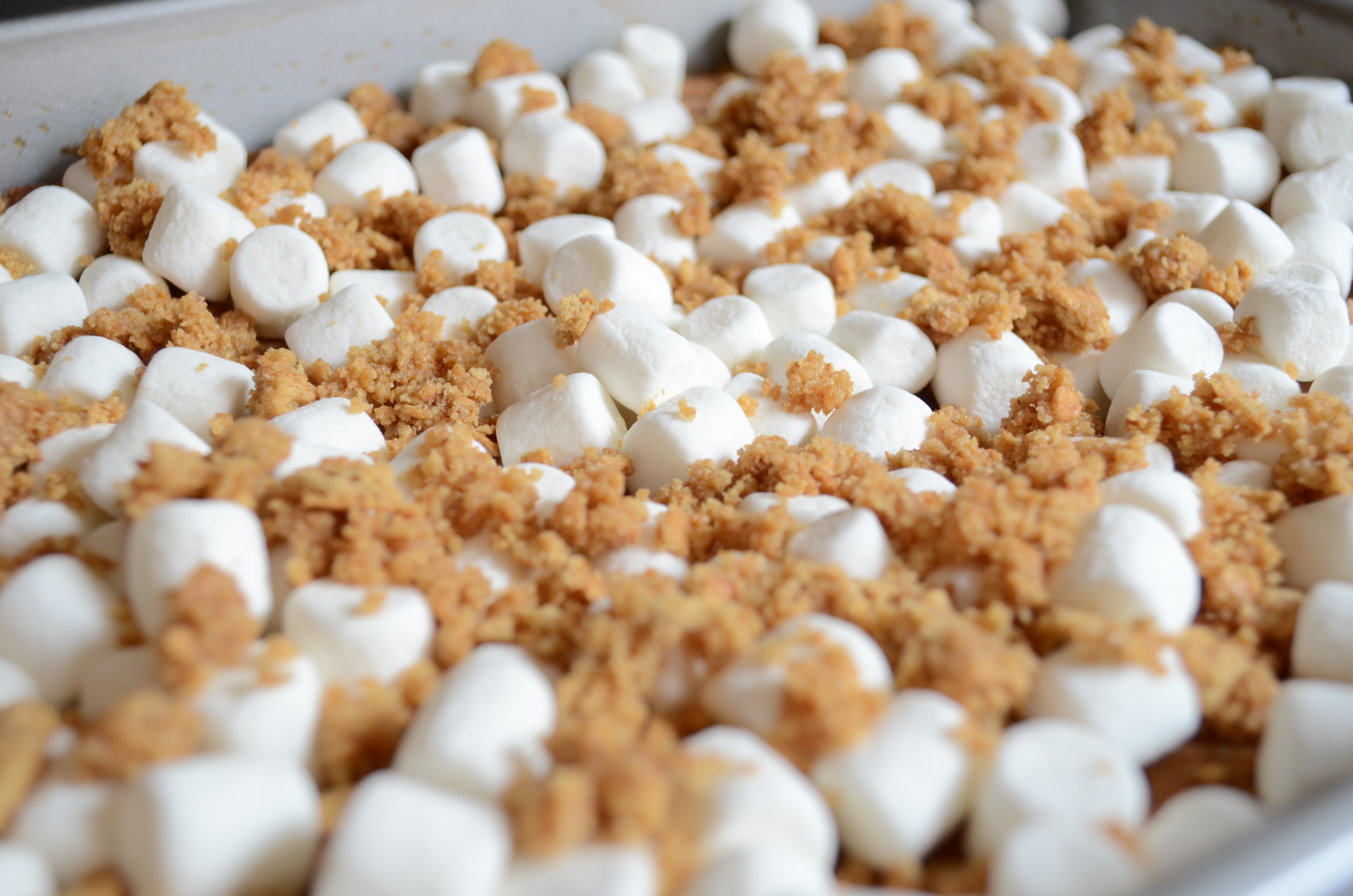 When the blondies finish baking, remove from oven and top with mini marshmallows and graham cracker crumb mixture.