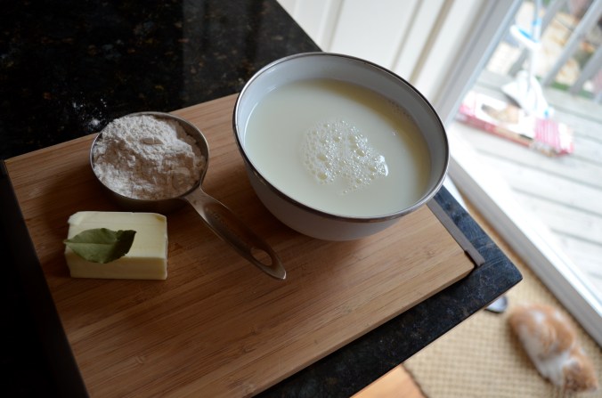 For the white sauce, heat the milk, butter, flour and bay leaf in a pan, whisking constantly, until smooth and thick.