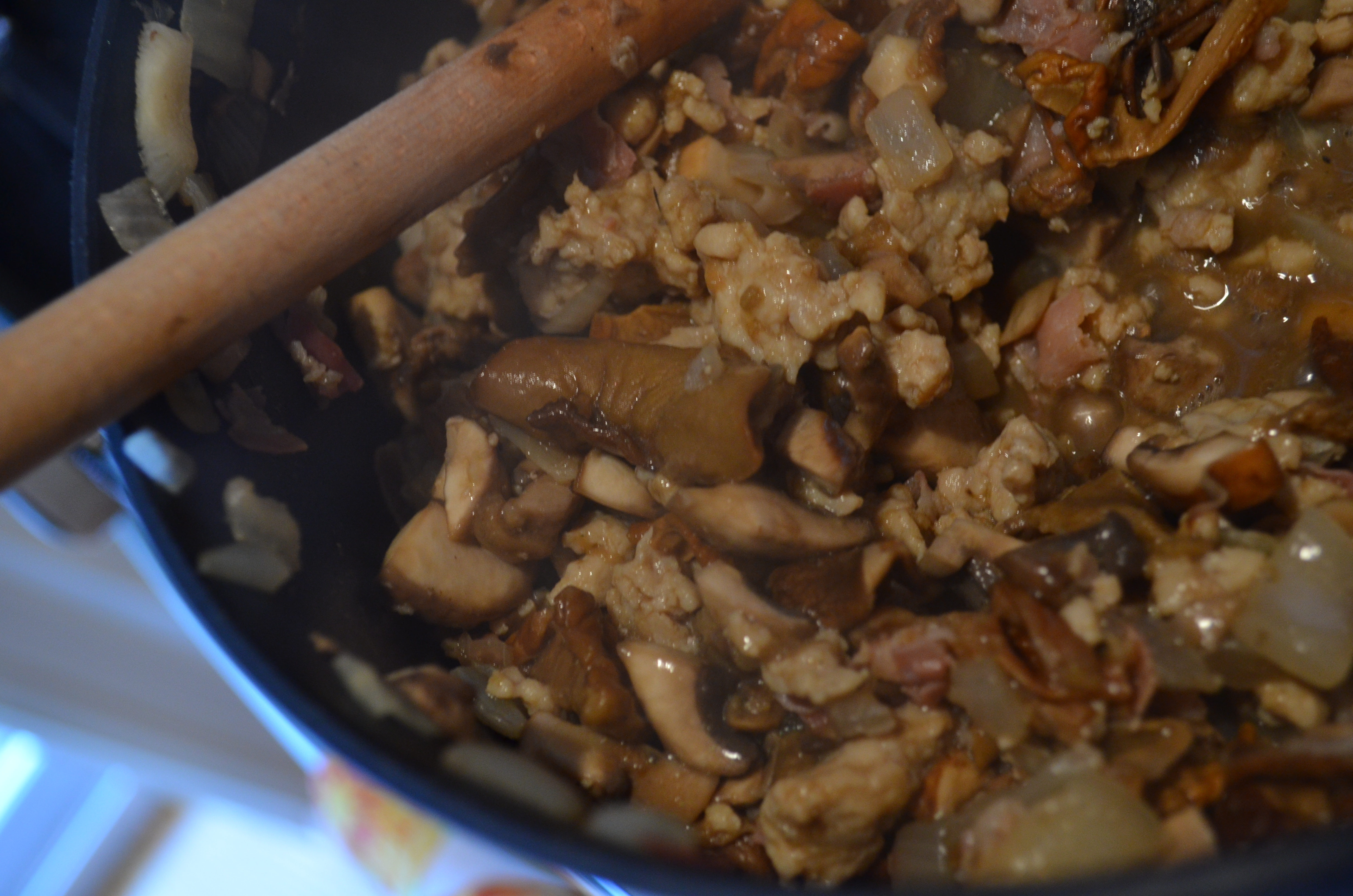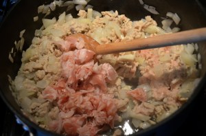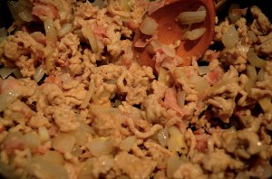 Add the pancetta to the ground chicken and onion mixture.