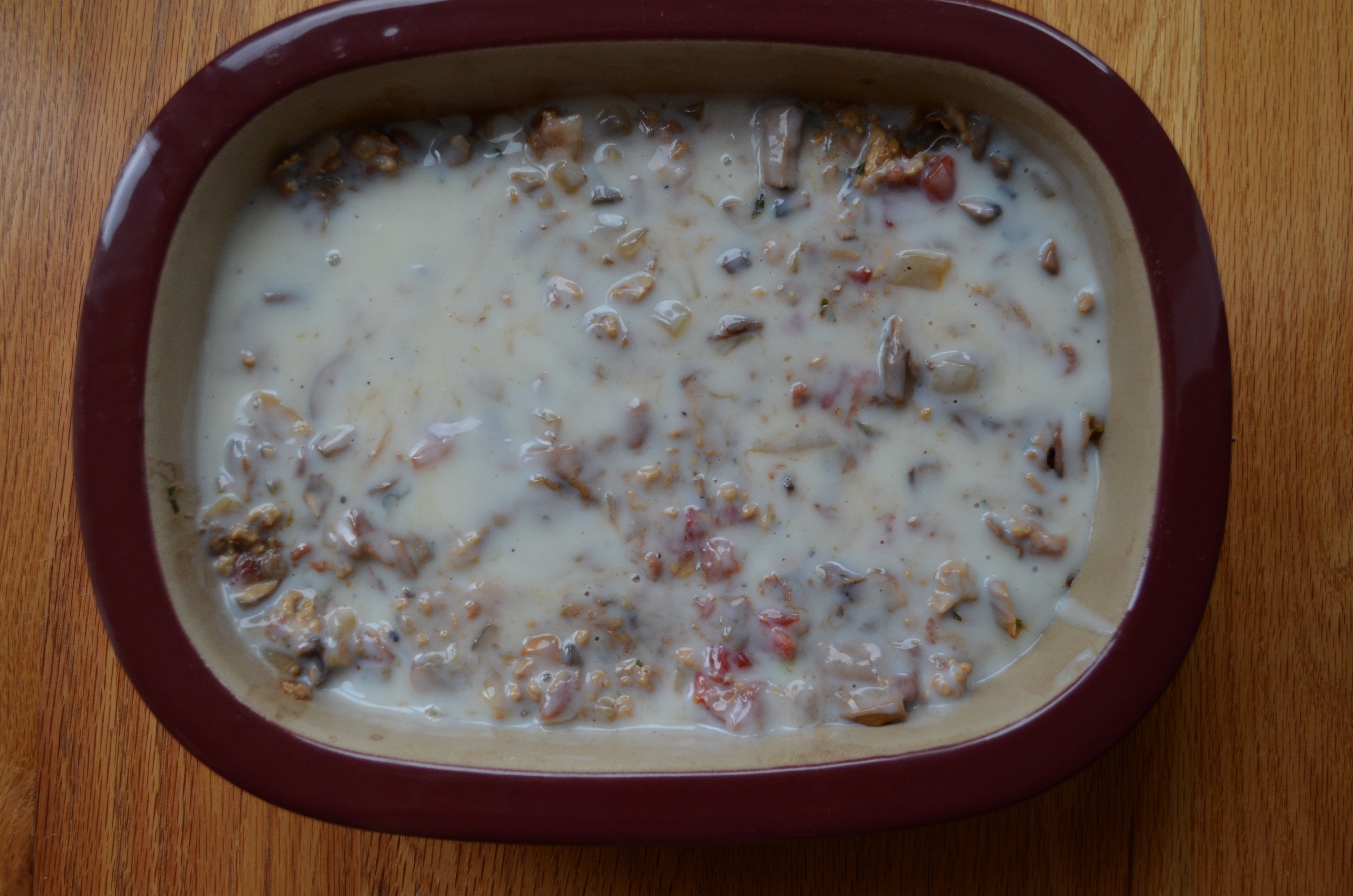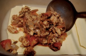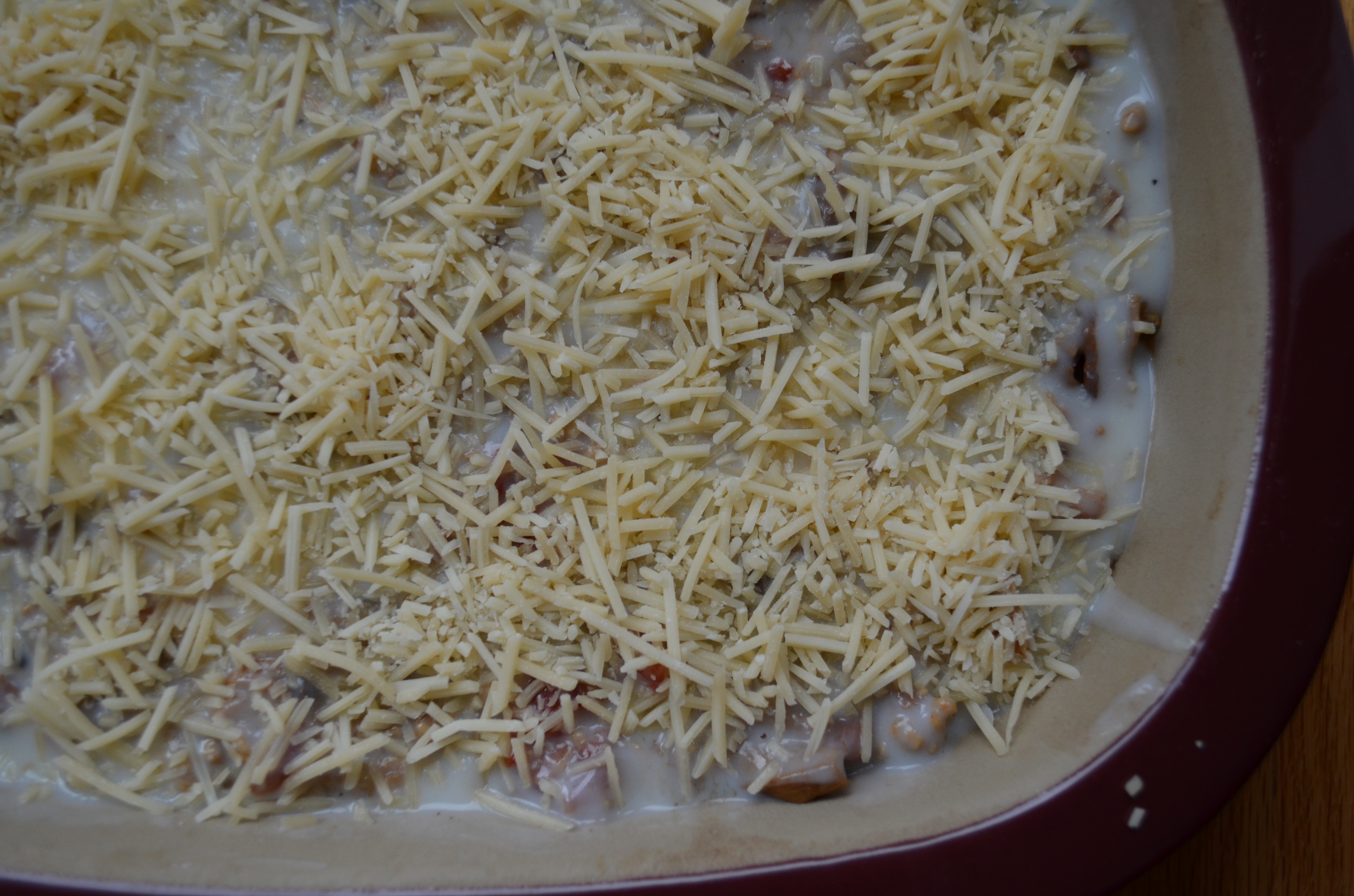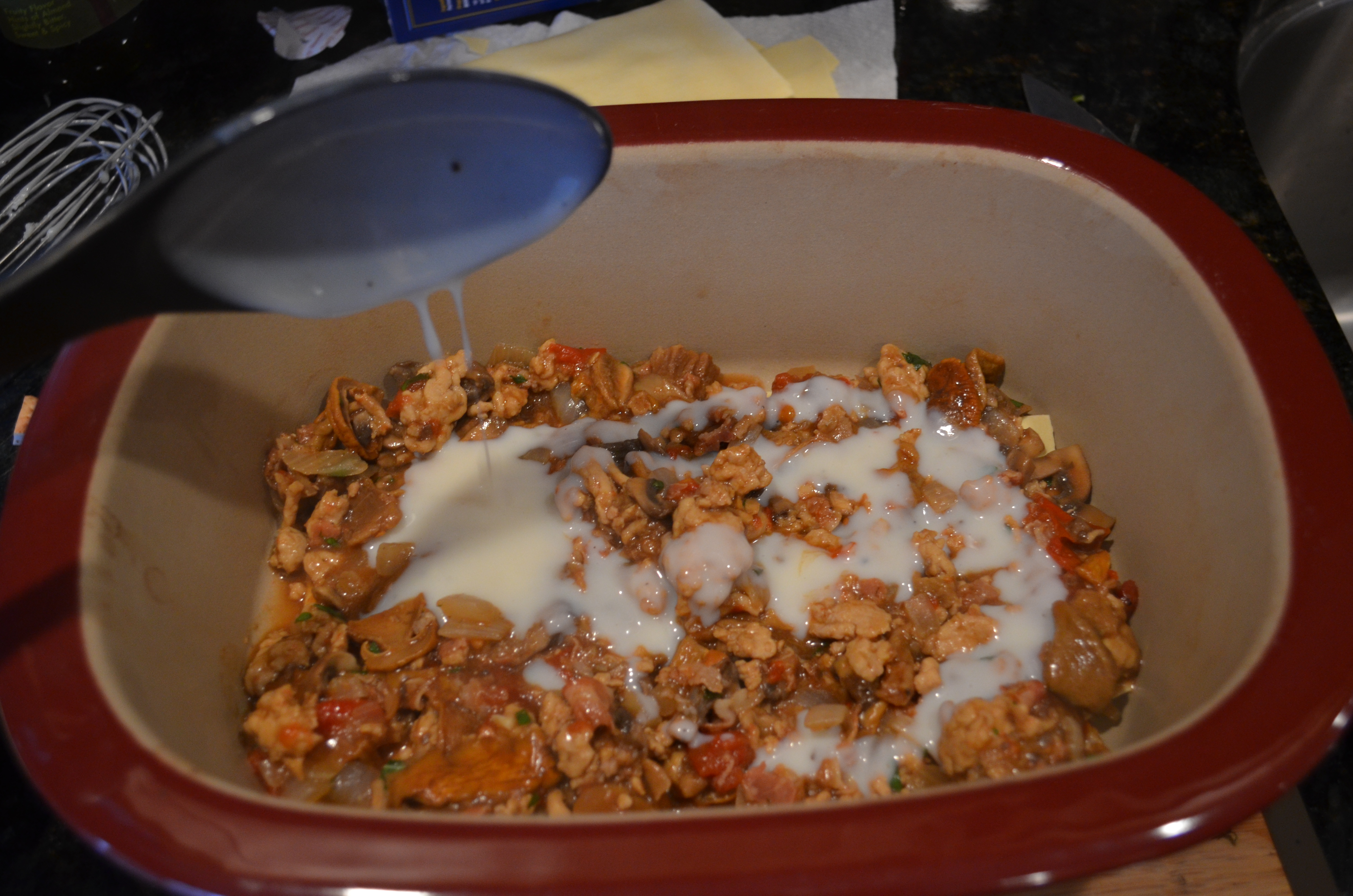 Keep doing that in layers, finishing with the white sauce.