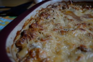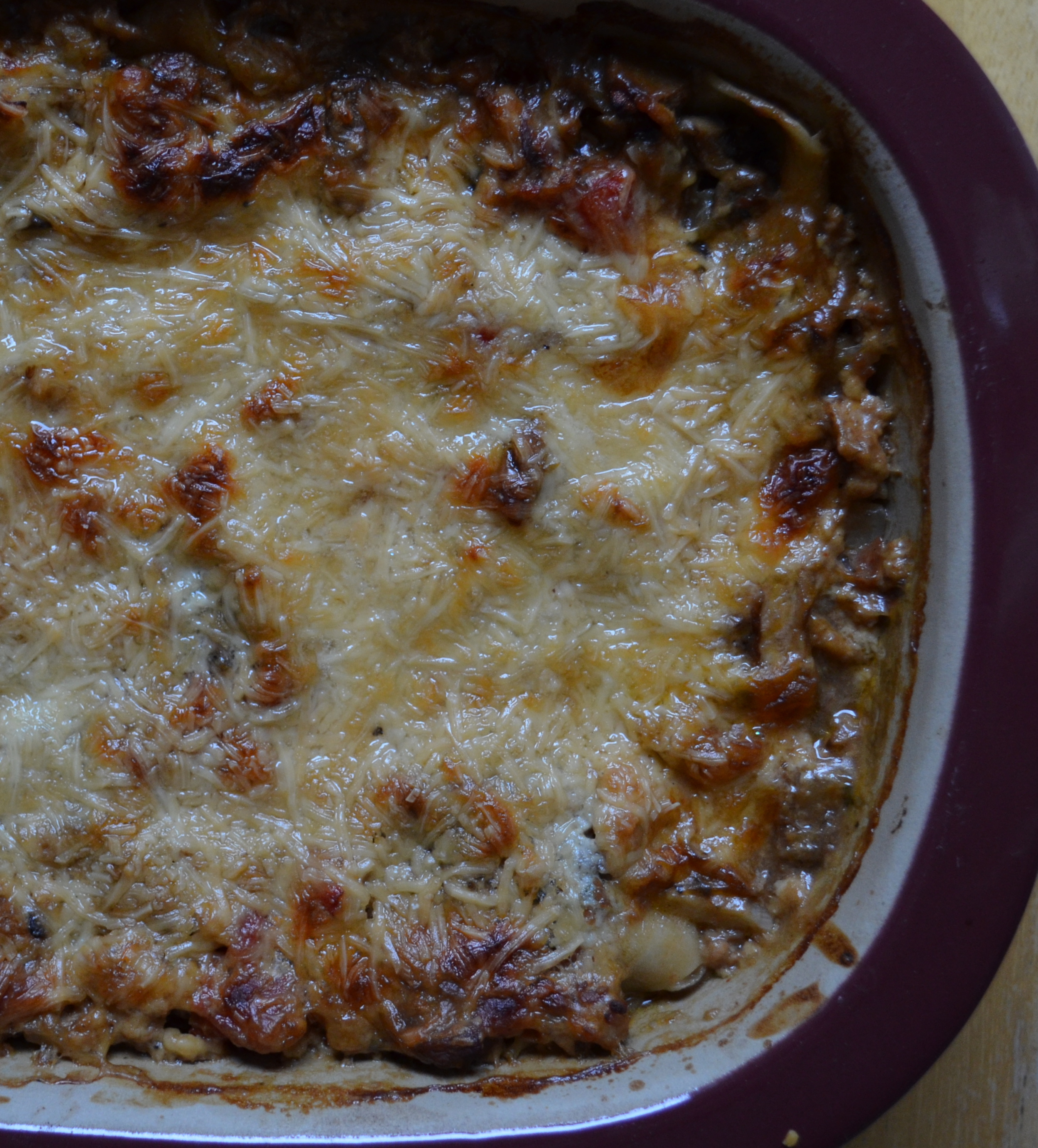 Bake for 30-40 minutes until the cheese is browned and melted on top.