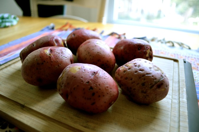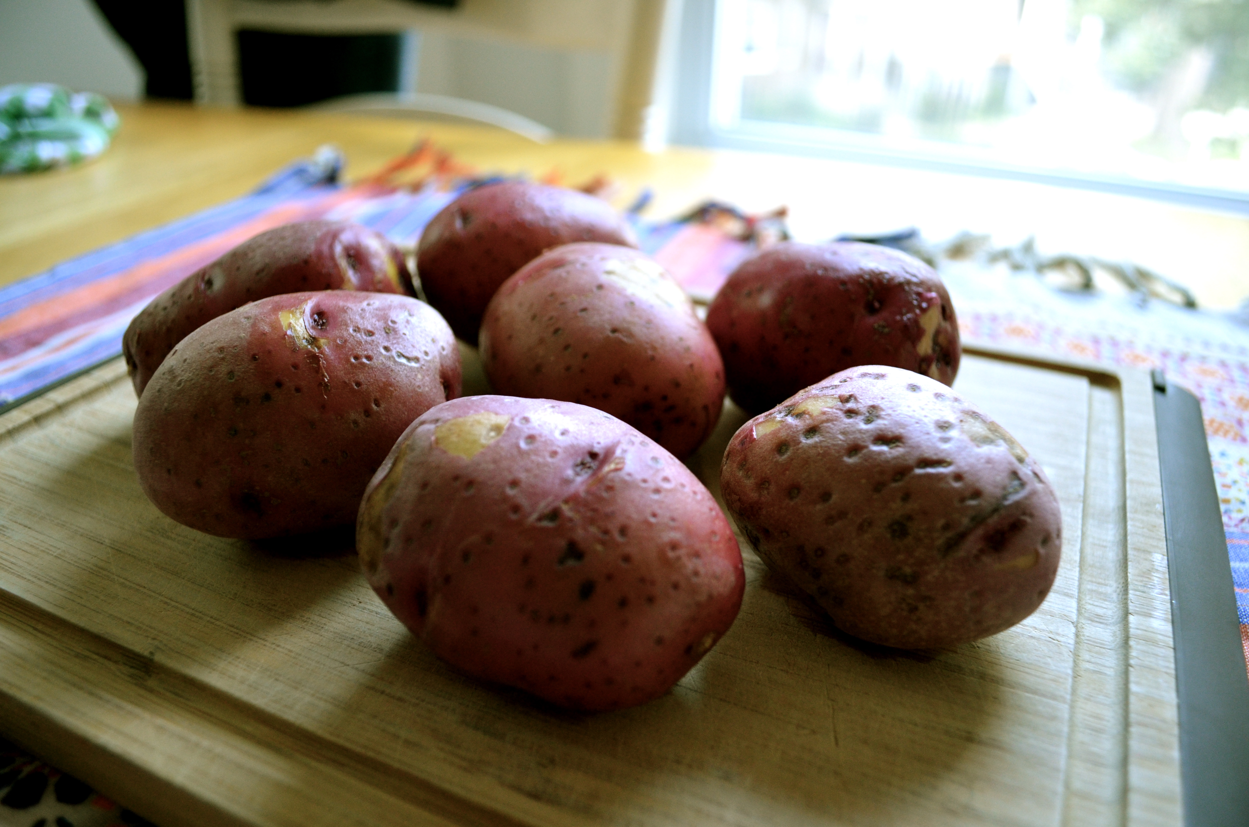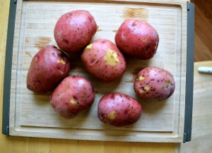 1 to 1 1/2 pounds potatoes. I used red potatoes, any kind will work.