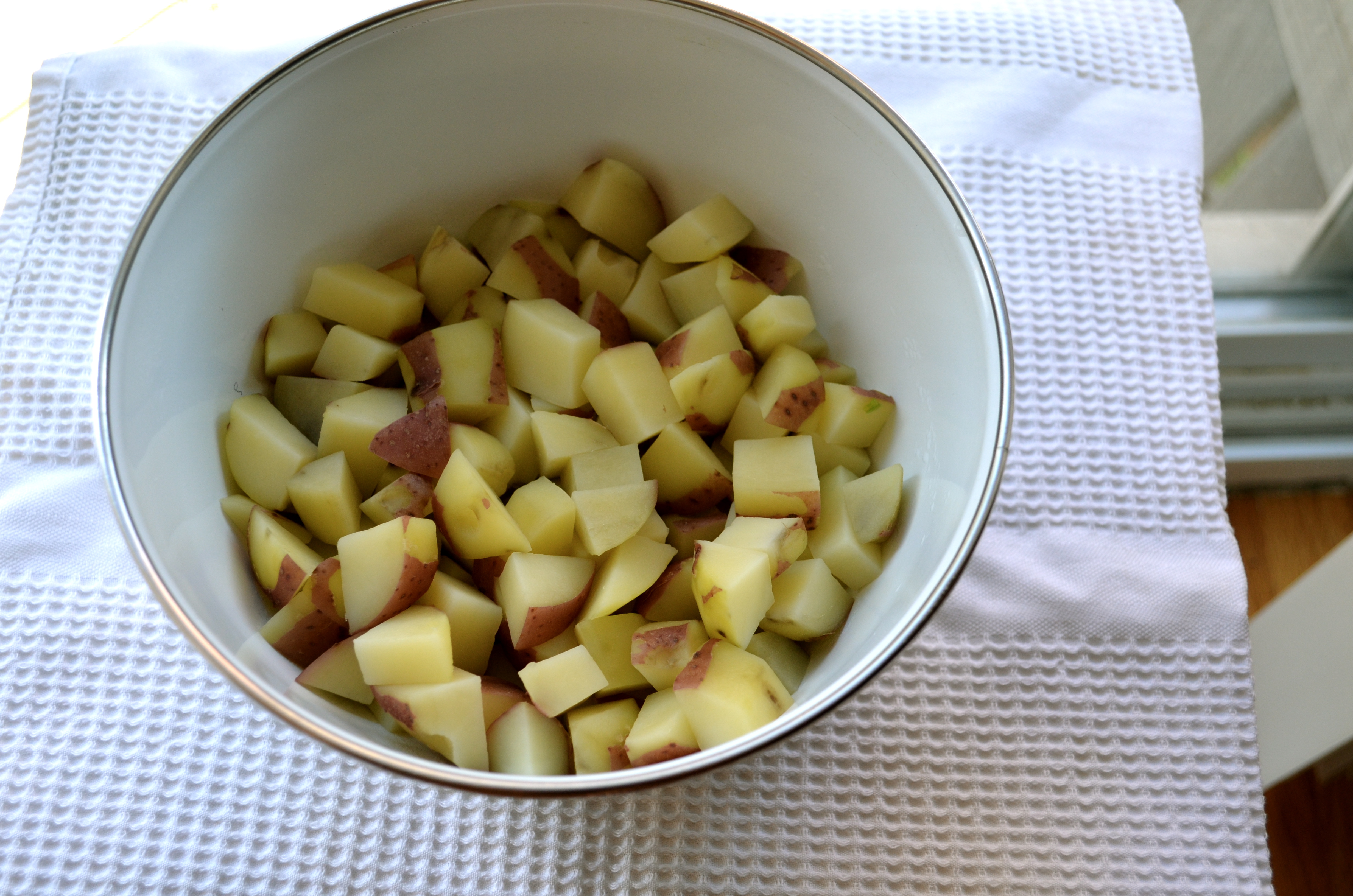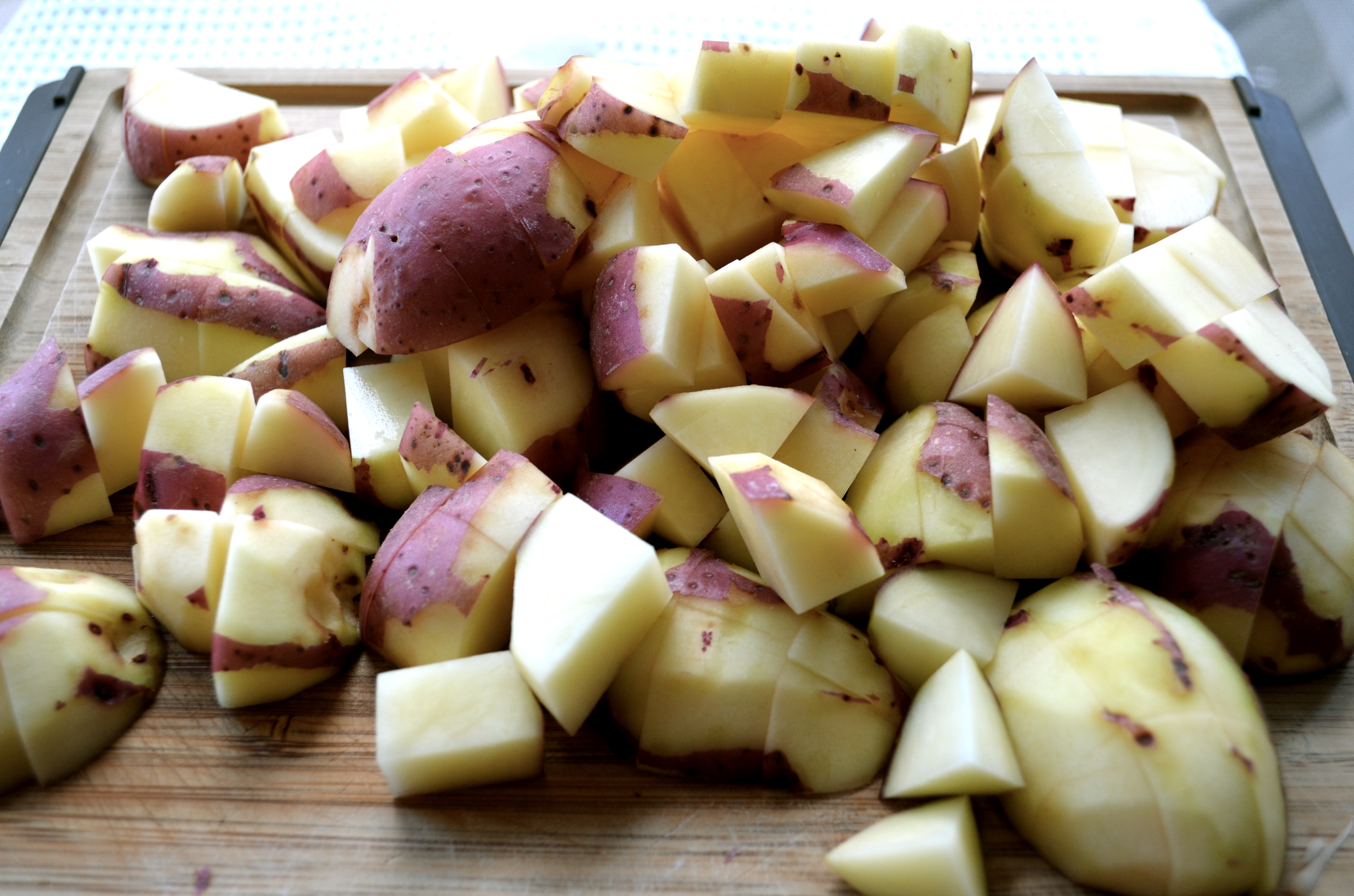 Wash and peel (I semi-peeled my potatoes) potatoes. Cut into medium cubes, keeping them relatively the same size.