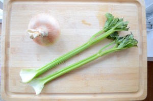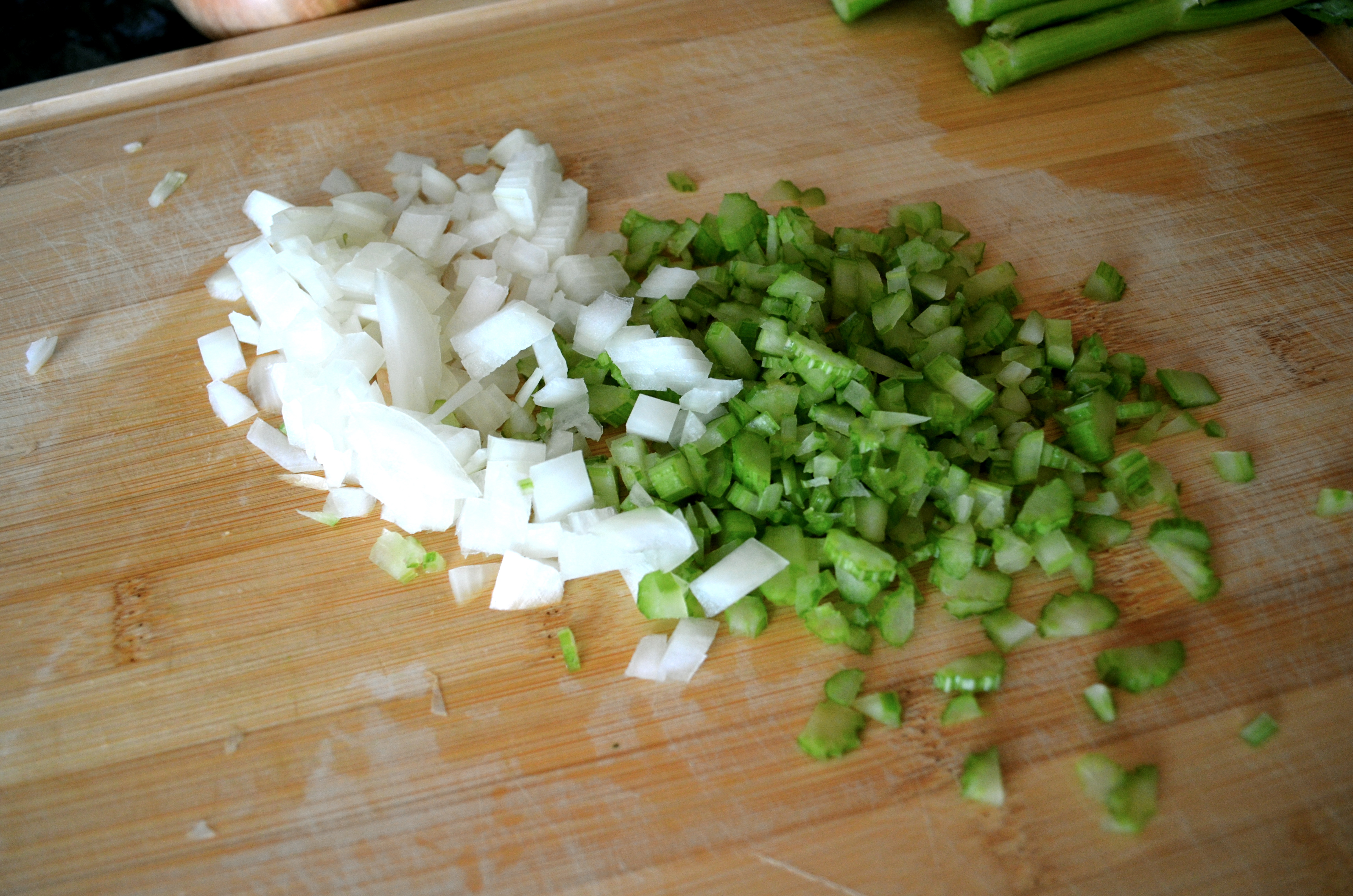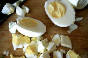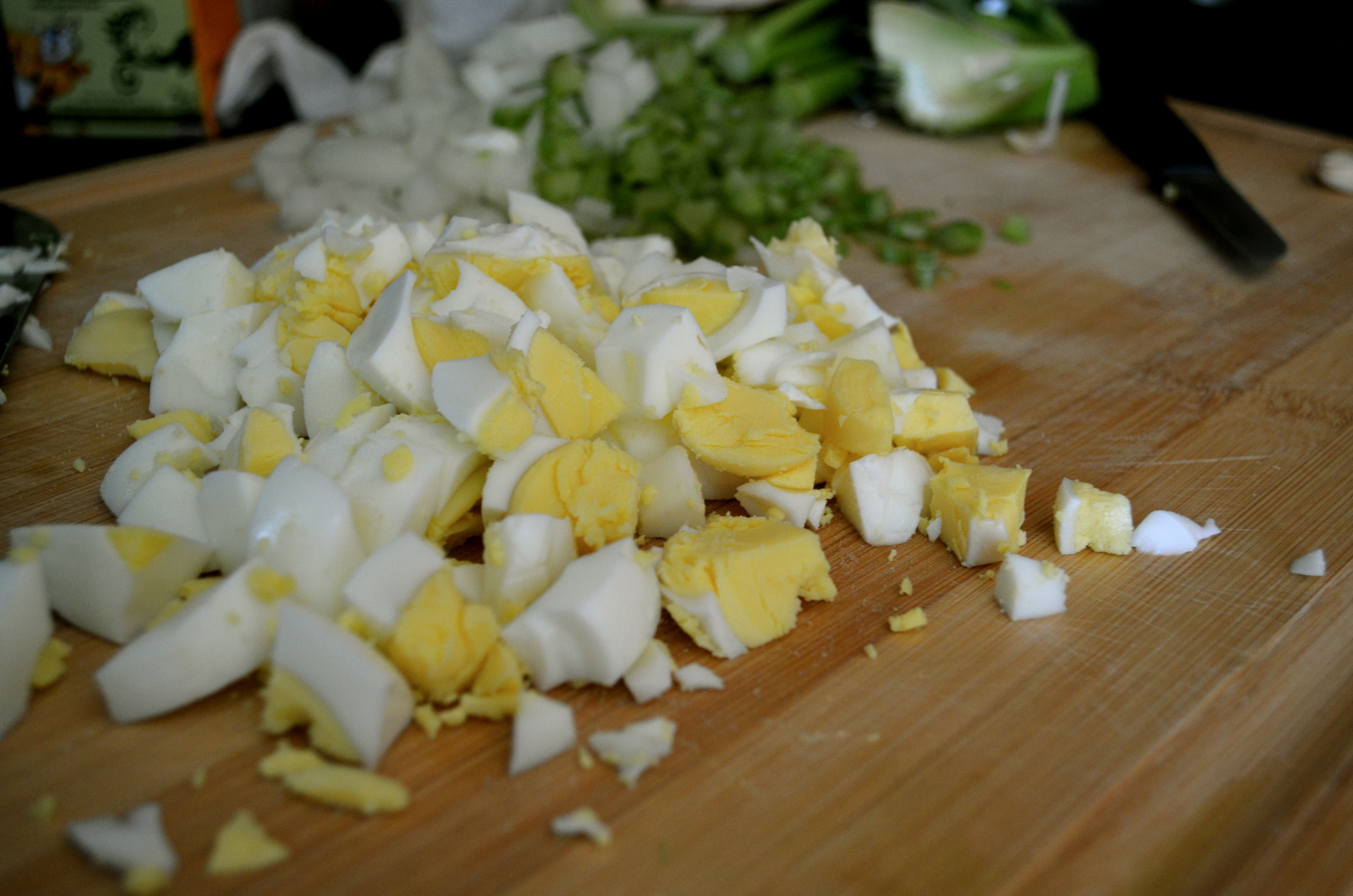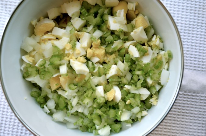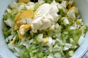 While potatoes are cooking dice onion and celery, peel eggs and cut and combine sauces.
