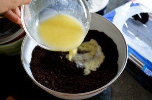 Melt 1 stick of butter in the microwave and add the melted butter to the crushed Oreo’s.