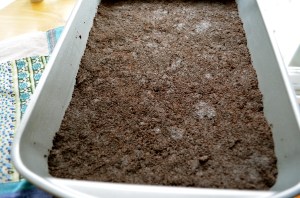 Once they are well combined, firmly press the mixture into the bottom of a greased 9×13 pan.