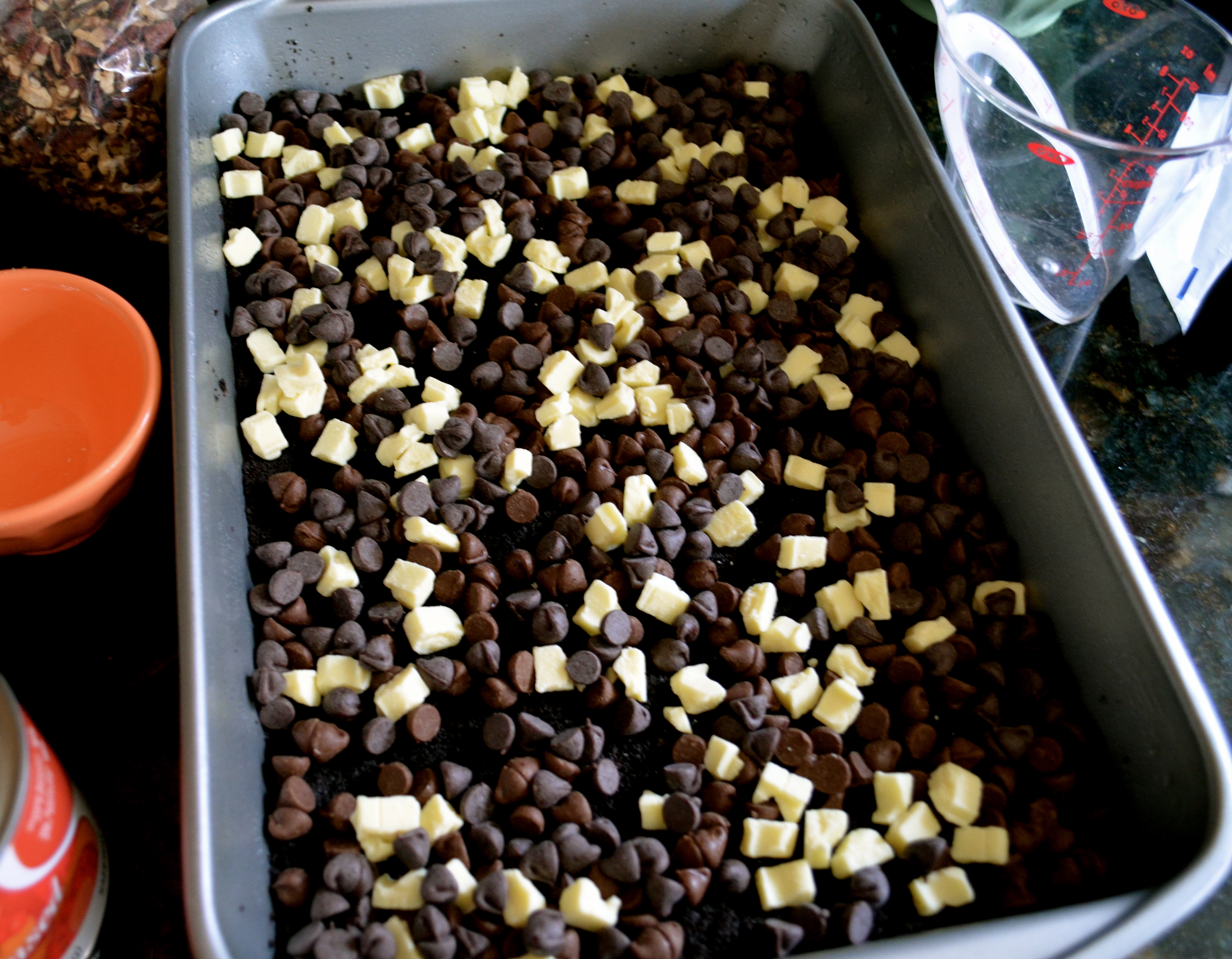 Once the crust is firmly packed down, sprinkle the white, milk and semi-sweet chocolate chips evenly over the crust.