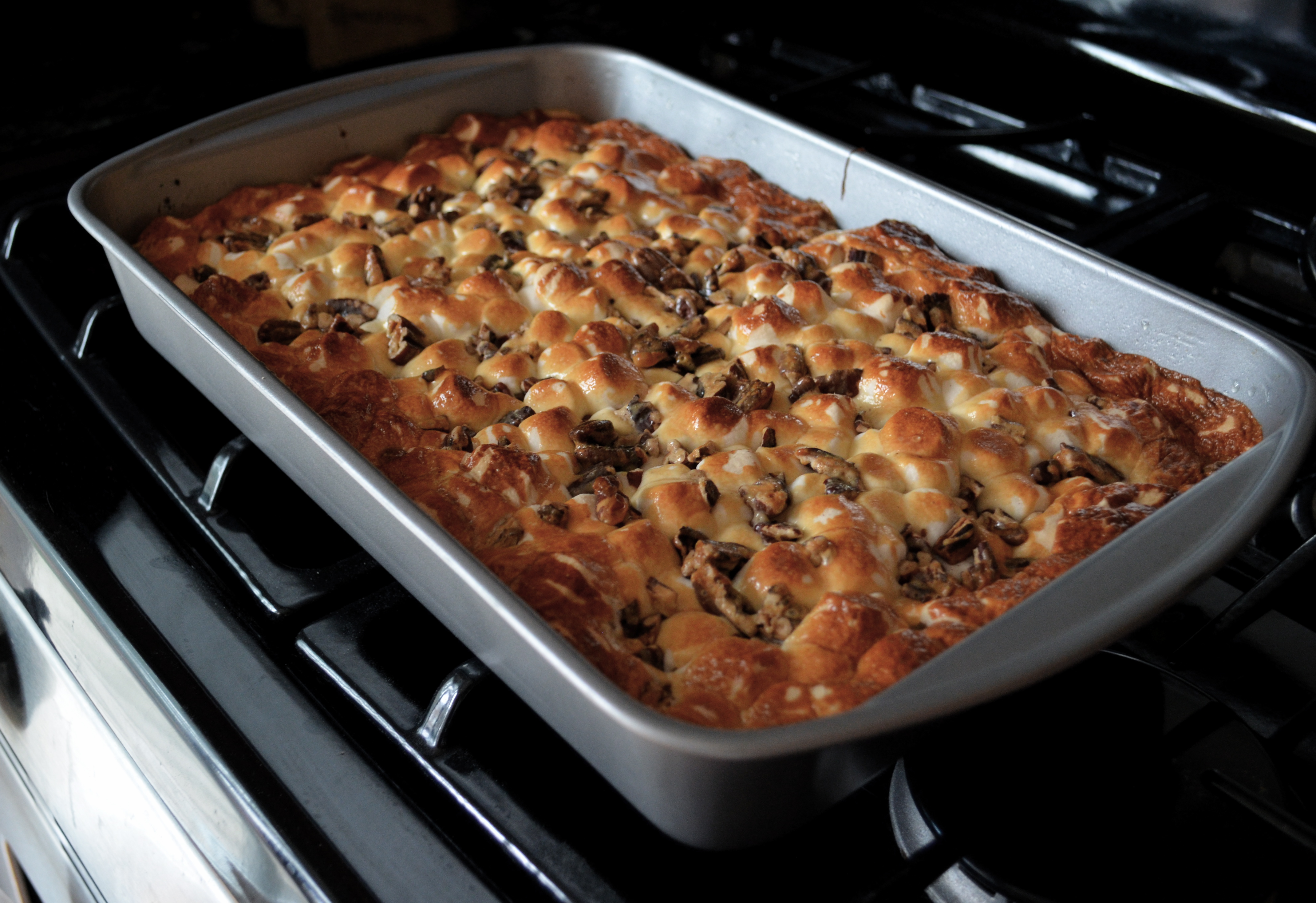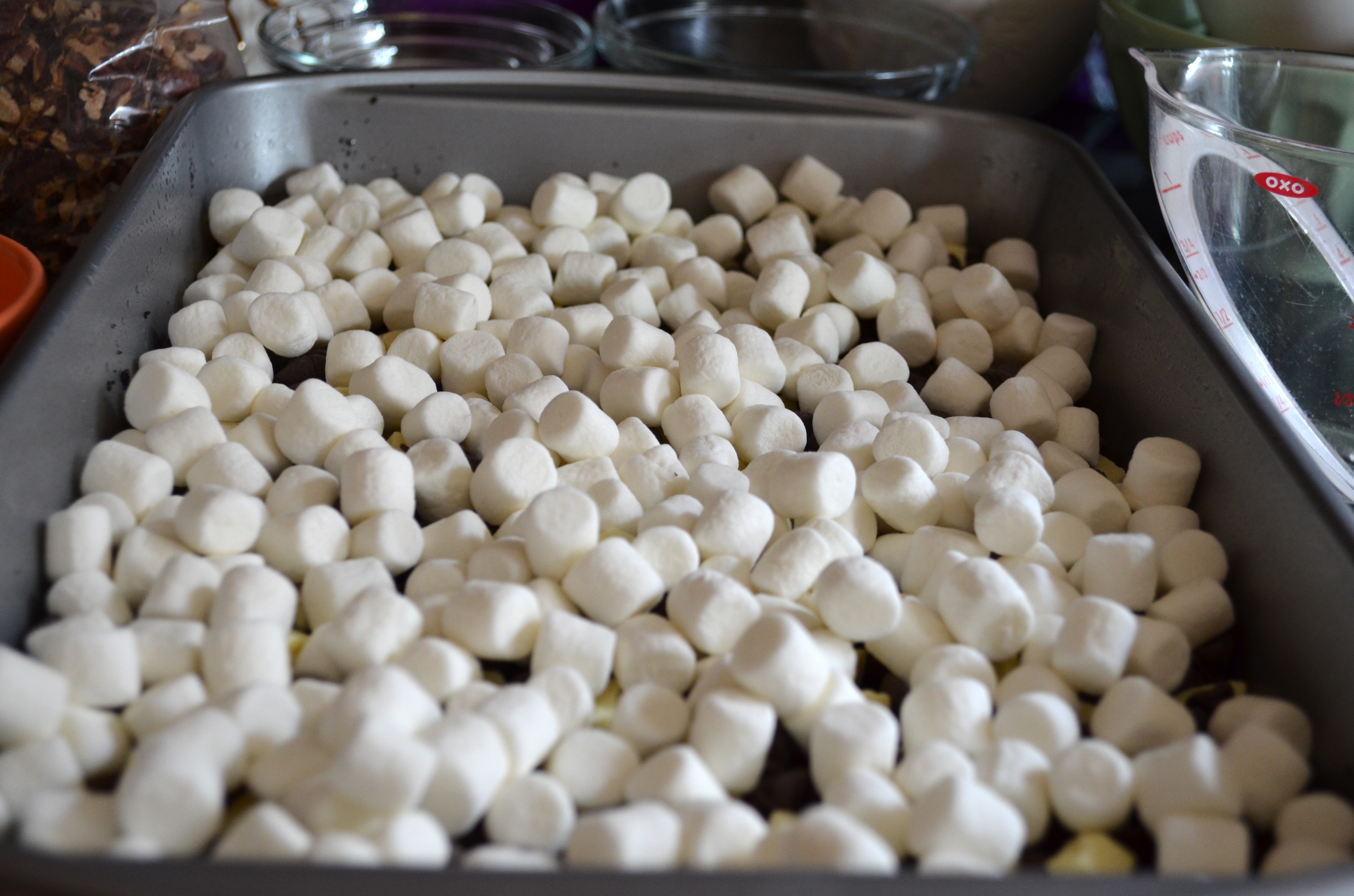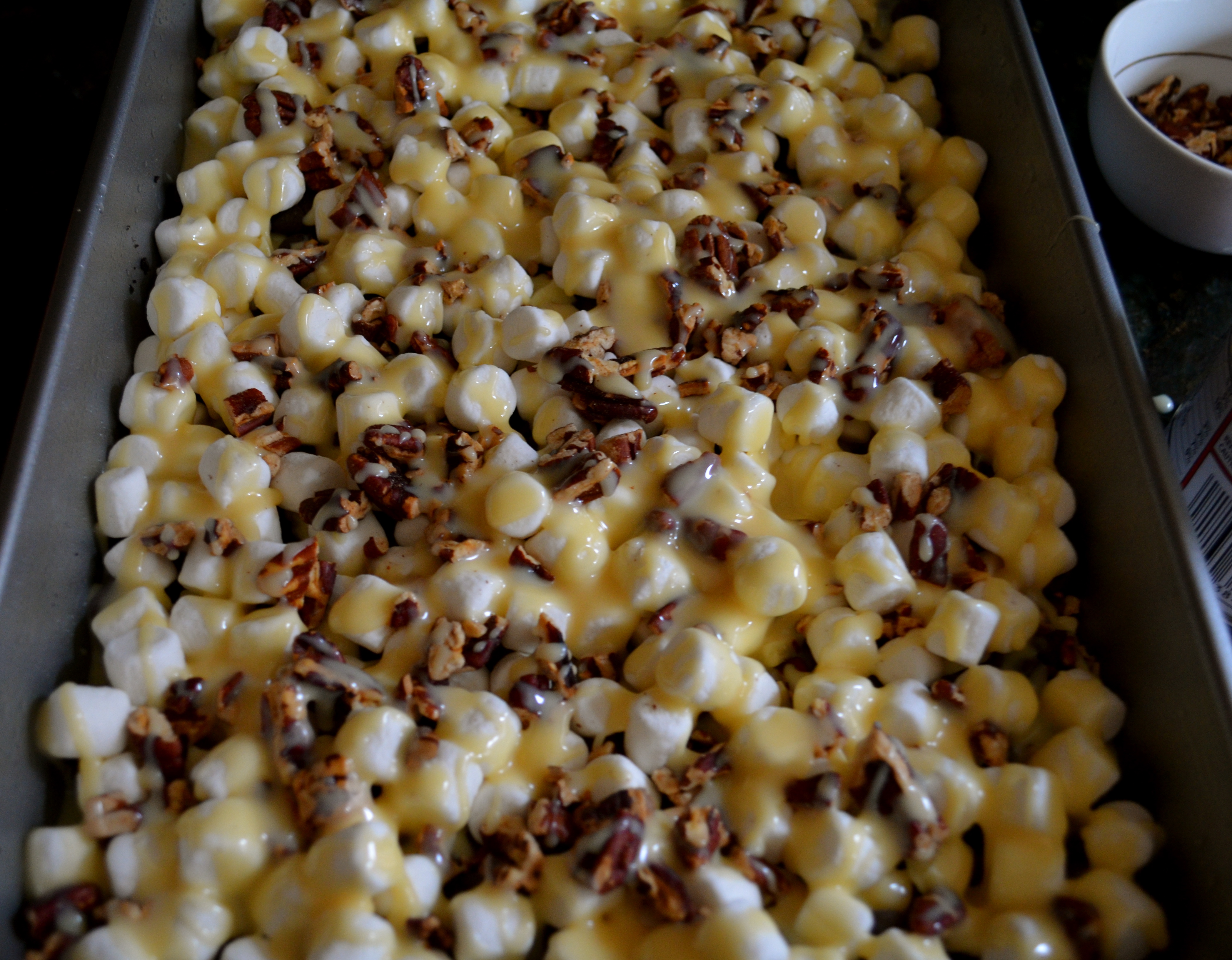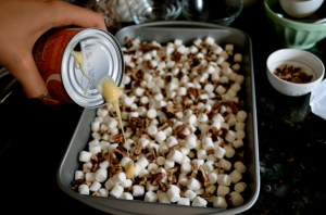 Next sprinkle the marshmallows on top of that and finish it off with the toasted pecans.