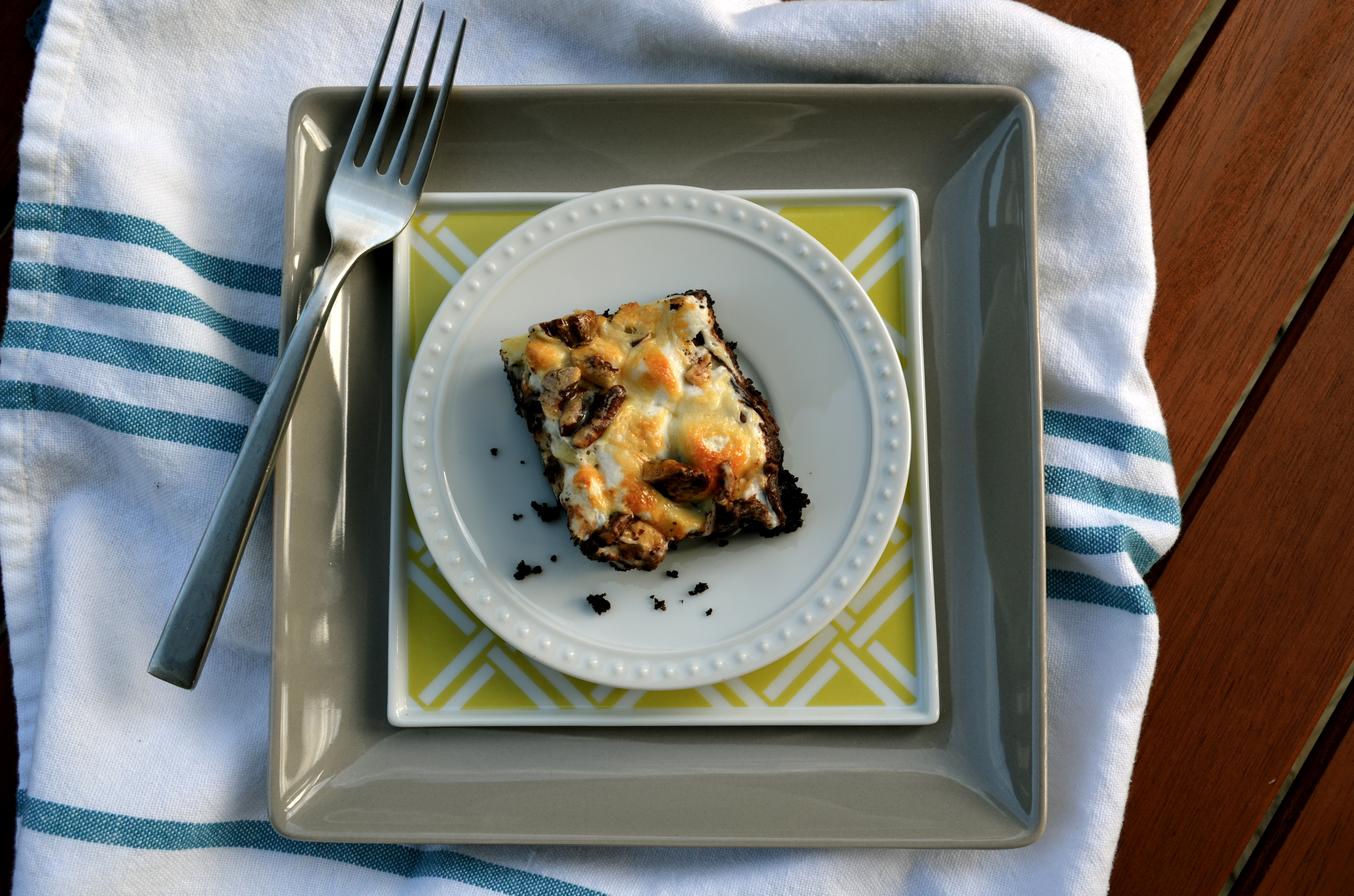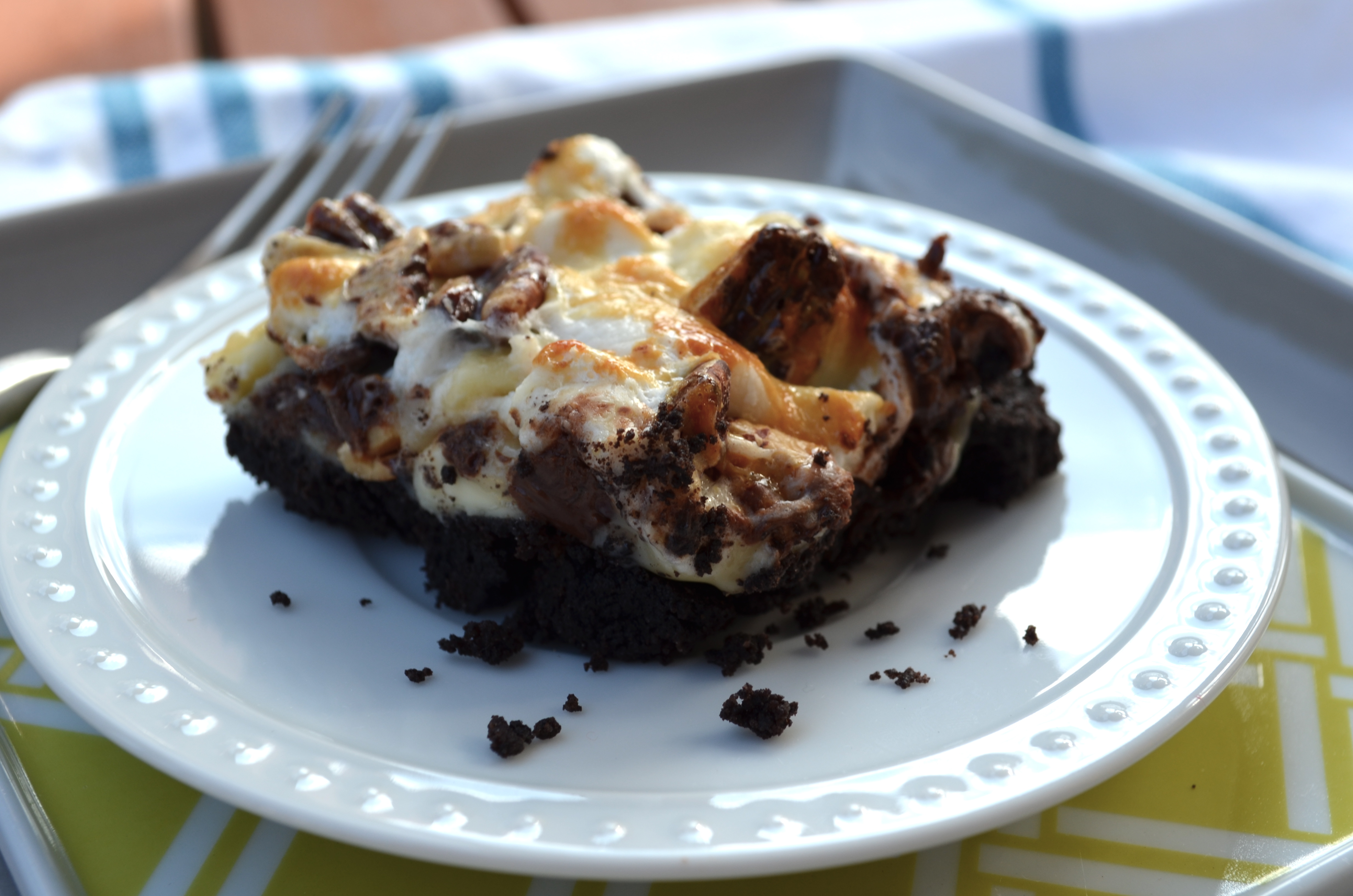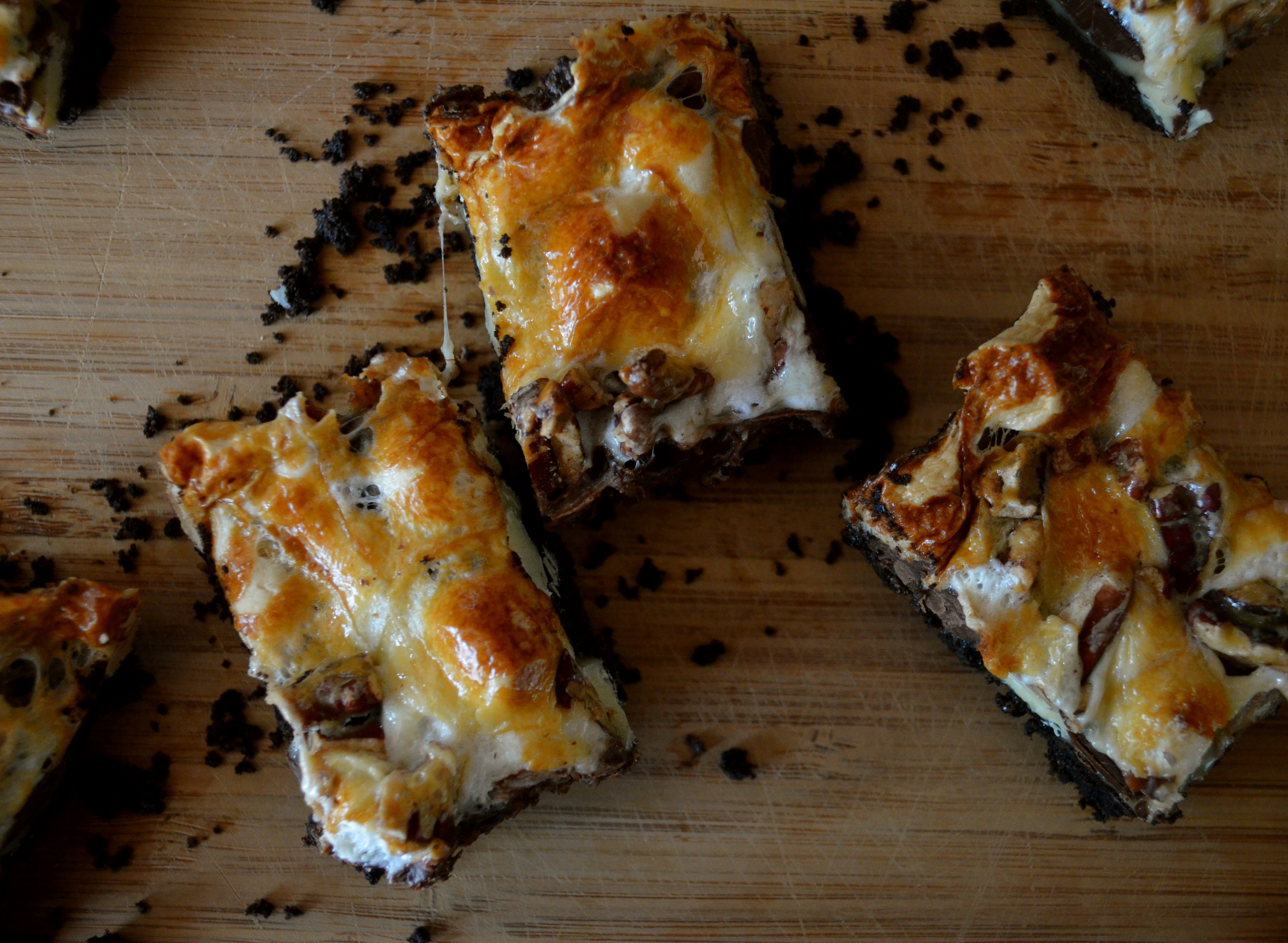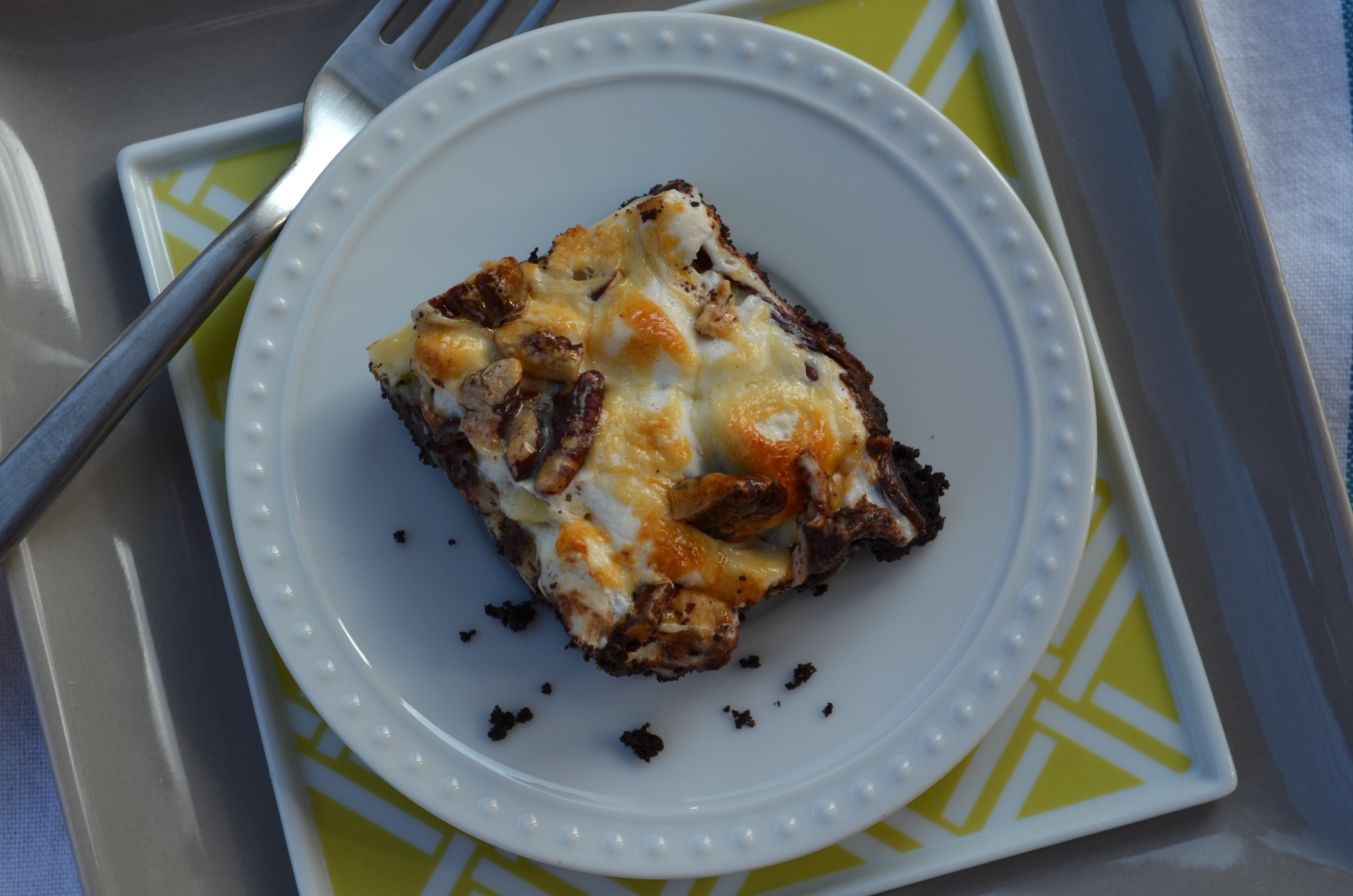 Next sprinkle the marshmallows on top of that and finish it off with the toasted pecans.