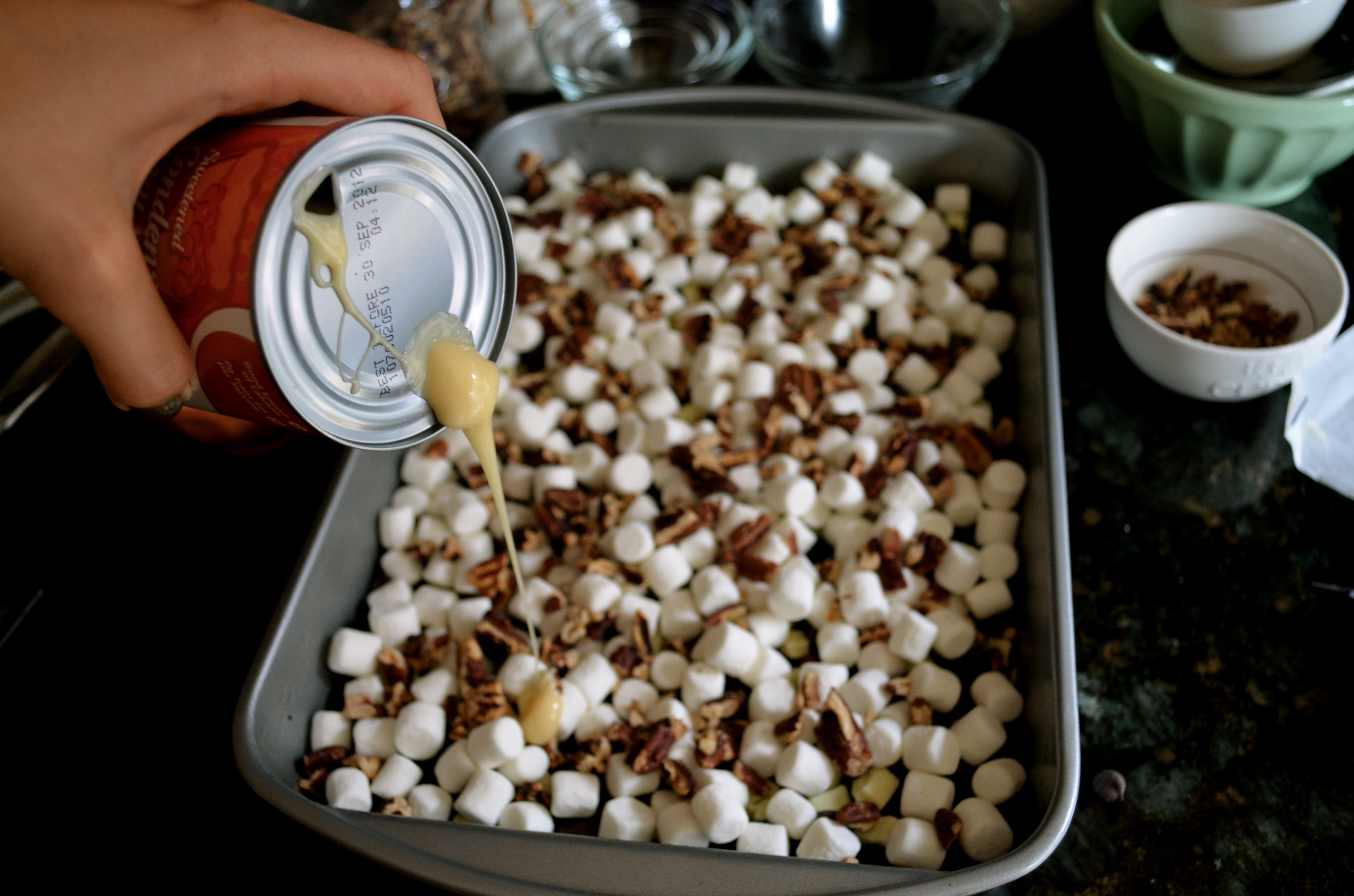 So the final step in this simple process is to drizzle the can of Sweet and condensed milk over the entire mixture. It may seem like a lot but it is what gives the bars the beautiful glazed marshmallows and gooey center.