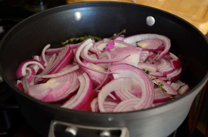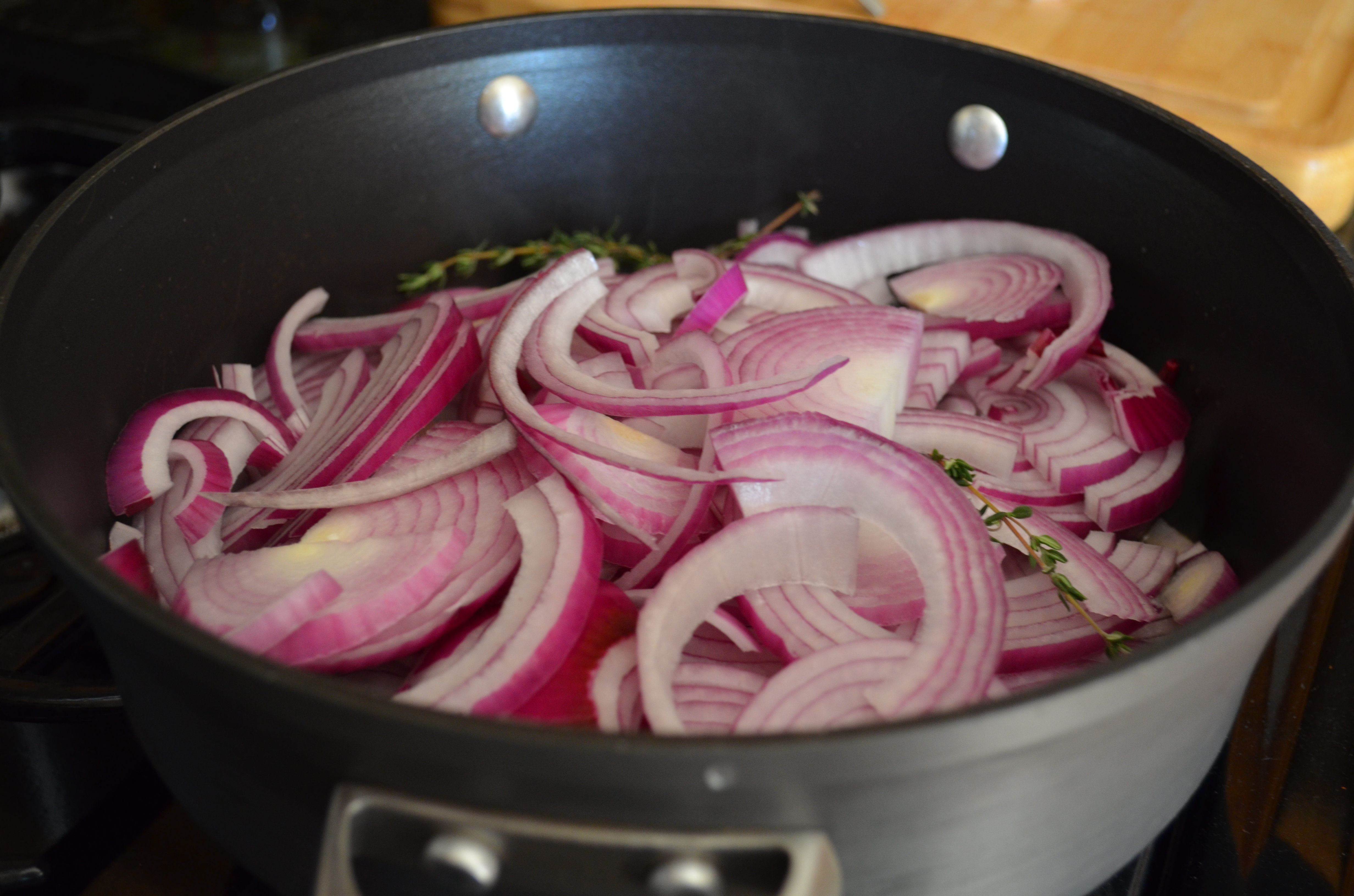 So to begin, heat olive oil over medium heat in a large pan. Once heated, add the  peeled, halved and sliced red onions along with three sprigs of fresh thyme to the pan.