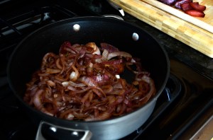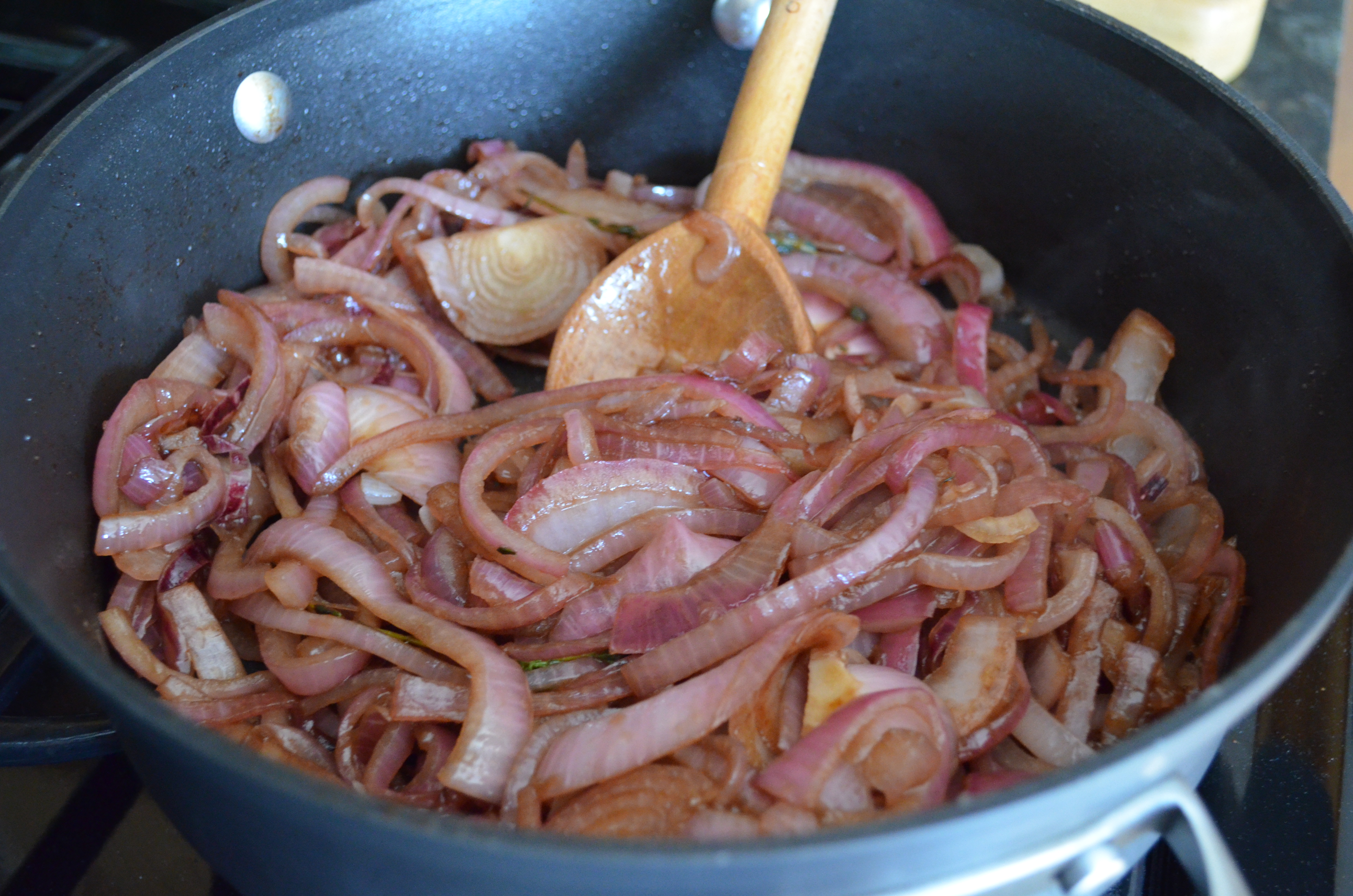 Then add the balsamic vinegar and salt and pepper to taste, allowing the onions to cook for about 5 minutes until the balsamic is reduced and no longer runny.