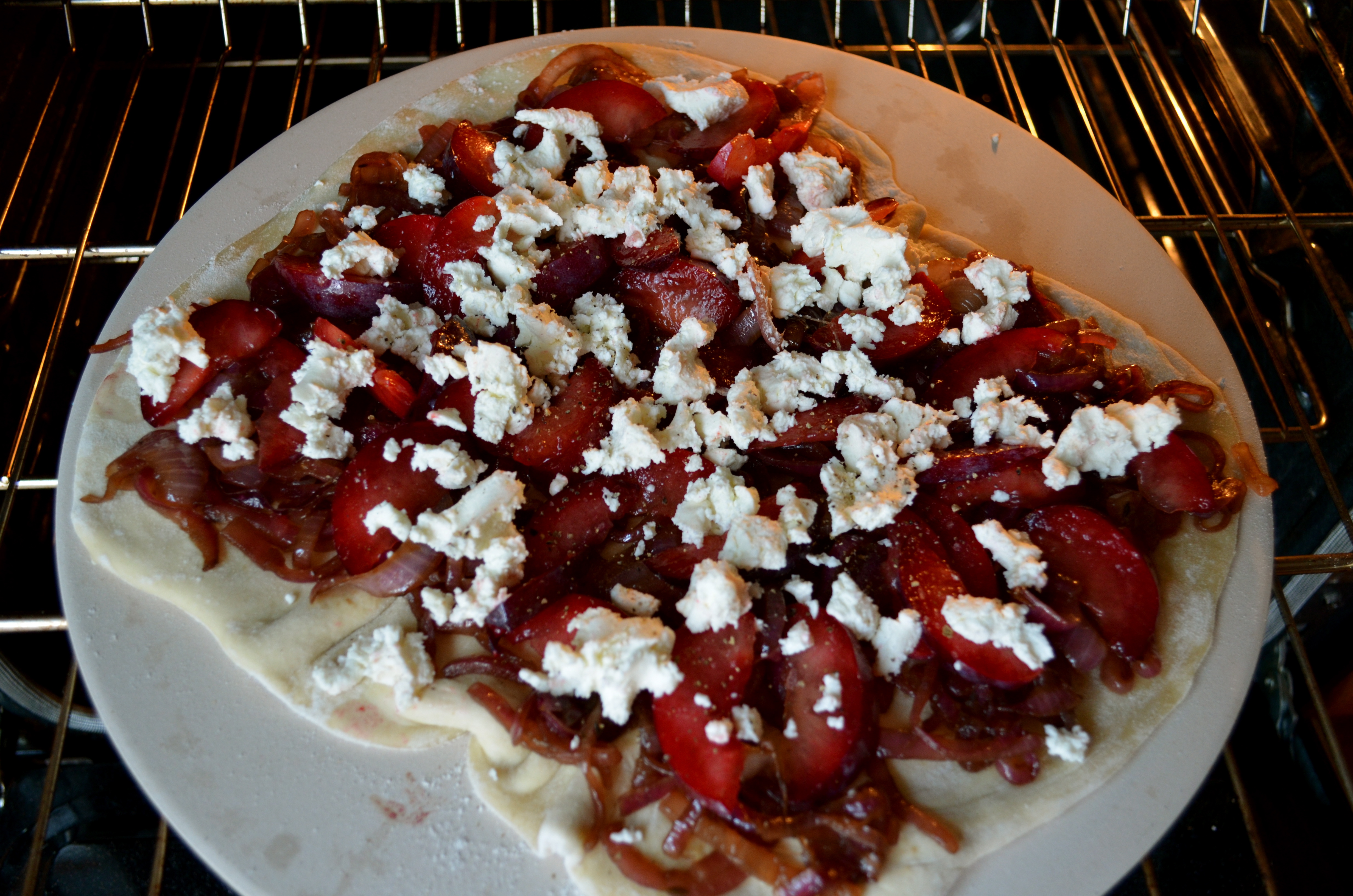 Evenly spread the caramelized onions over the dough, followed by the sliced plums. Finish by adding dots of goat cheese throughout the top of you pizza and slide that baby into the oven.