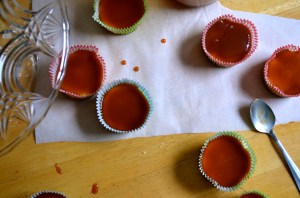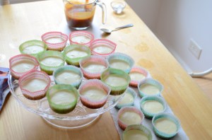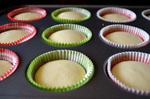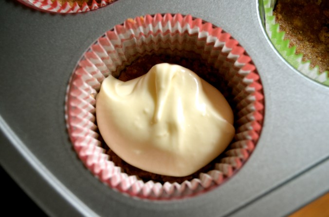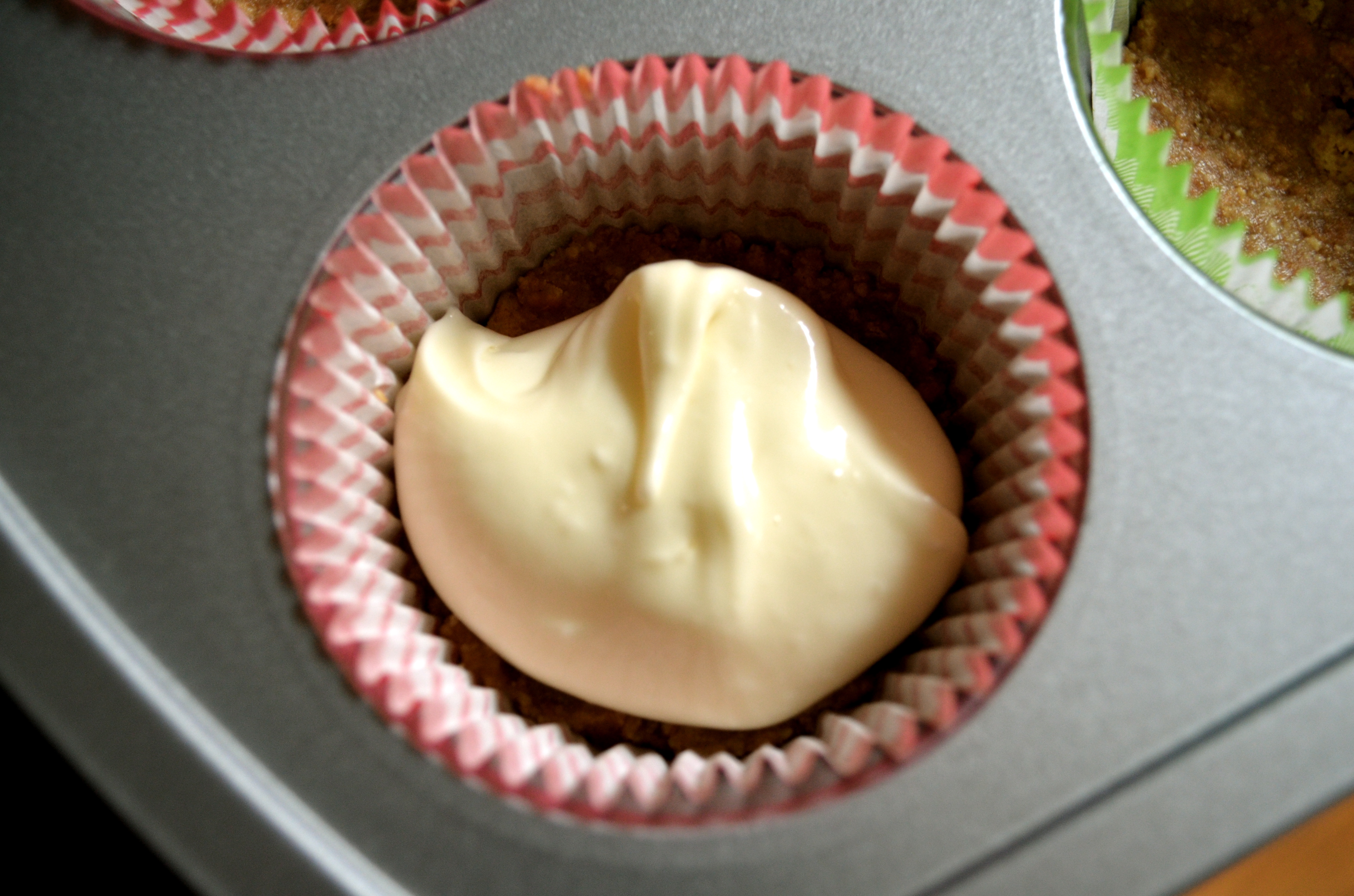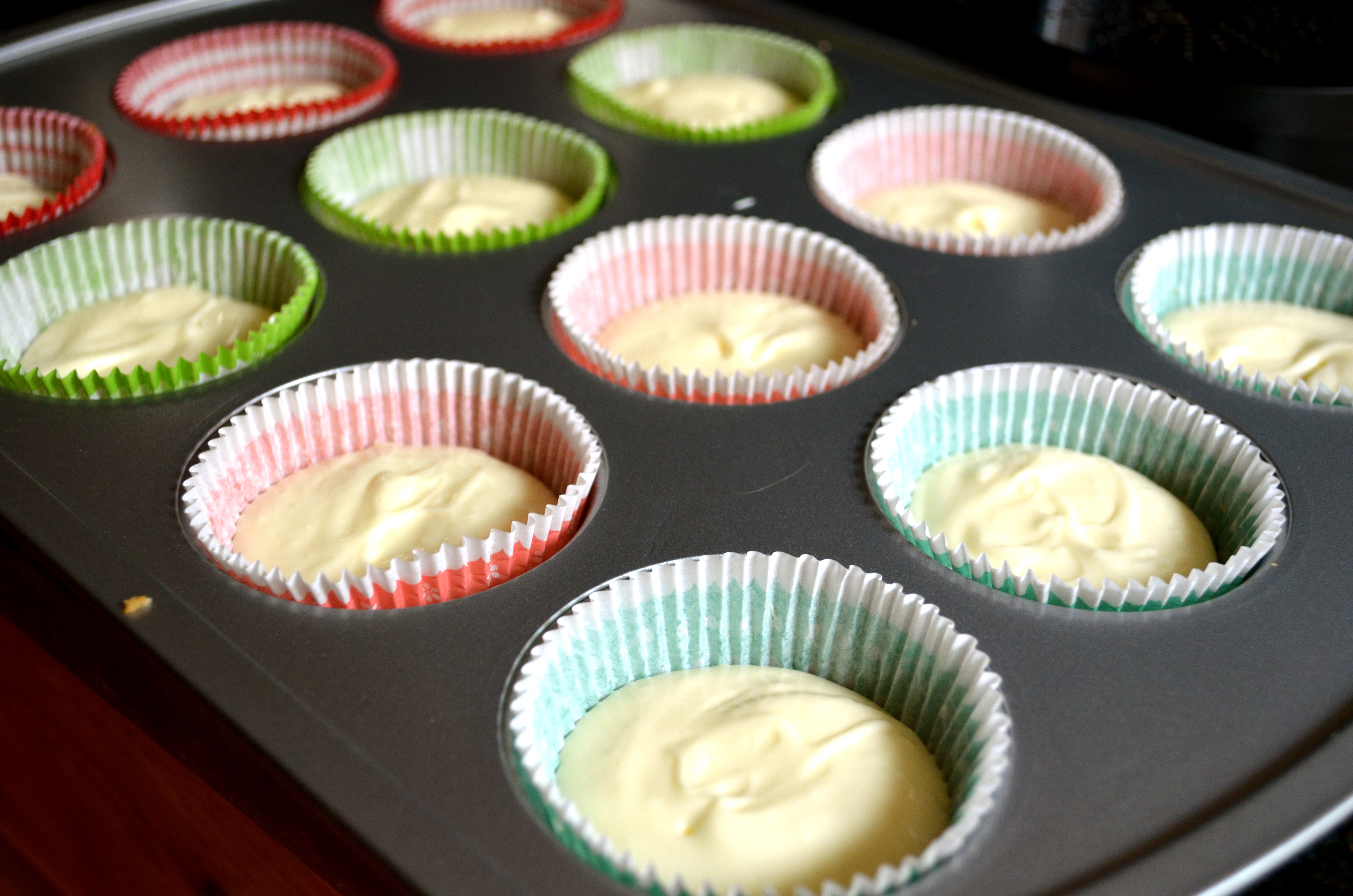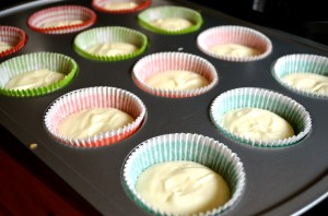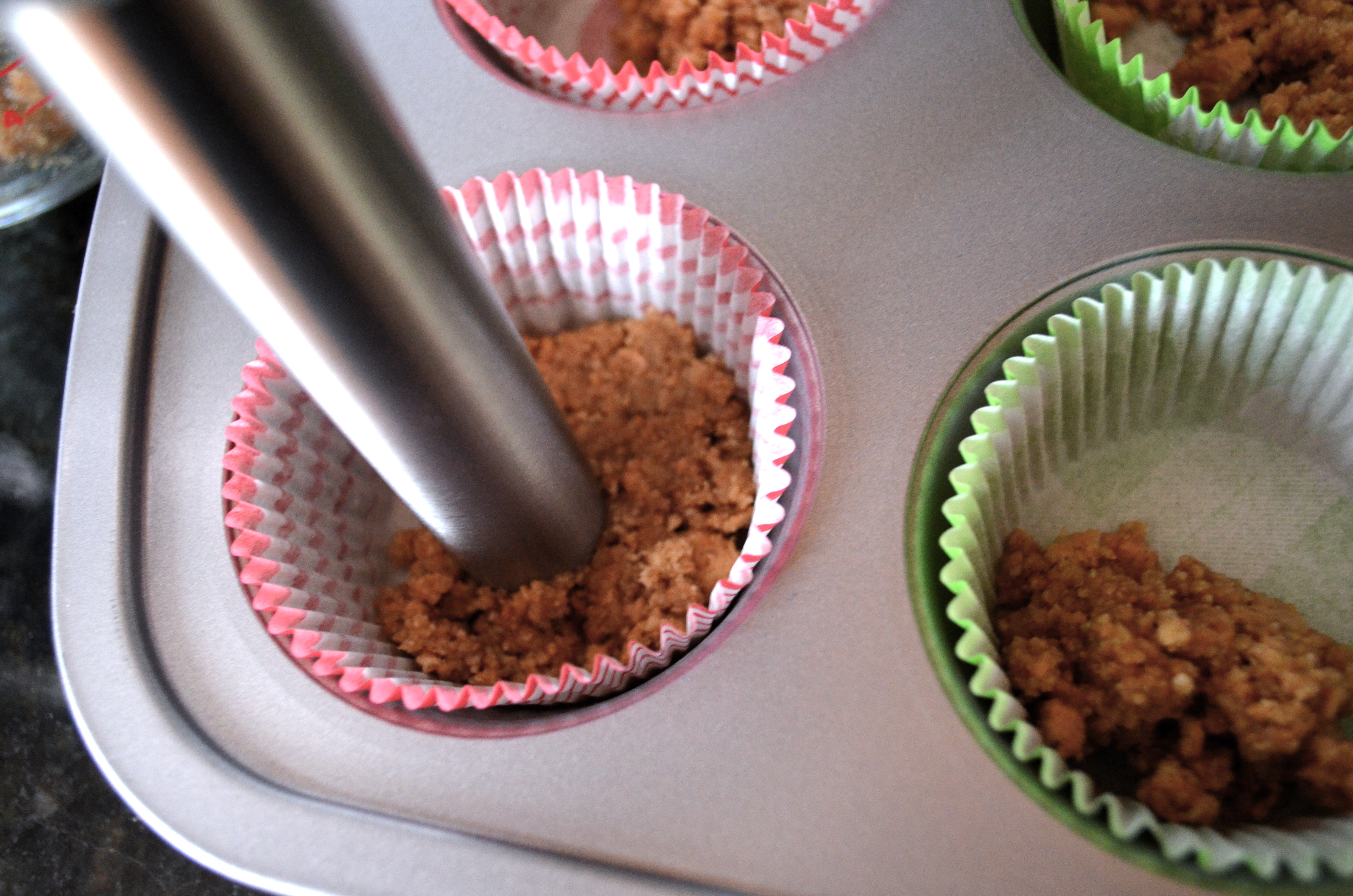 Line cupcake tins with liners and and cover bottom with about 1 tablespoon (more or less depending on preference) of graham cracker. Use fingers or a round, heavy object to firmly pack down crust.