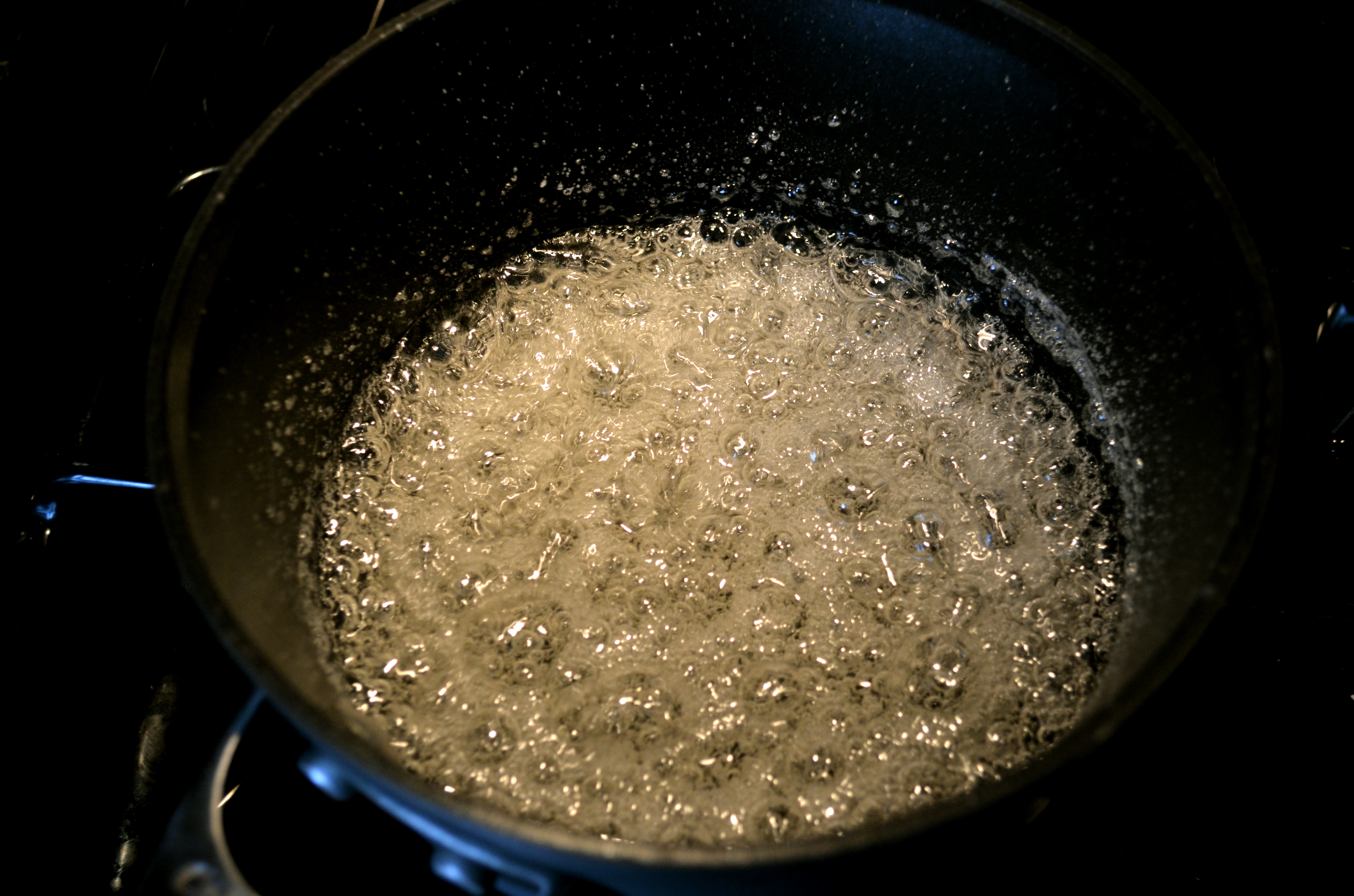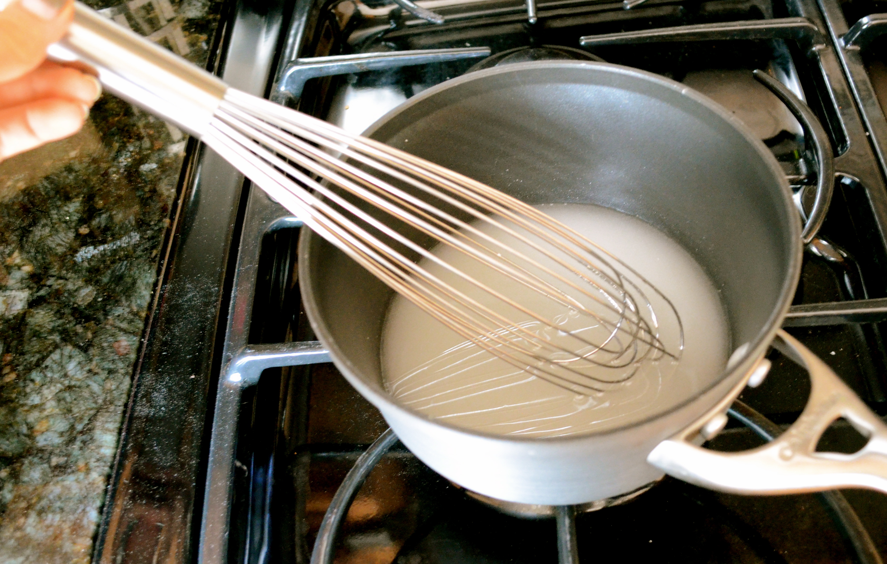 So you begin by adding the water and sugar to a pan over med. heat. Whisk the mixture until the sugar dissolves and then DO NOT STIR IT AGAIN!
