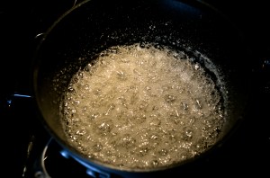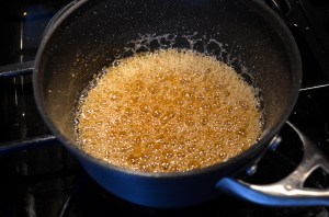 Increase heat to high. The mixture will begin to bubble but do NOT stir the liquid. Every once in a while use the handle to gently swirl the mixture