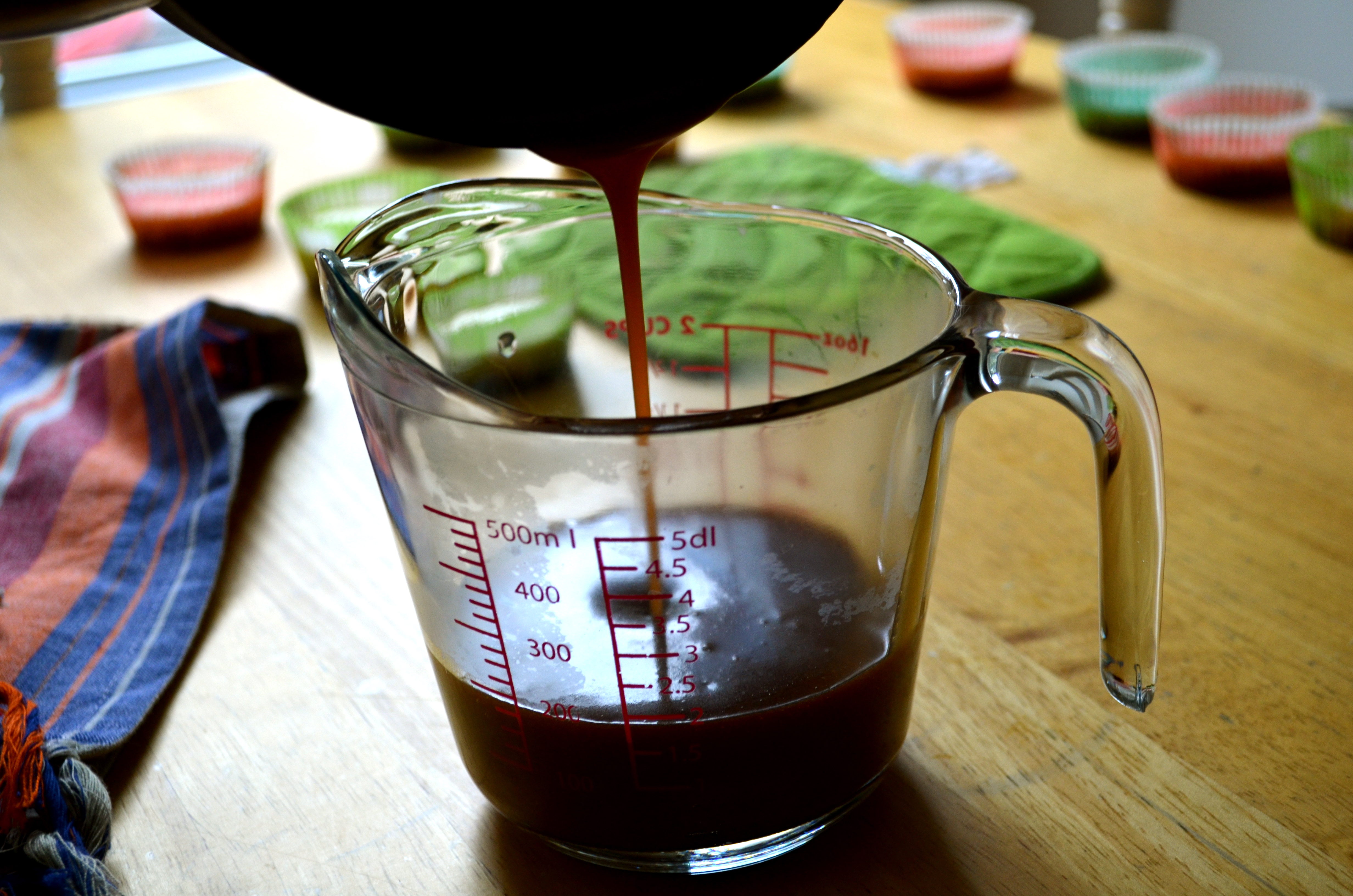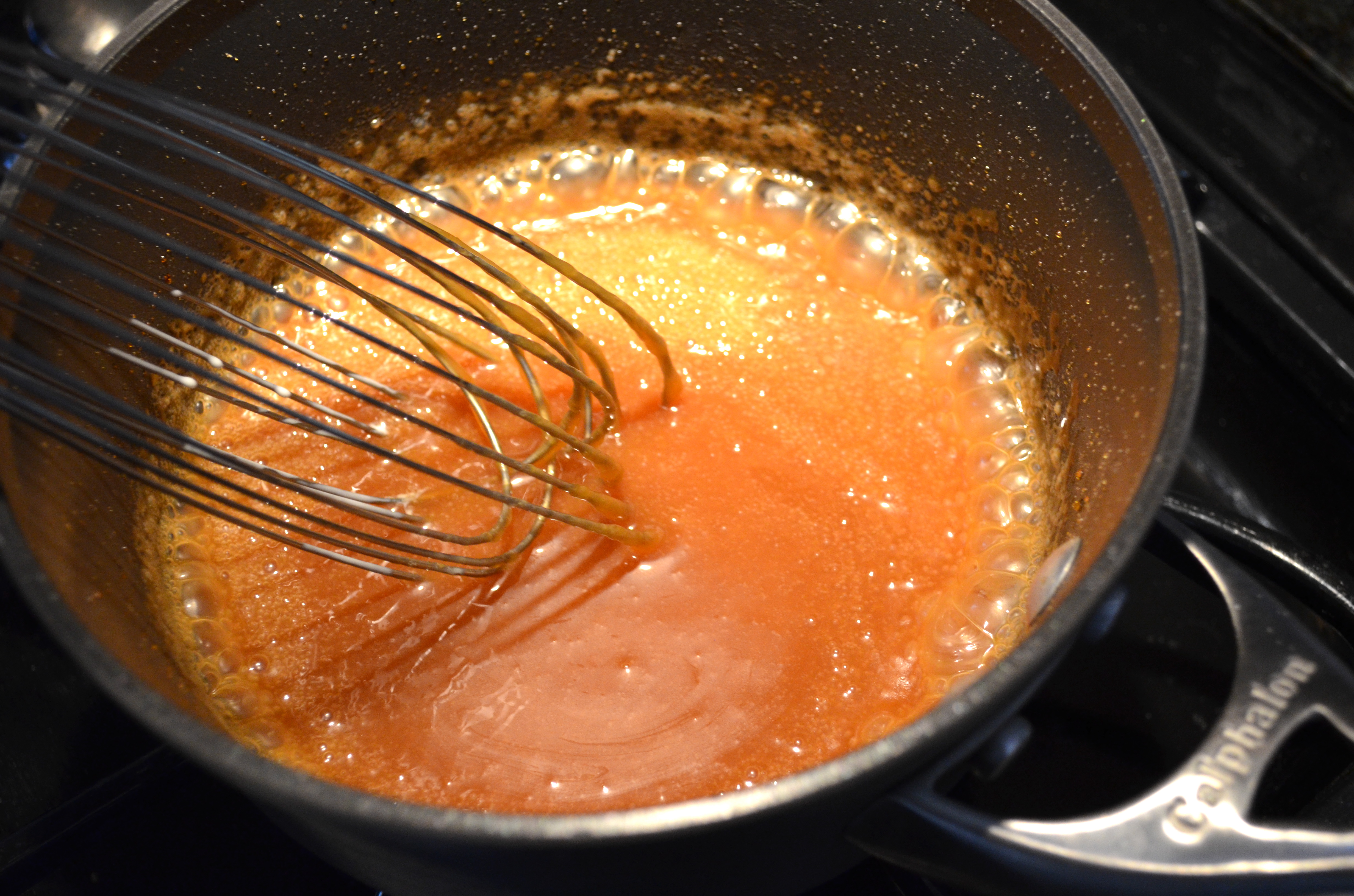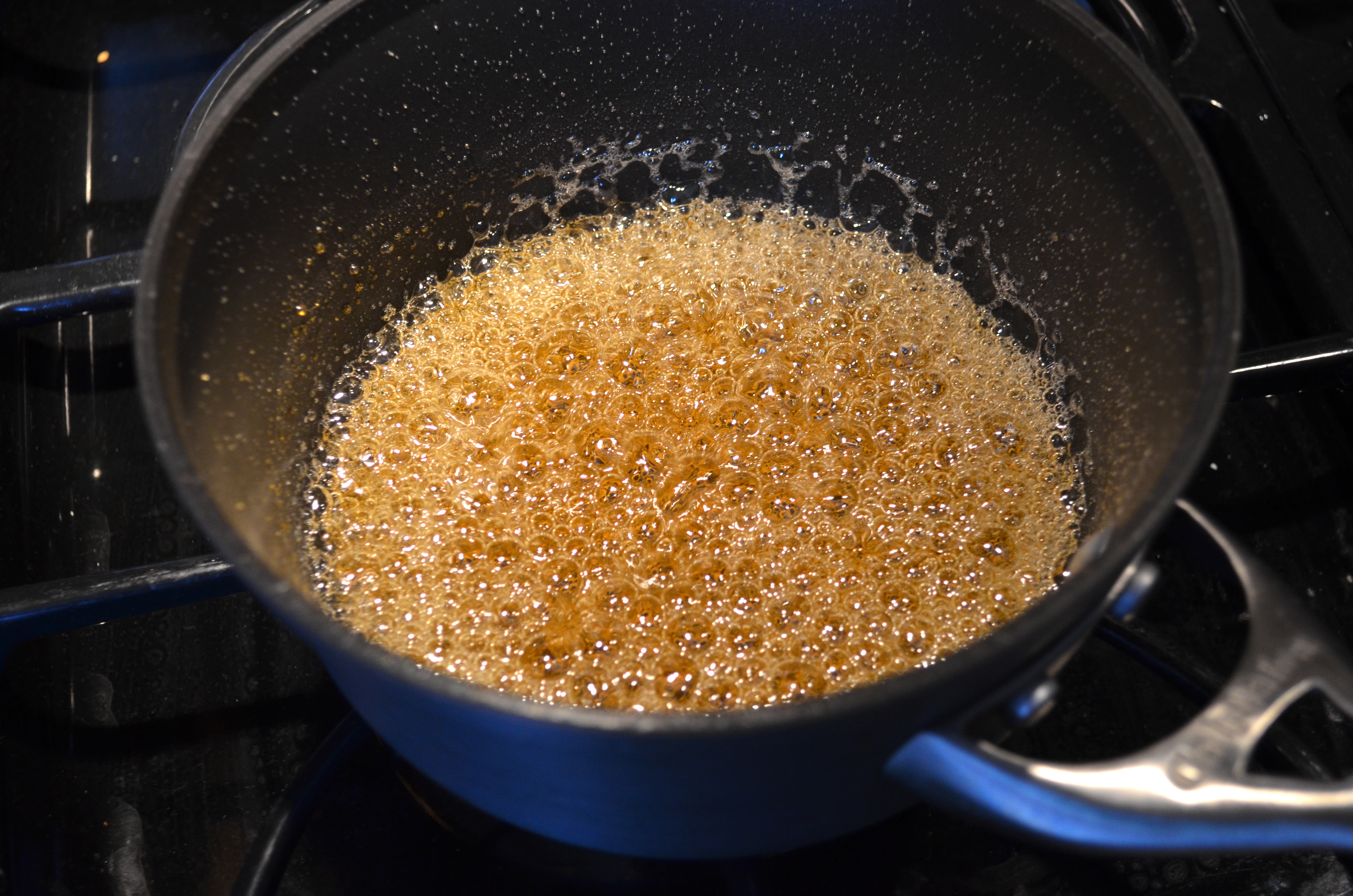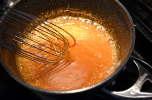 Once the mixture is a dark amber, turn off the heat and slowly add the cream. When adding the cream the mixture will bubble up quite a bit. Don’t be alarmed, this is supposed to happen! Once the cream is combined, set aside and let caramel cool.