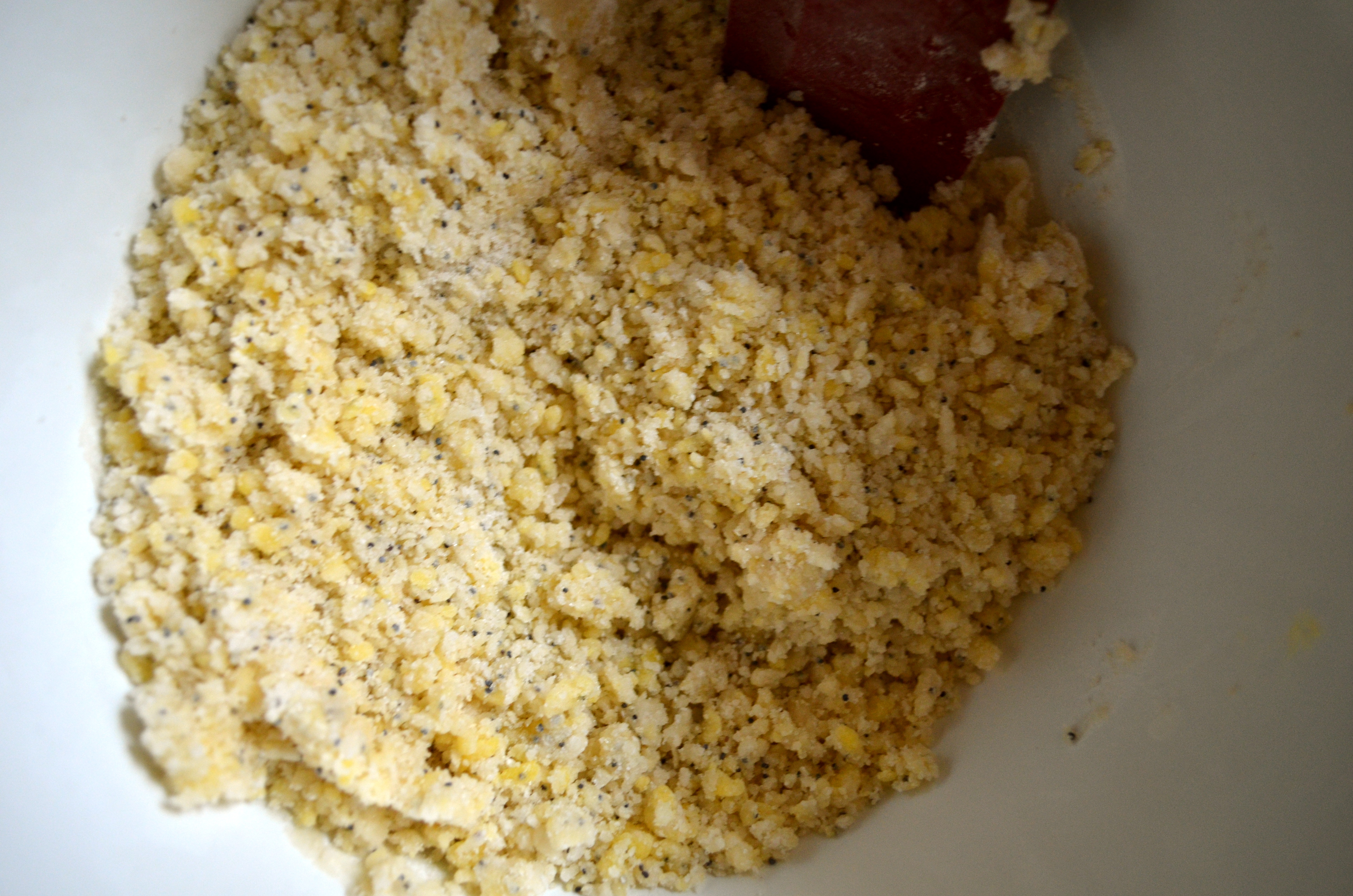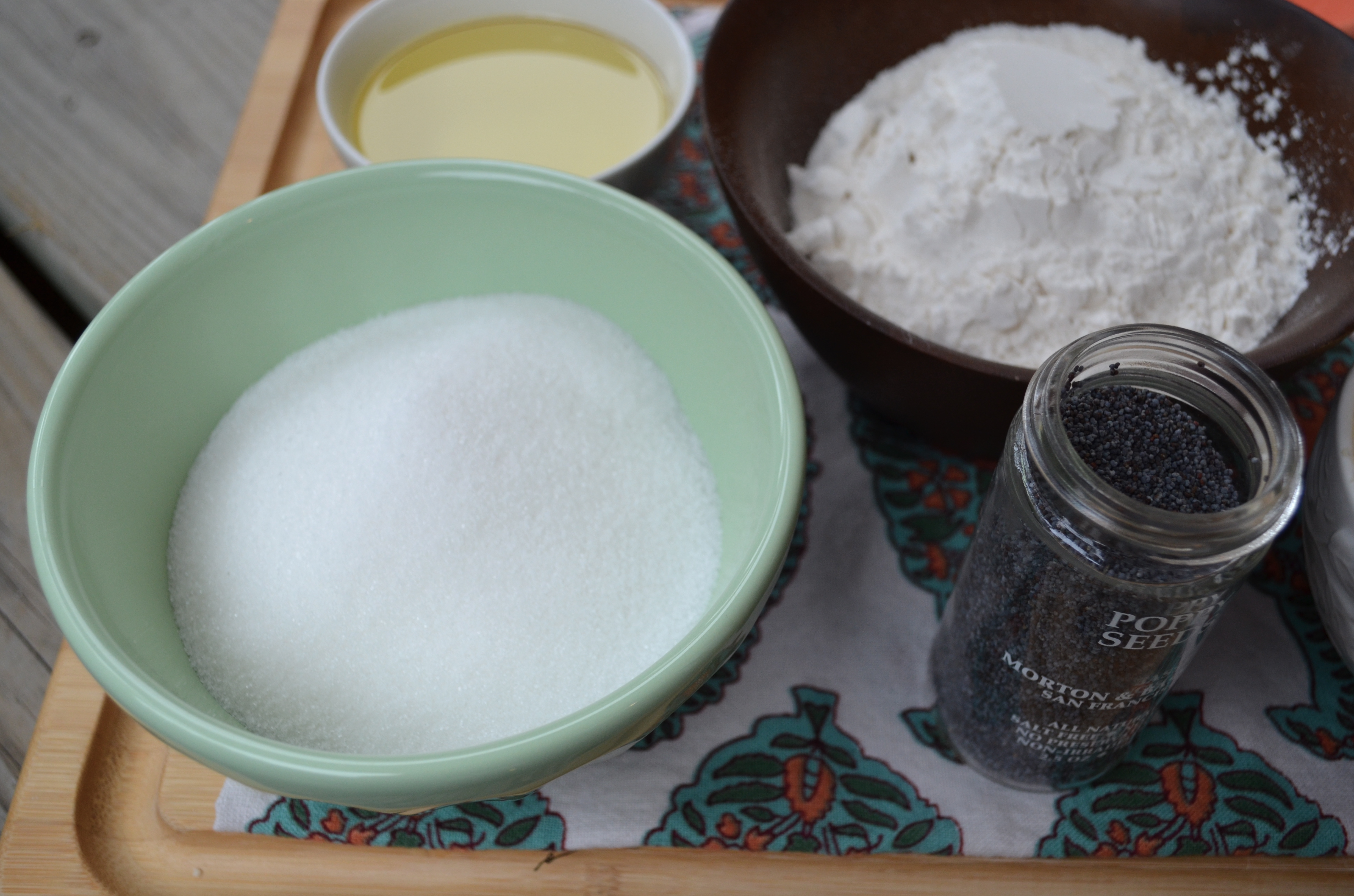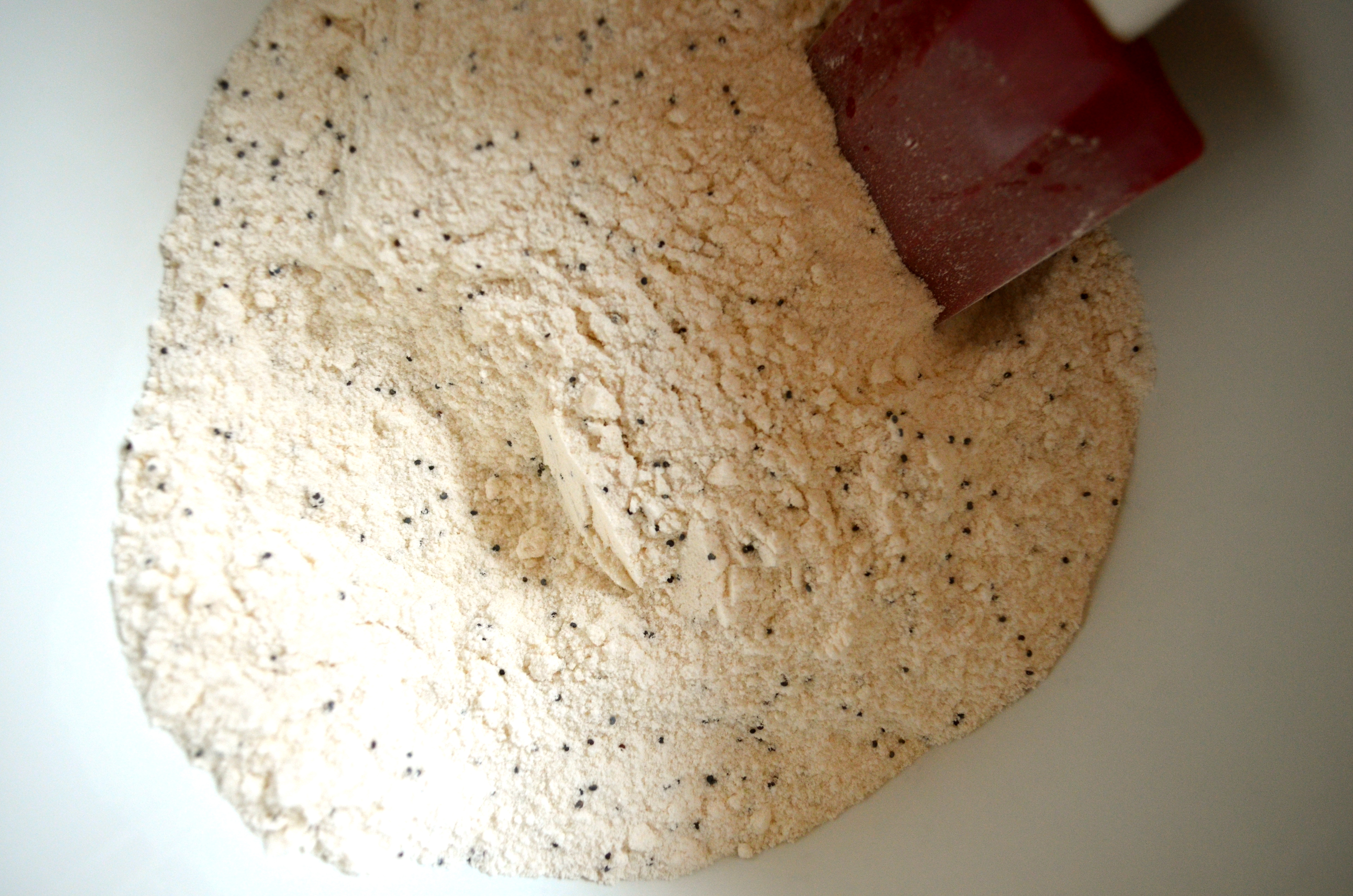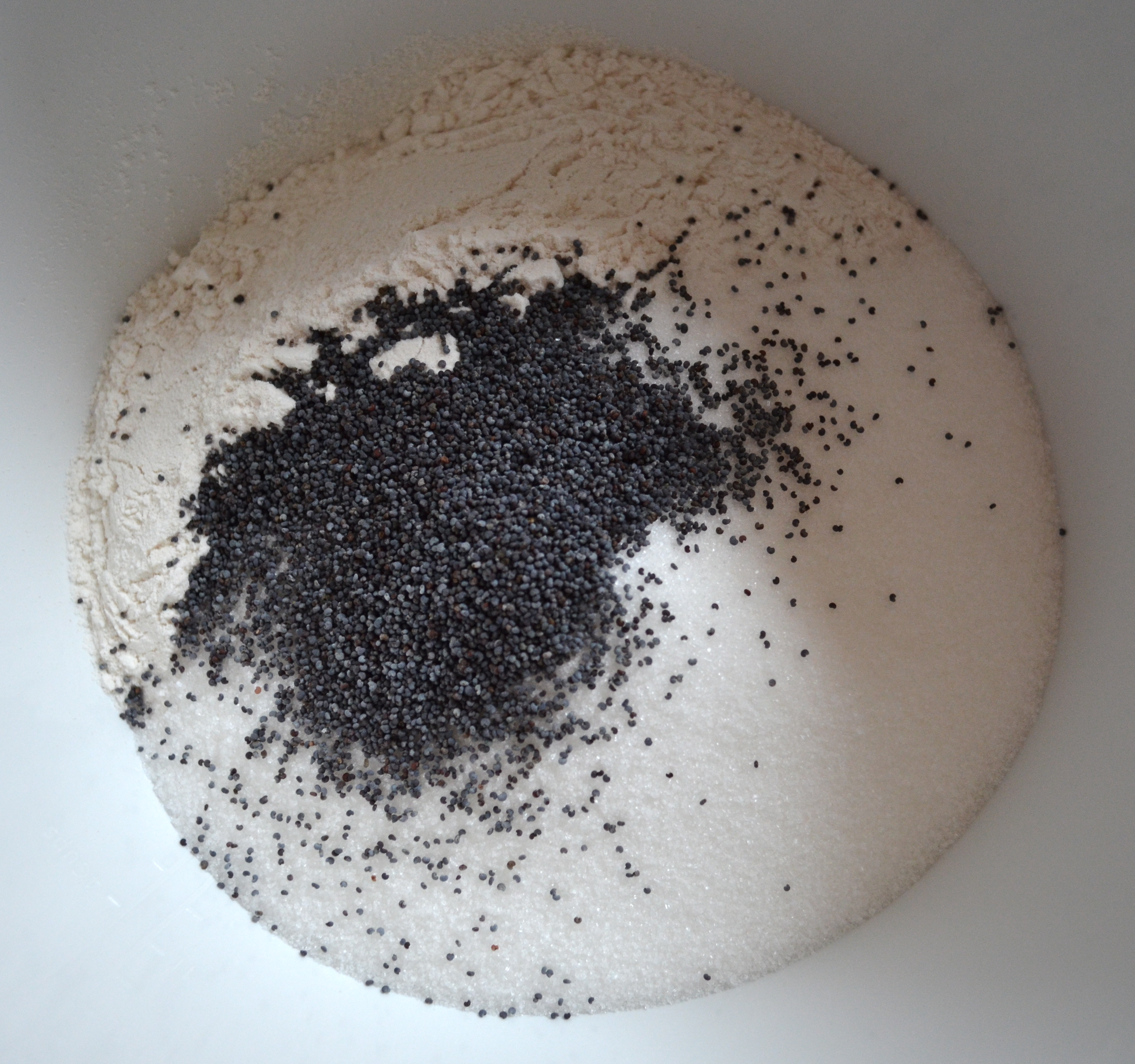 To begin you mix some poppy seeds, baking powder, salt, flour and sugar in a bowl.