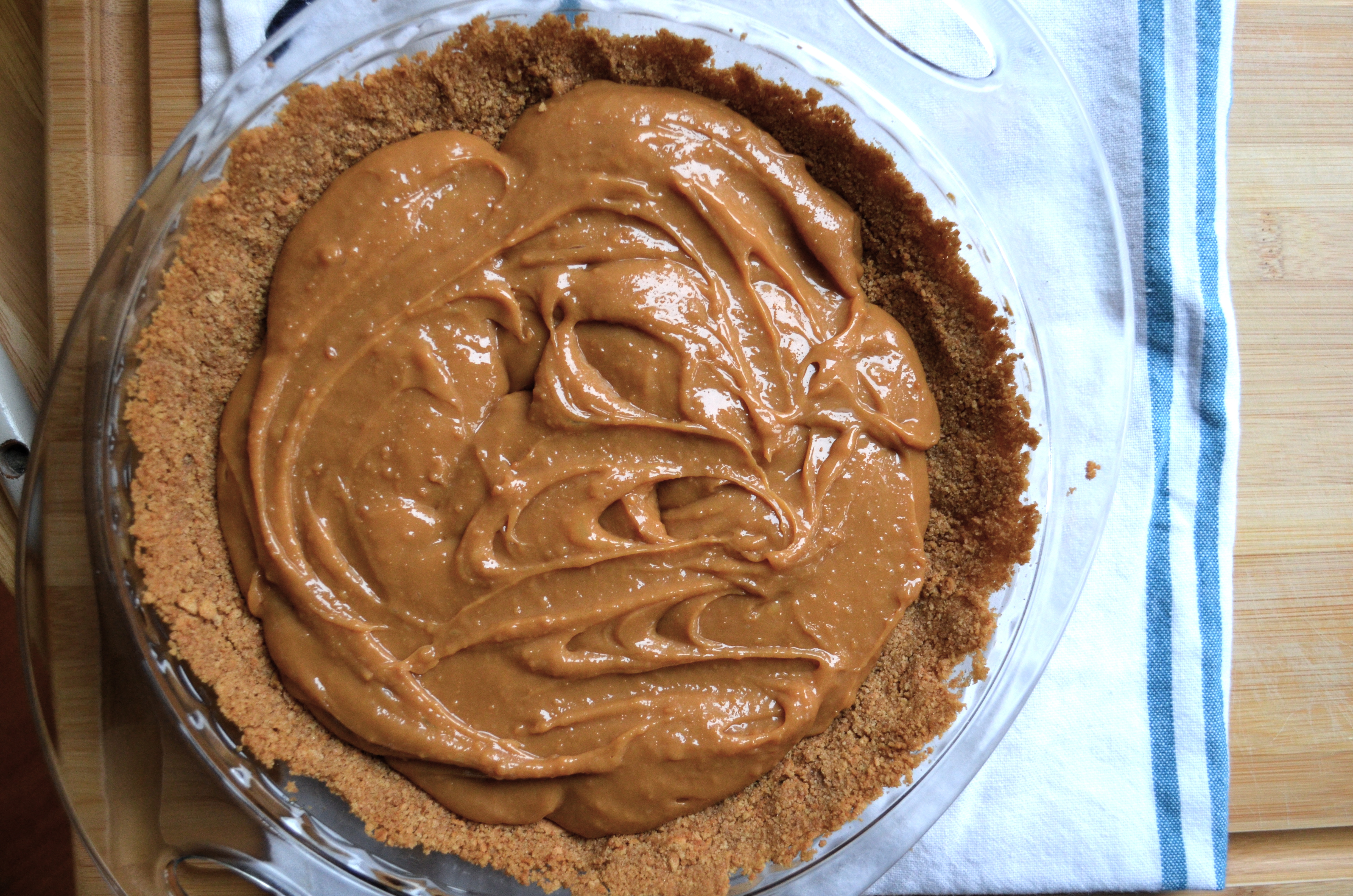 Scrape the caramel filling into the pie crust, smoothing the top. Spray a sheet of plastic wrap with vegetable oil spray and cover the pie. Refrigerate until the filling is chilled and set, at least 4 hours.