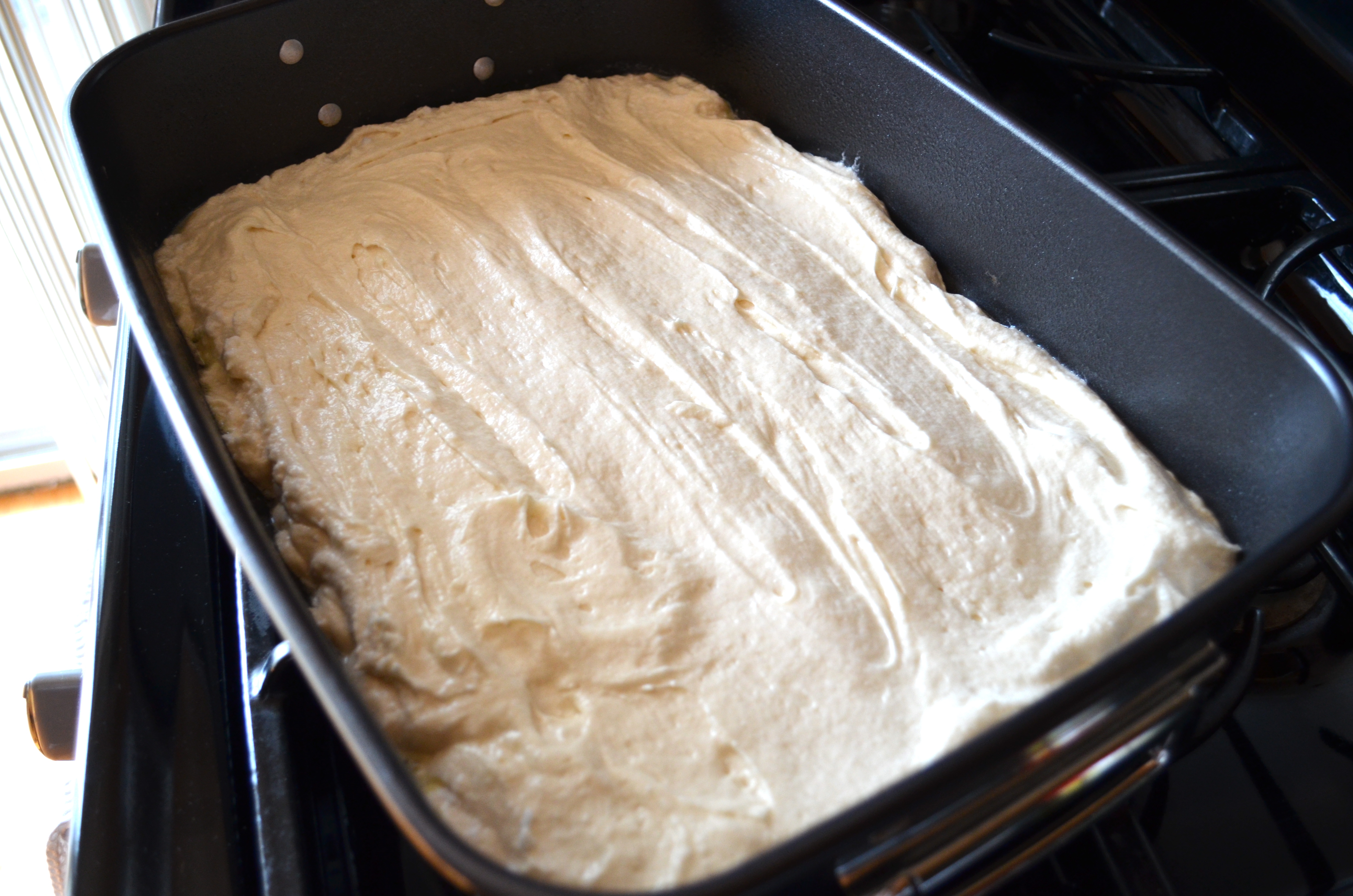 Spread in a well-greased pan. As you saw, I used a roasting pan. You want a large pan to allow the dough to rise a bit, but also to be thin. You could do it in a 9×13, but I think it would be too thick and not cook evenly. You may end up with a burnt crust. If you have a cake pan with higher sides that would be best, but I used a roasting pan and it worked perfectly.