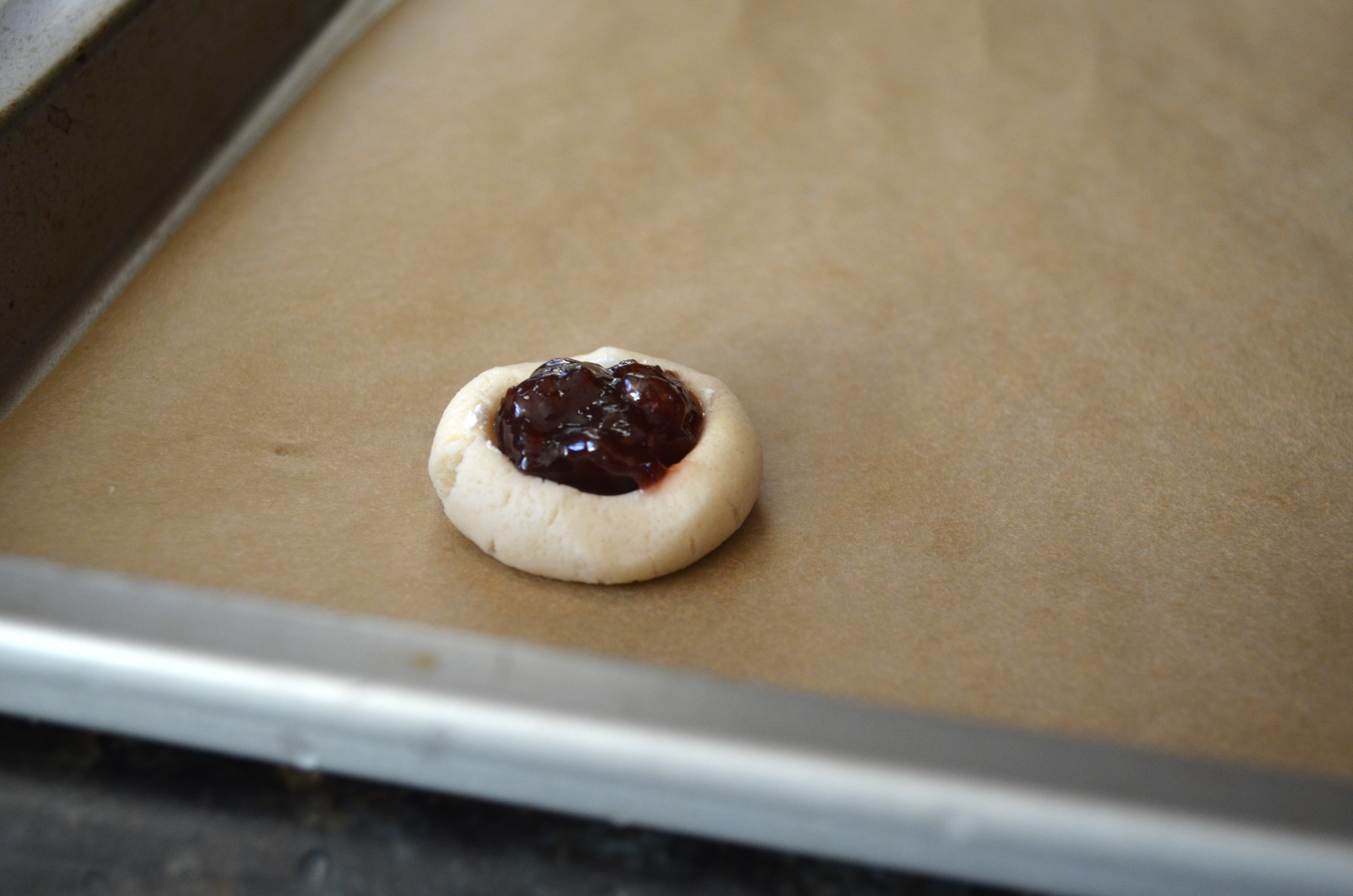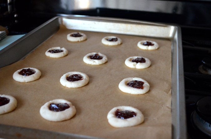 Fill a small dish with extra flour and use a 1 Teaspoon measuring spoon to create a “thumbprint” in each cookie. Roll dough into balls and coat the bottom of the measuring spoon with flour and press into dough. Once dent is made, fill with about 1 tablespoon of jelly.
