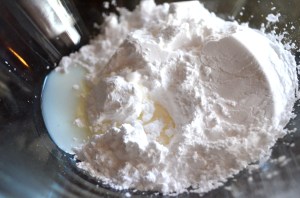 Combine the powdered sugar, almond extract and milk. Be very careful in adding the liquids to the sugar!!! You only need a tiny amount of milk to make the frosting. If you add too much milk, you can always add more sugar.
