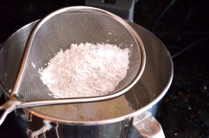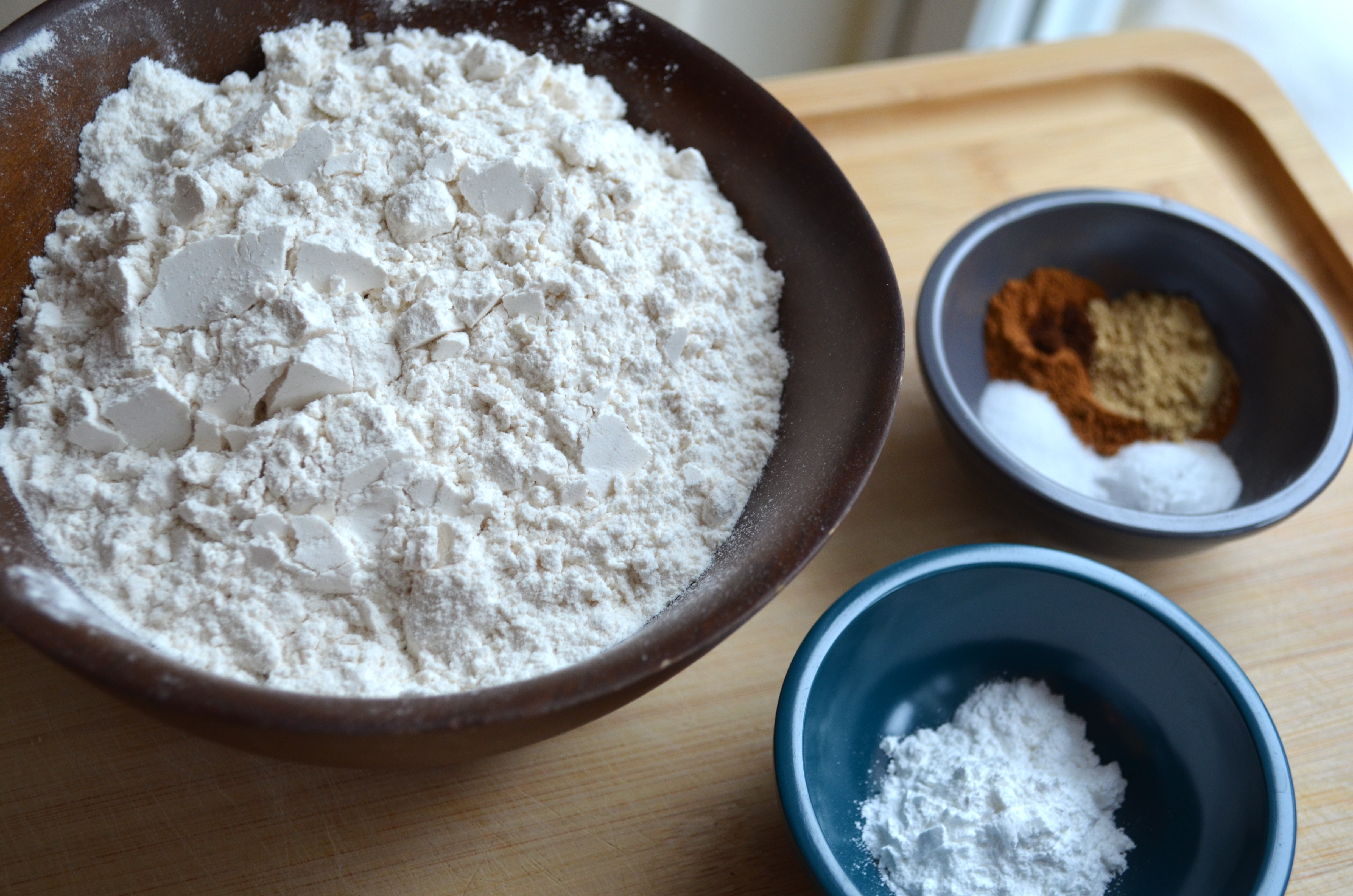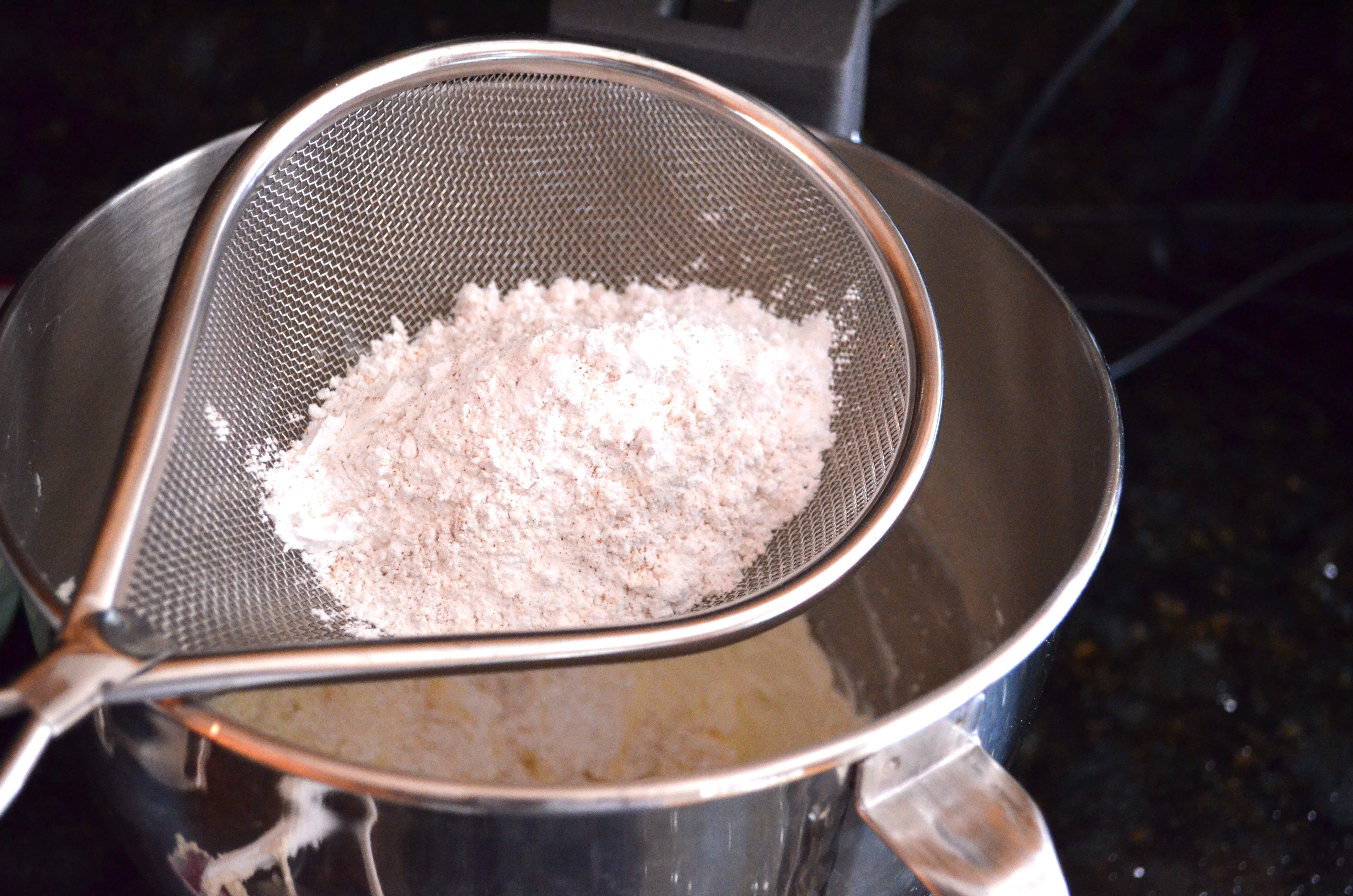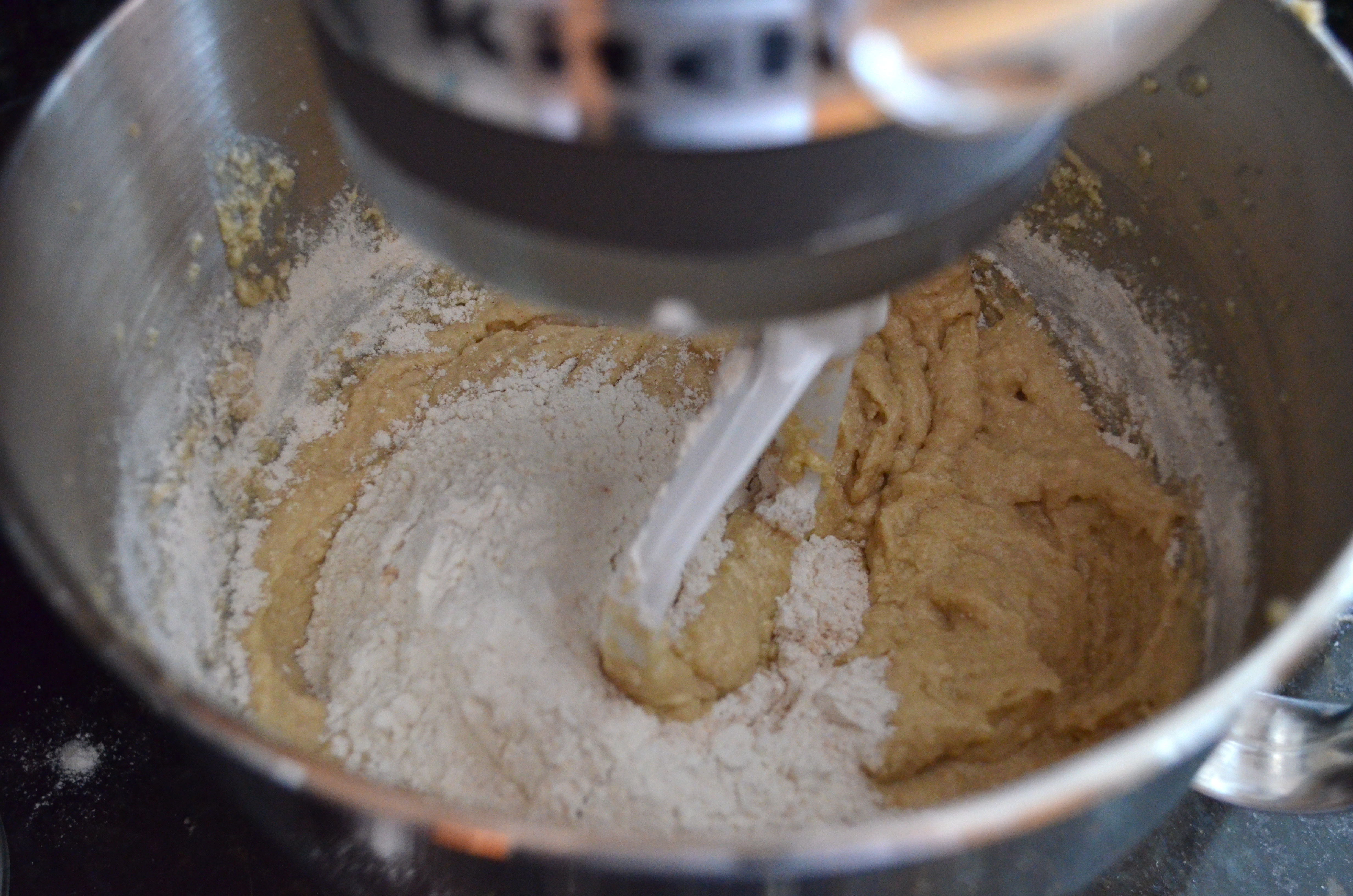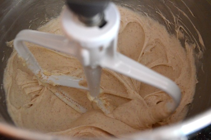In a separate bowl, stir together flour, baking powder, baking soda, salt and spices. Slowly add dry ingredients to batter until just combined.