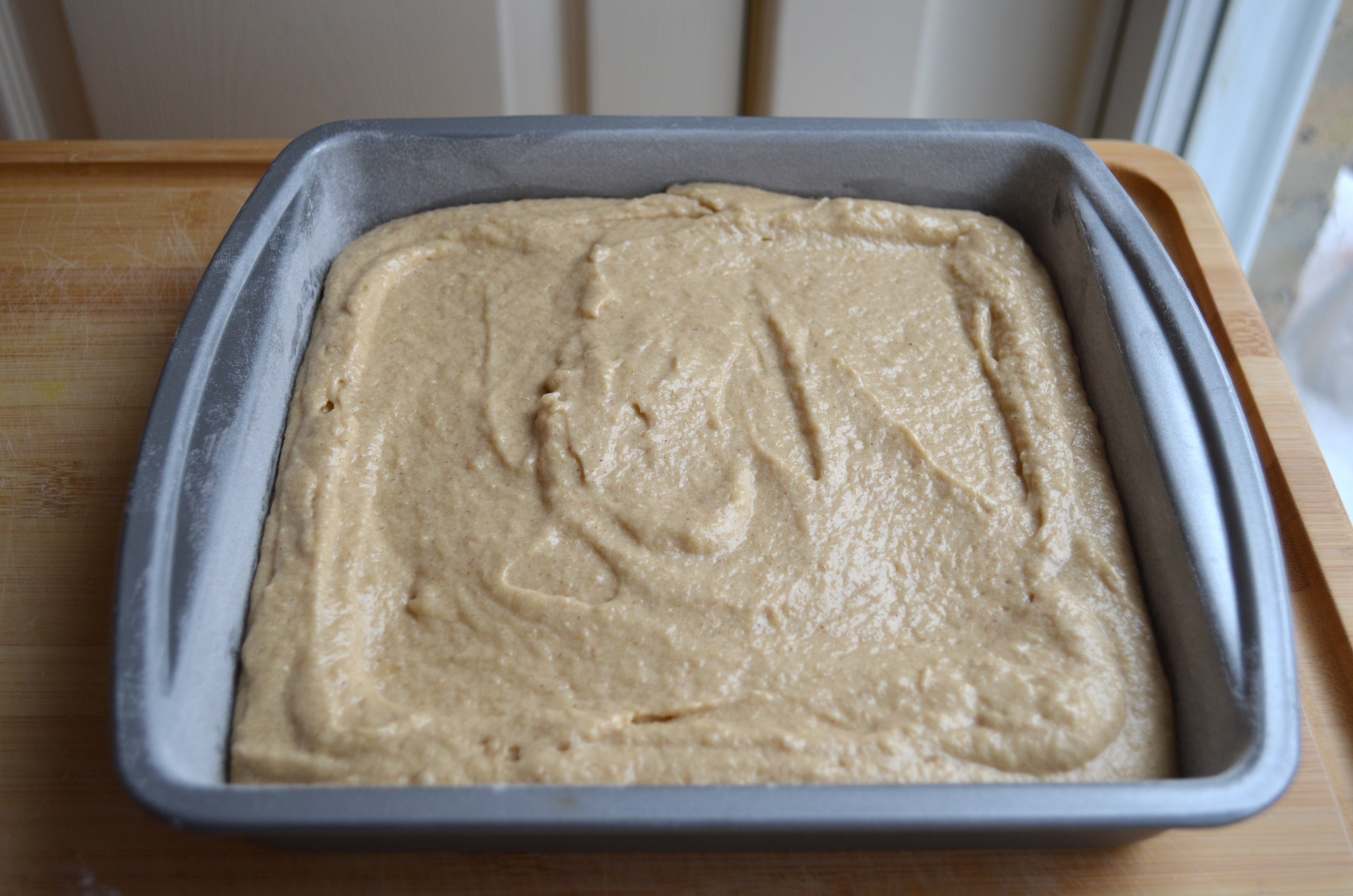 Grease and flour a 8 or 9 inch square cake pan.