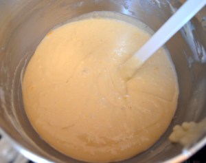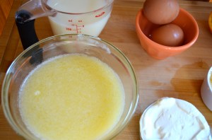 Mix together milk, orange juice, sour cream, eggs and butter in a stand mixer, or by hand with a whisk.