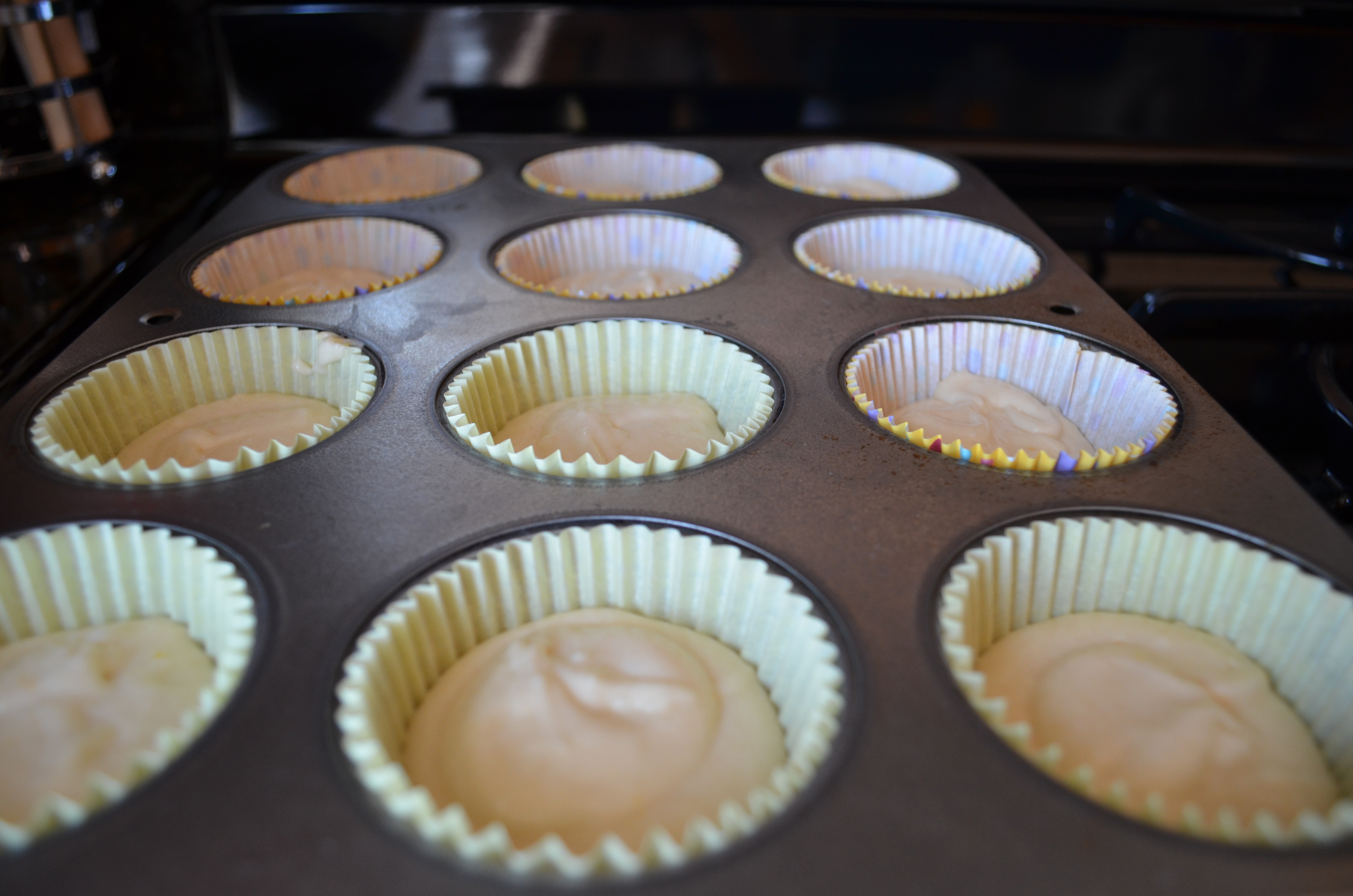 Spoon the batter just to the top of prepared muffin tins and bake for about 25 minutes or until an inserted toothpick comes out clean.