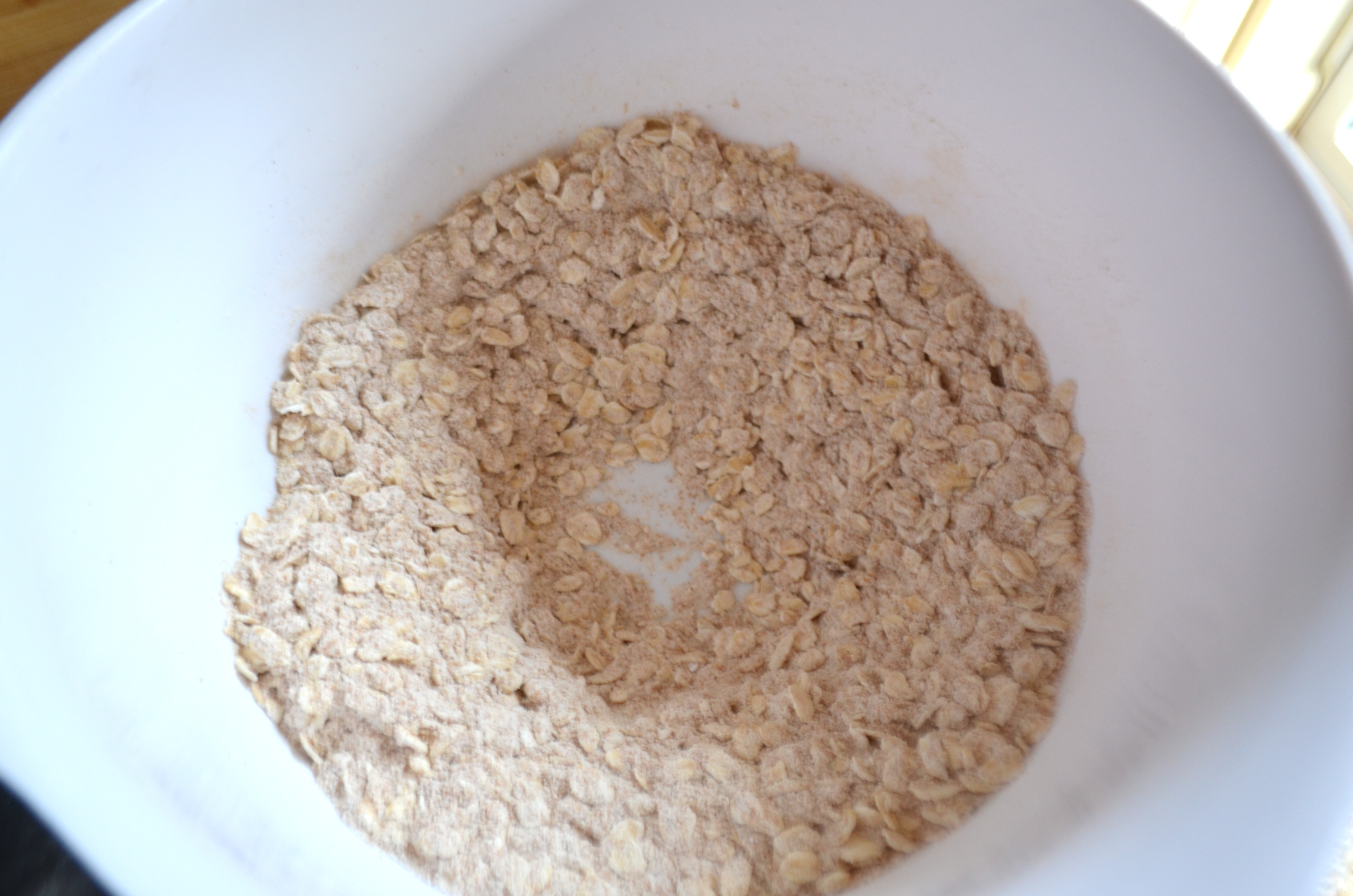 In a large bowl combine oats, flour, baking powder, baking soda, salt and cinnamon. Set aside