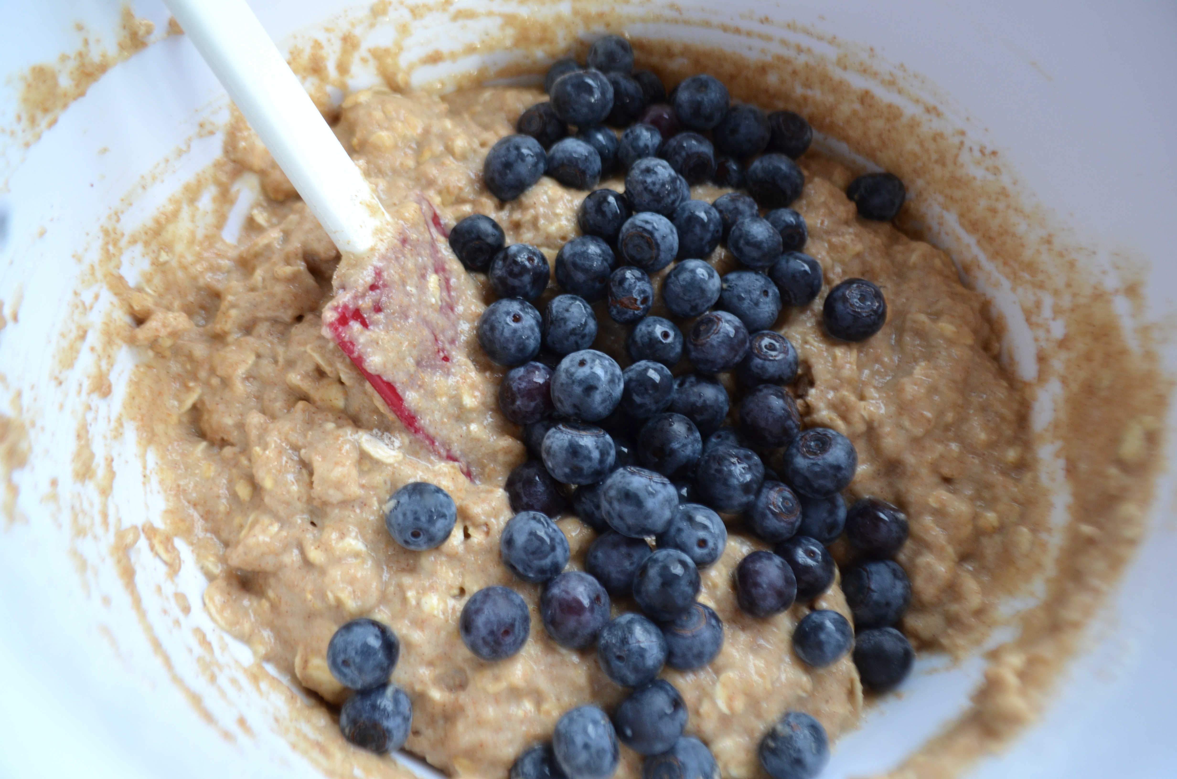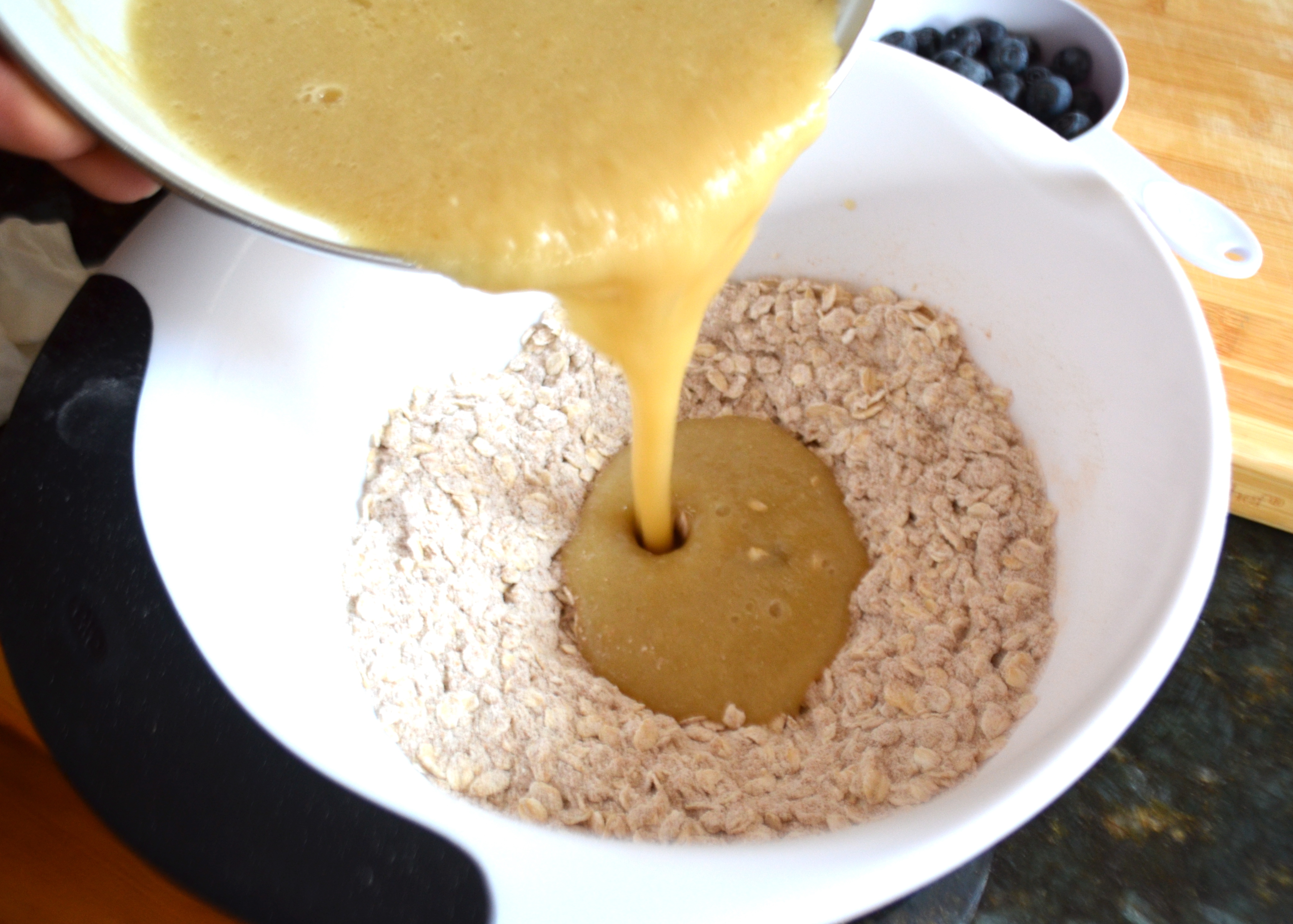 Once the liquid ingredients are combined, make a well in the center of the oat mixture and pour the liquid into the center. Gently fold the ingredients together until just incorporated. Stir in blueberries and fill muffin tins nearly to the top.