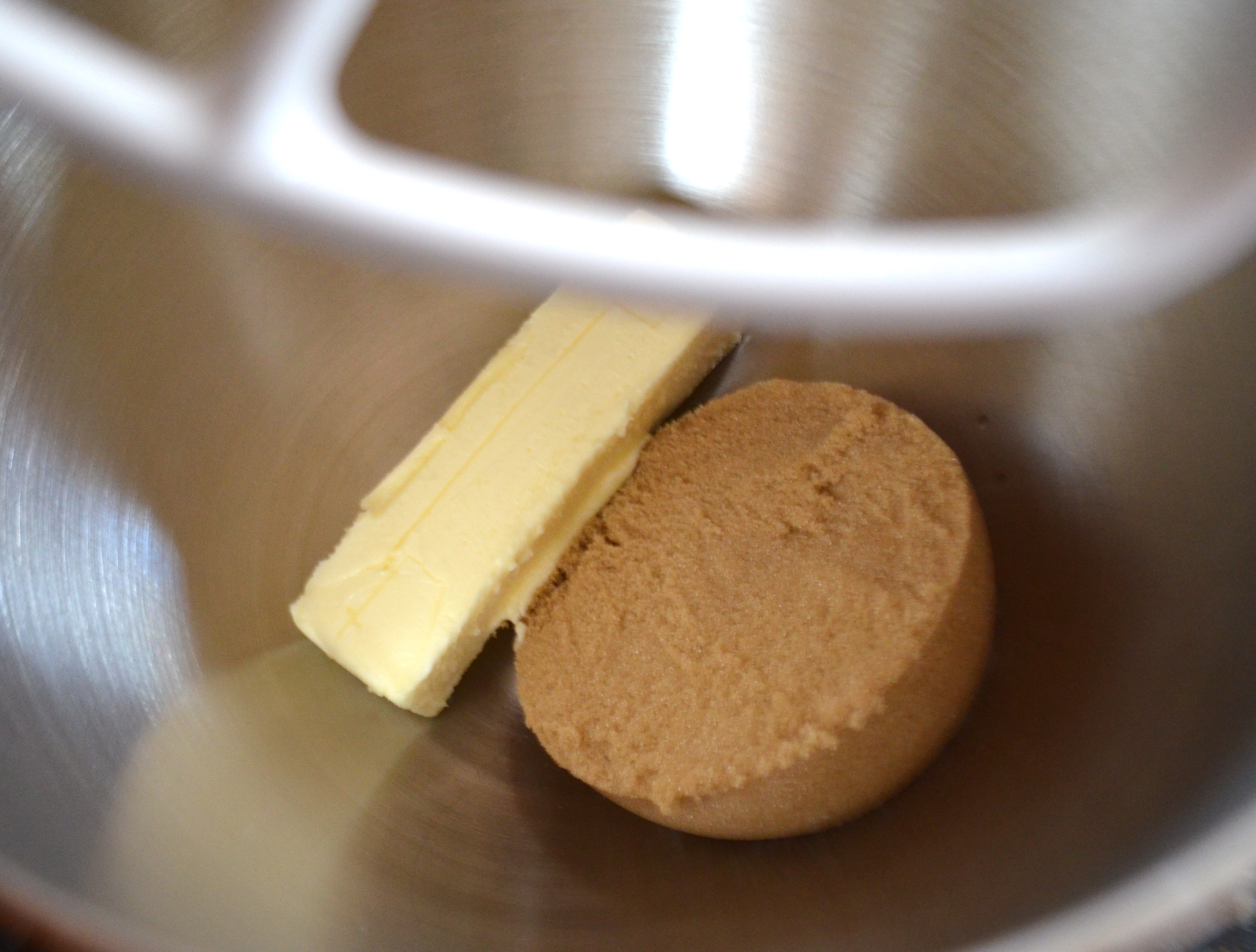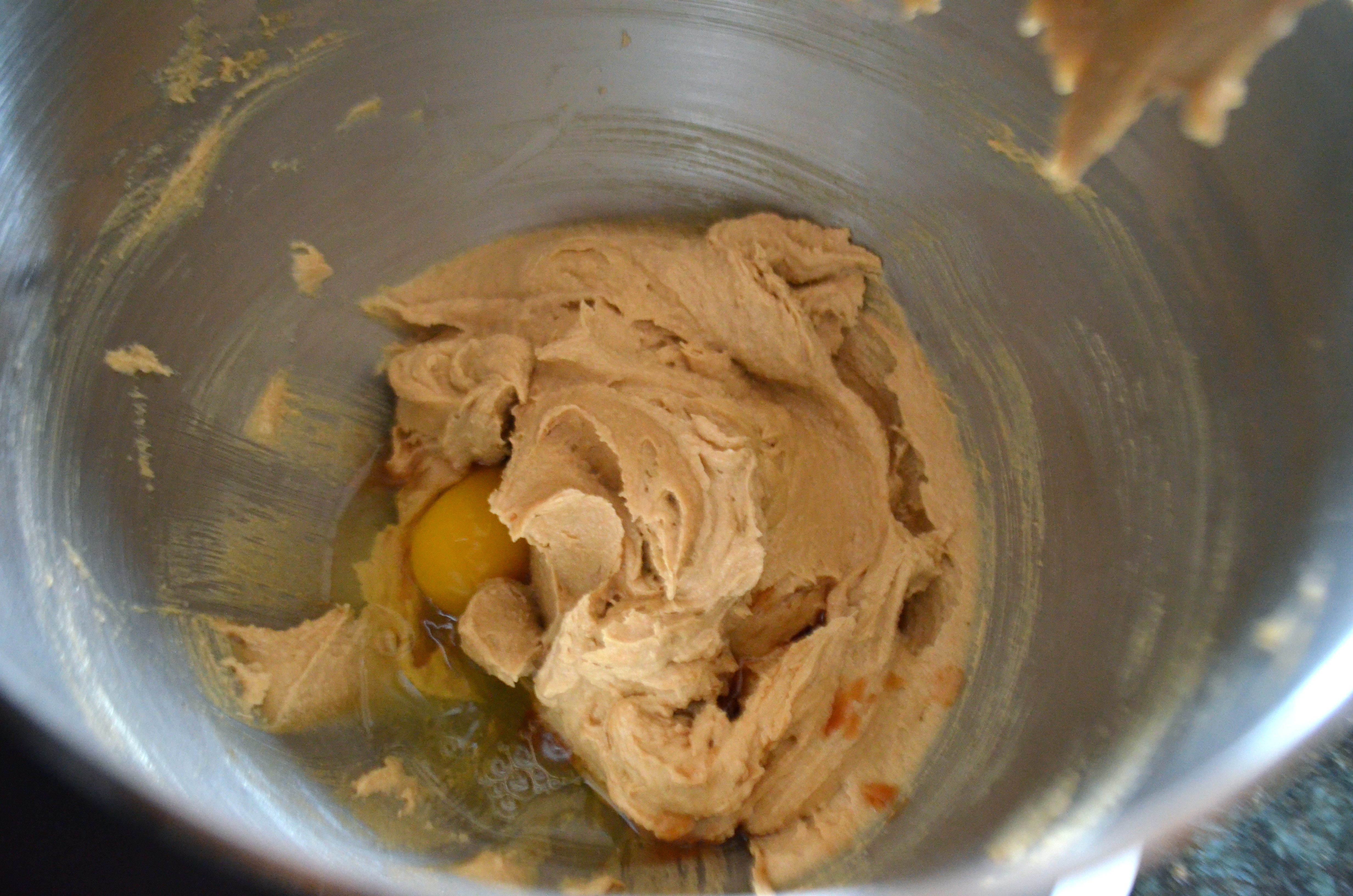 In the bowl of a mixer, cream together the butter, sugar and peanut butter.