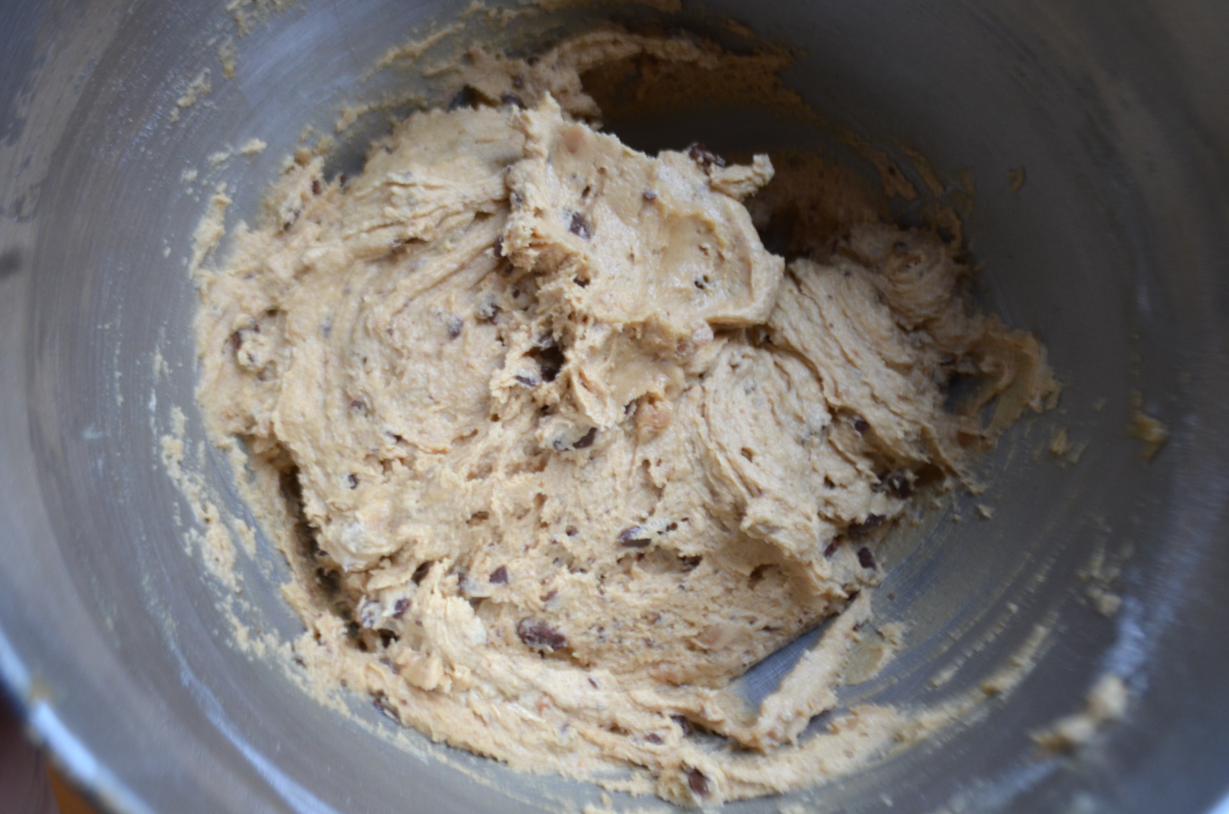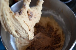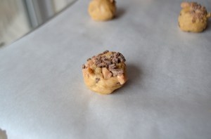 Once you roll the dough into balls, you dip them in the reserved toffee bits!