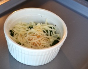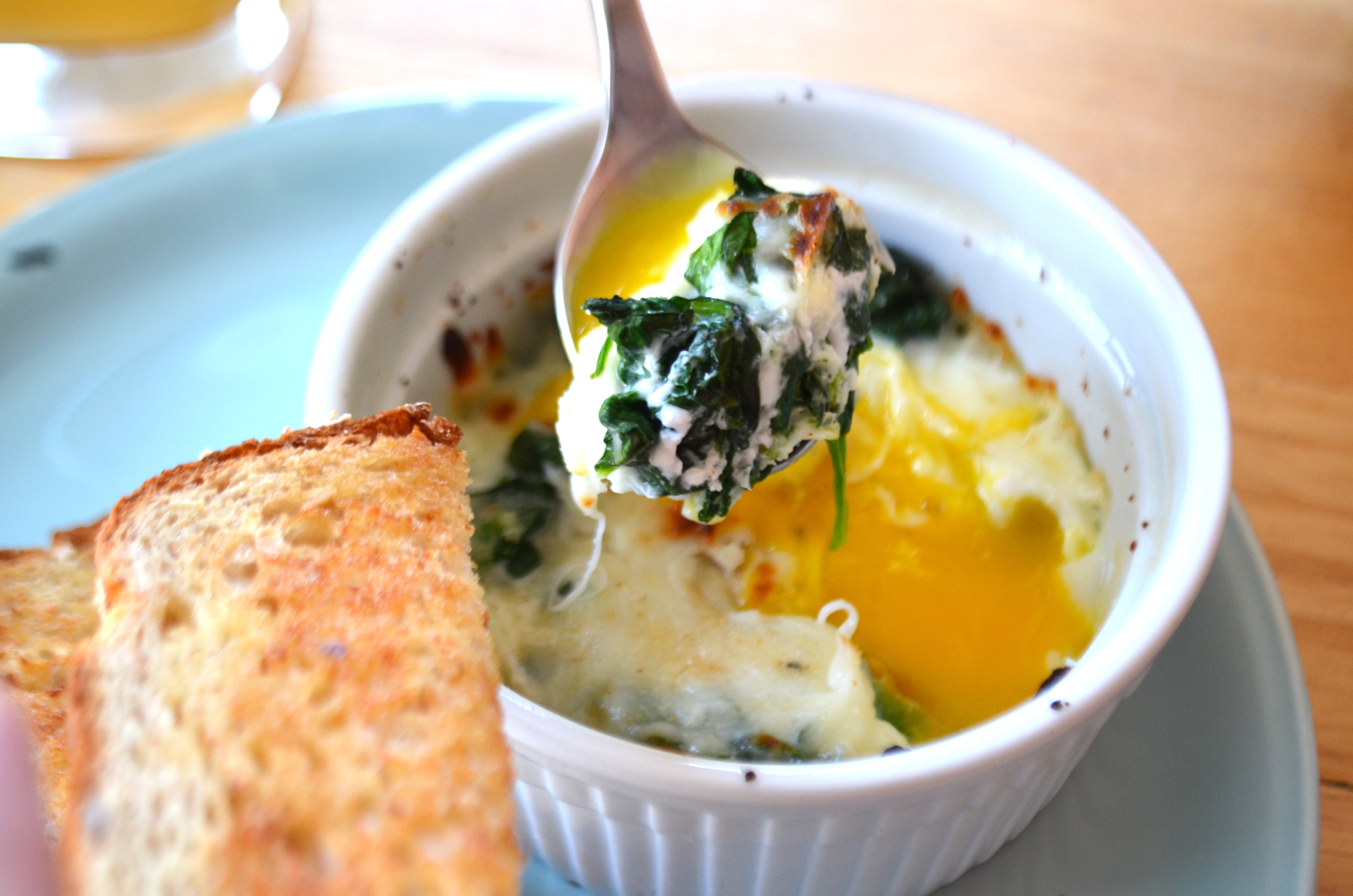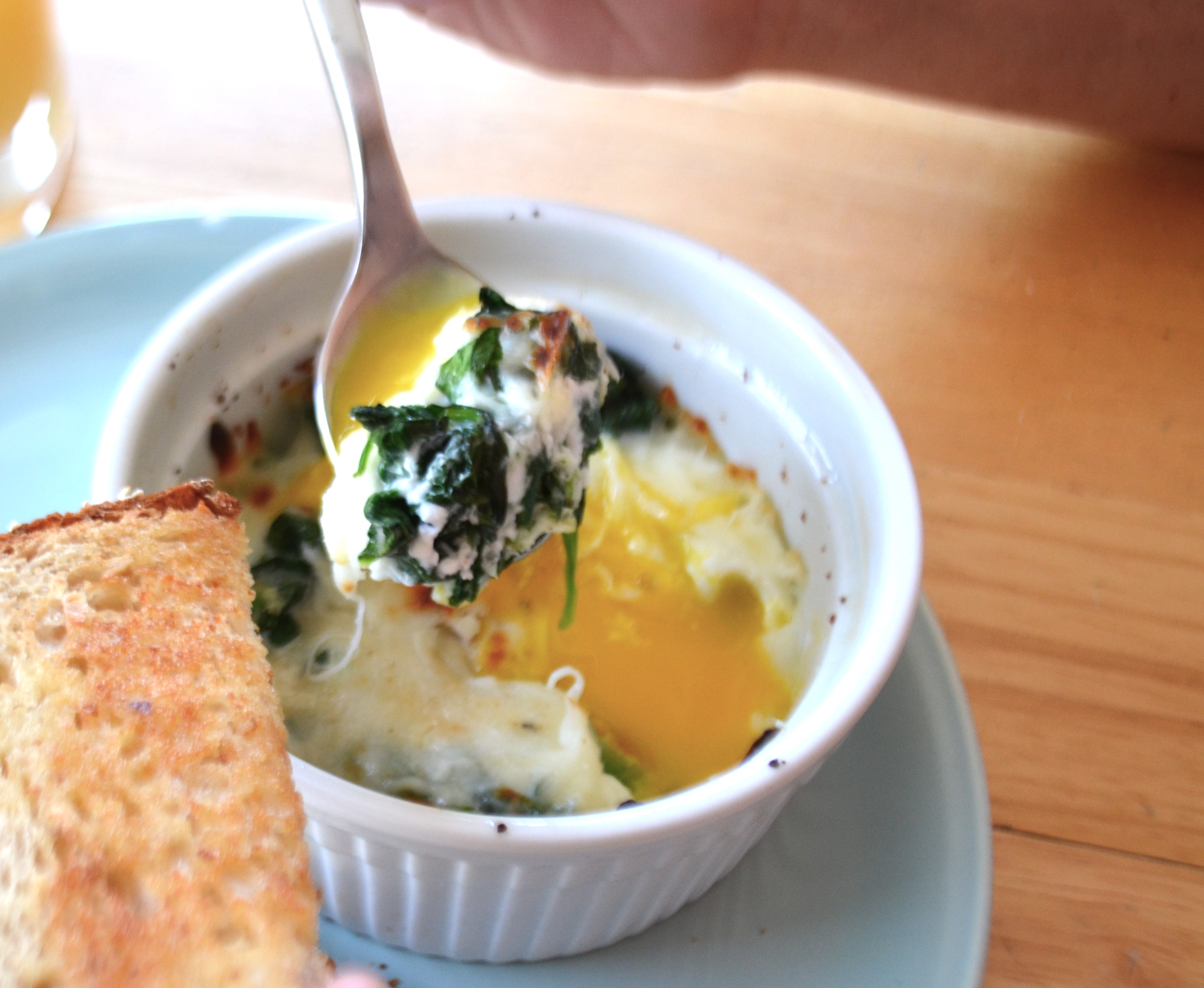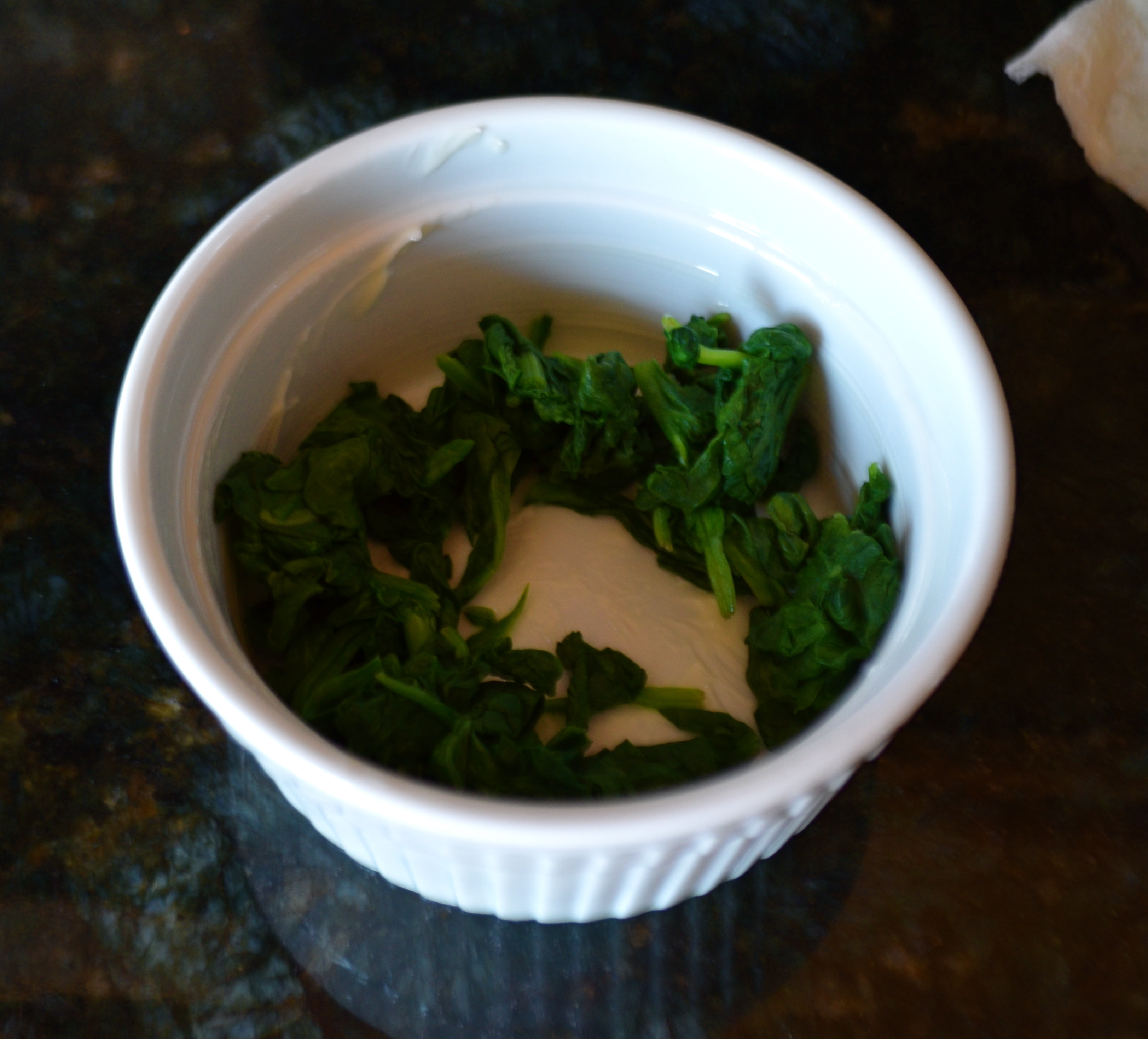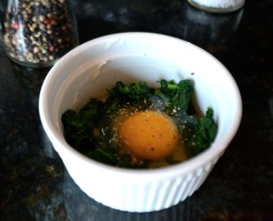 Place spinach and garlic around the bottom of the ramekin, making a well in the center.
