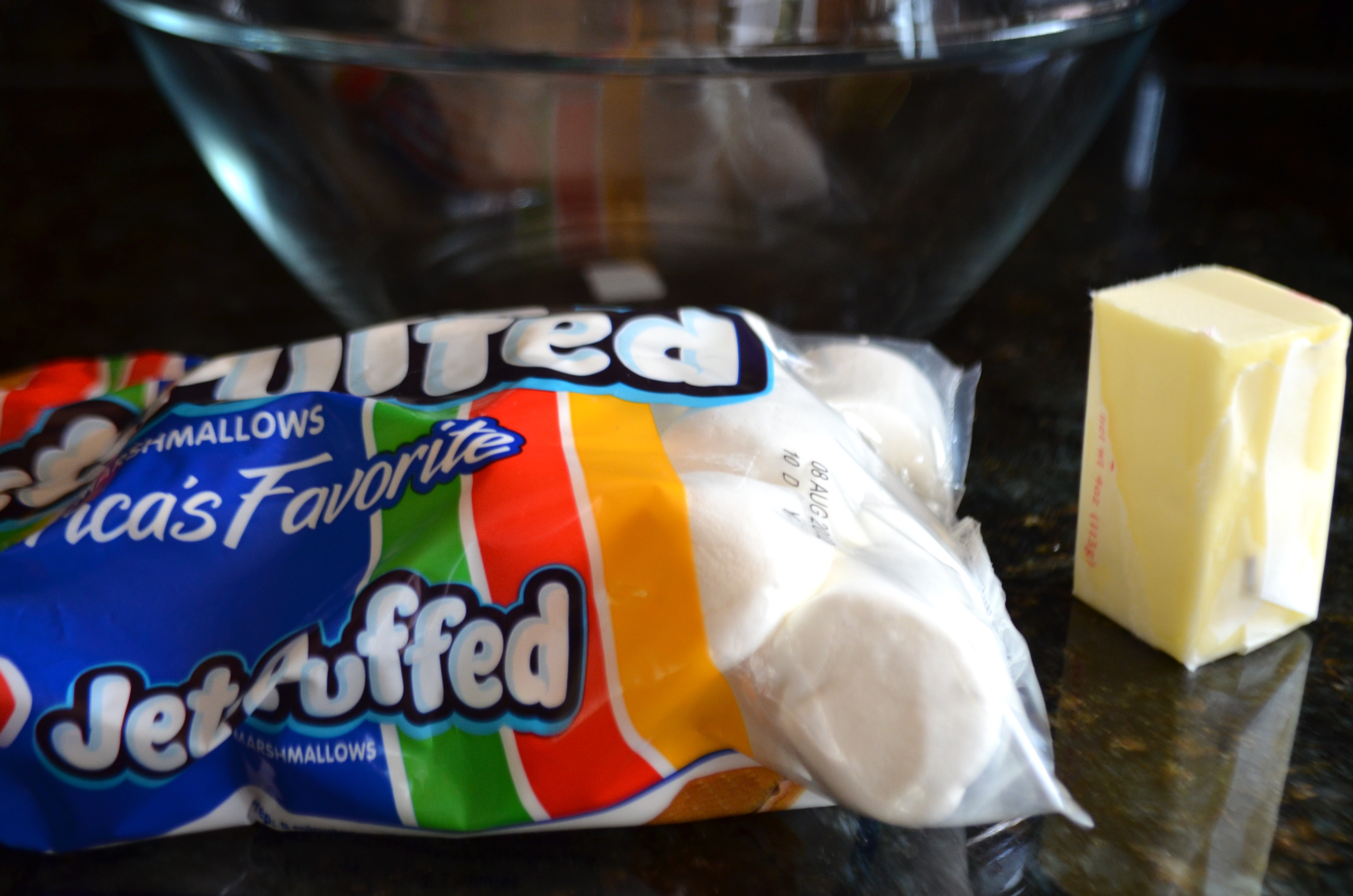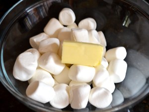 In a large, microwaveable bowl, melt 1/4 cup butter and one bag of marshmallows (in the microwave).