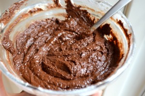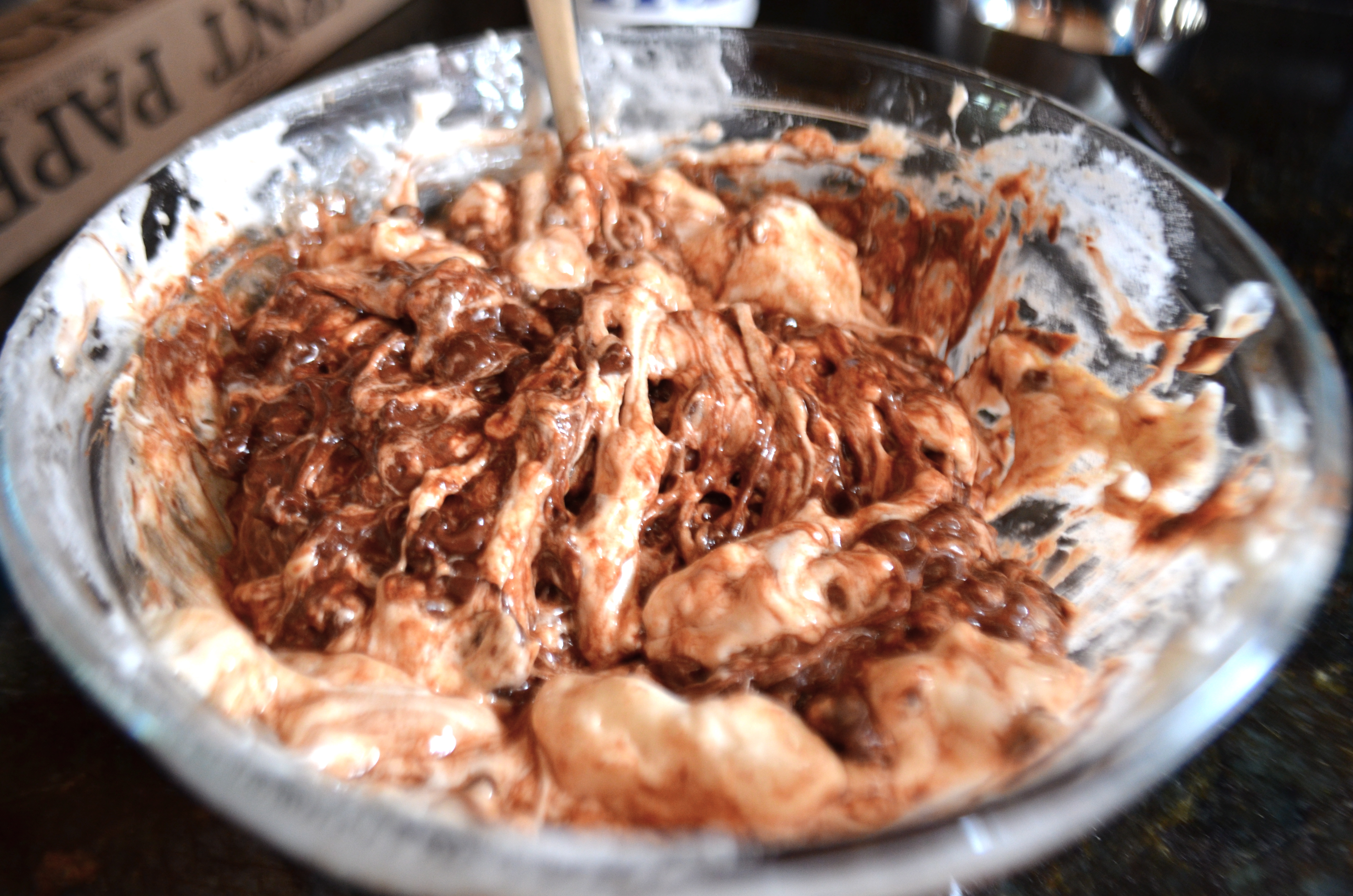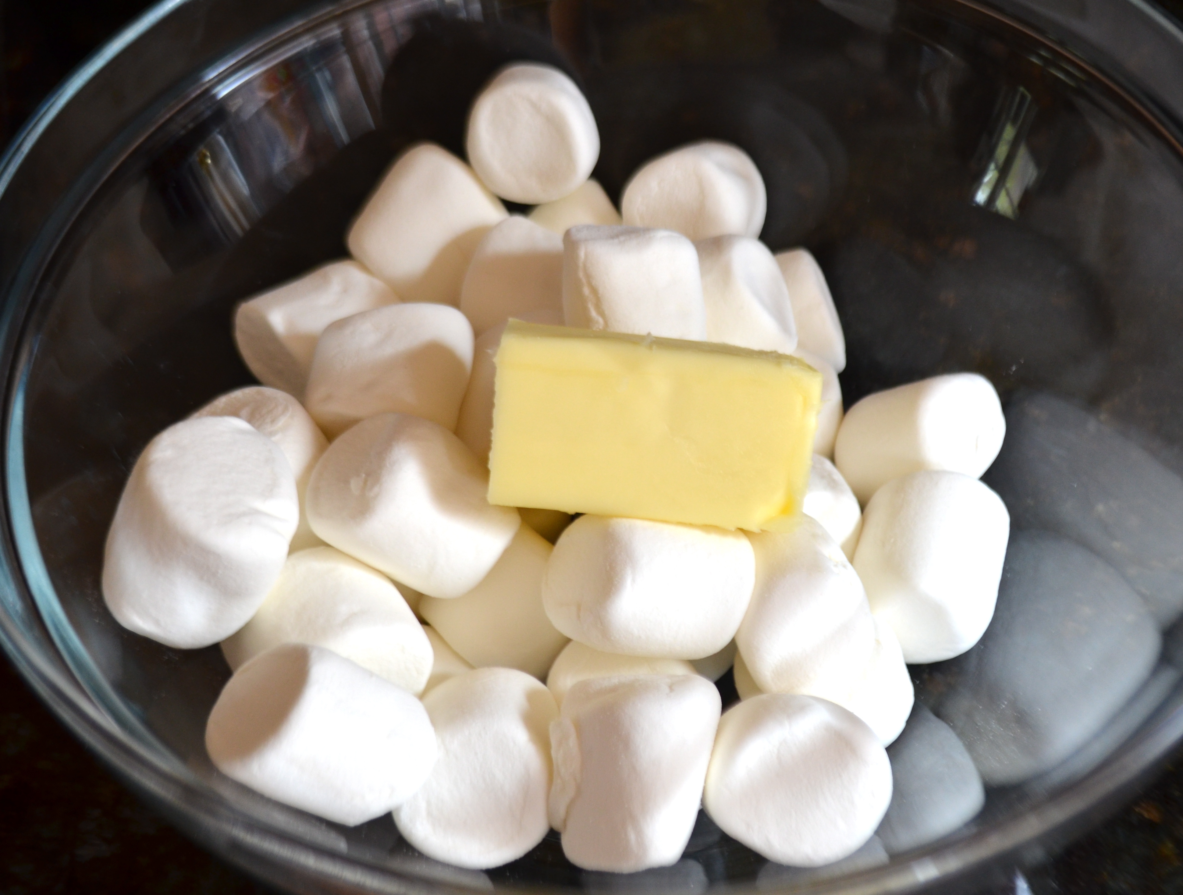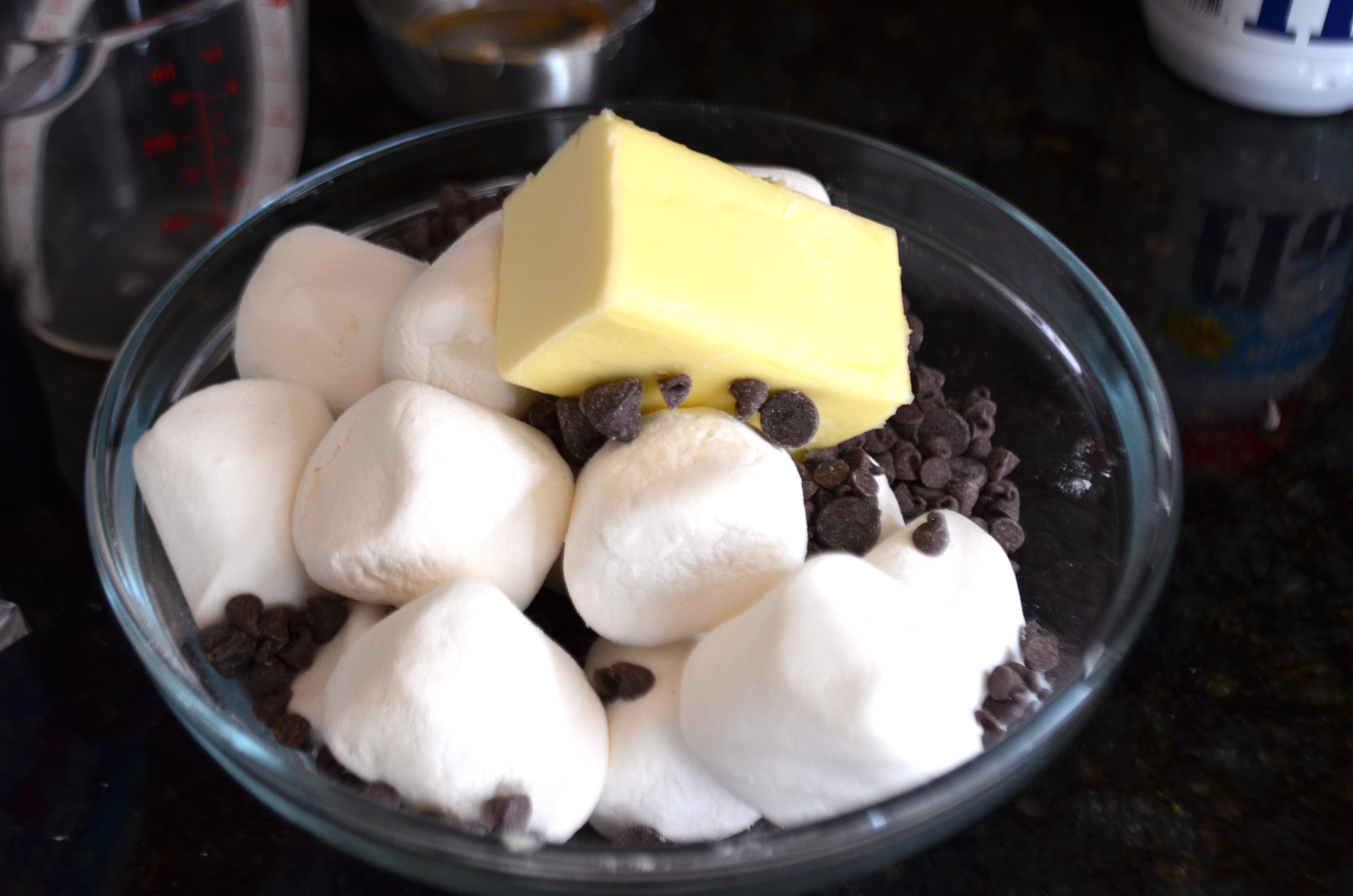 In a smaller bowl, combine 1/4 cup butter, bag of chocolate chips and 13 large marshmallows. Again I used the microwave to slowly melt the chocolate in 20 second increments.