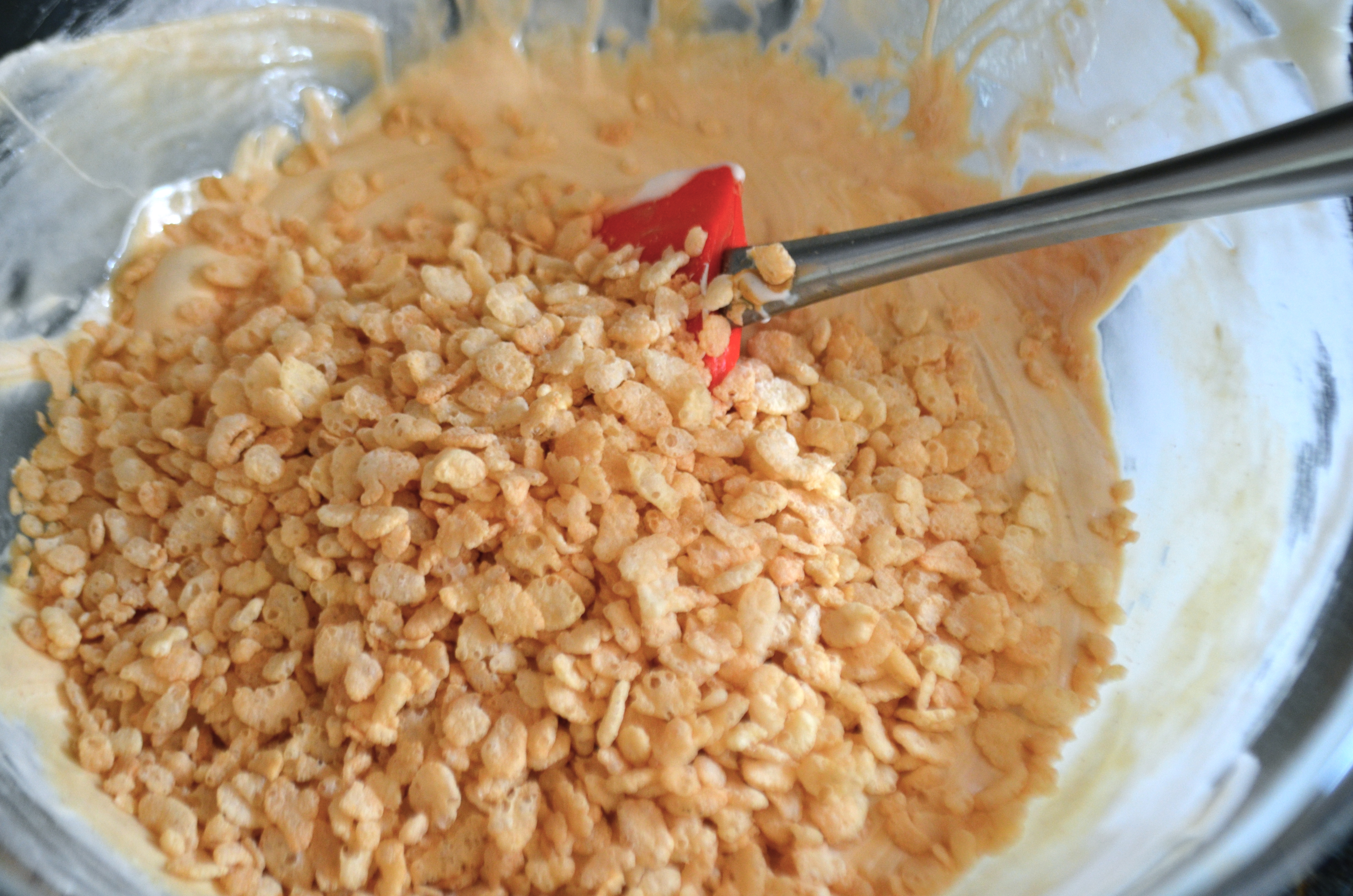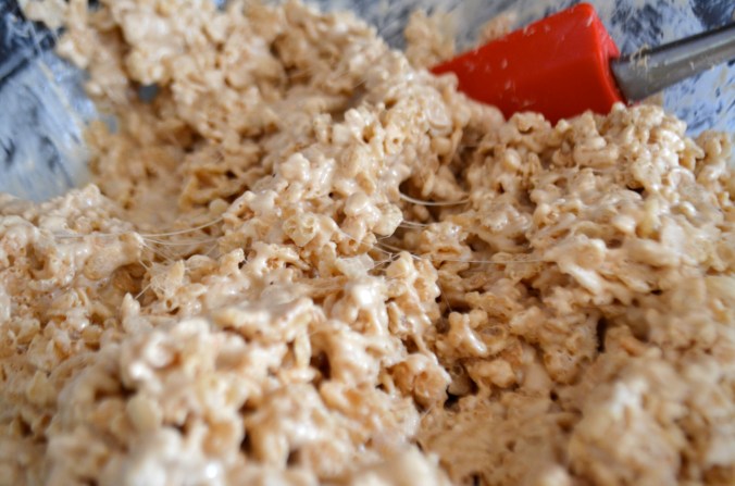 Add rice krispies and stir until fully coated in marshmallow mixture.